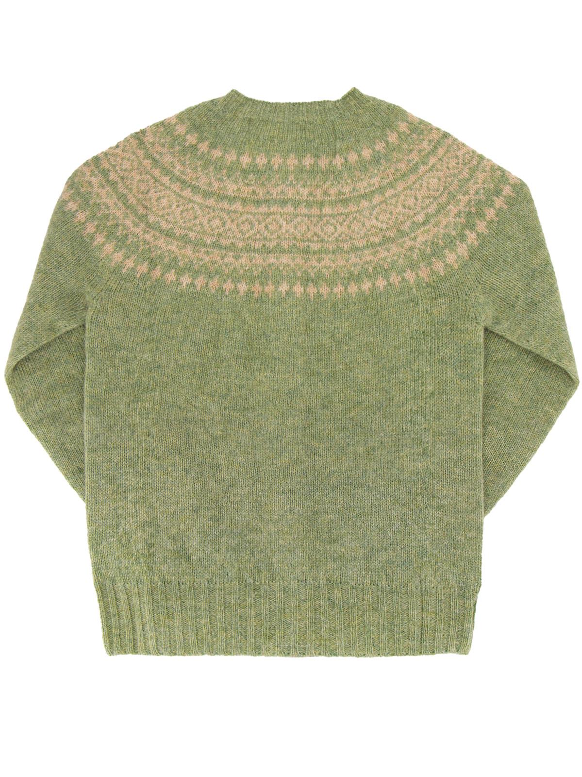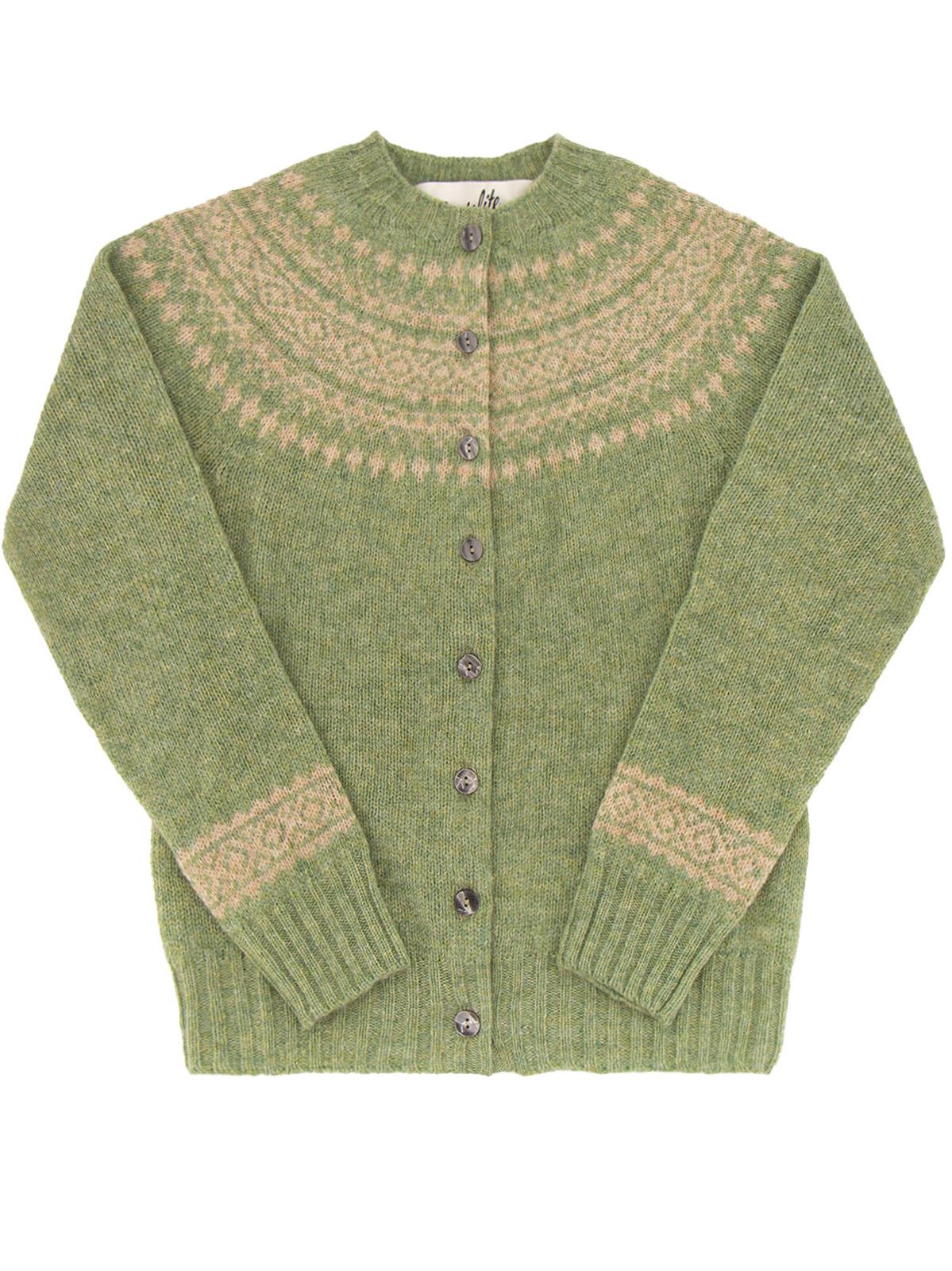An authentic 1940s-style cardigan in a soft green hue with cream accents in a Fairisle pattern. Our Socialite Scottish knitwear items are all handcrafted using traditional knitting techniques, making them a perfect choice for lovers of vintage fashion from the 1940s and 1950s.