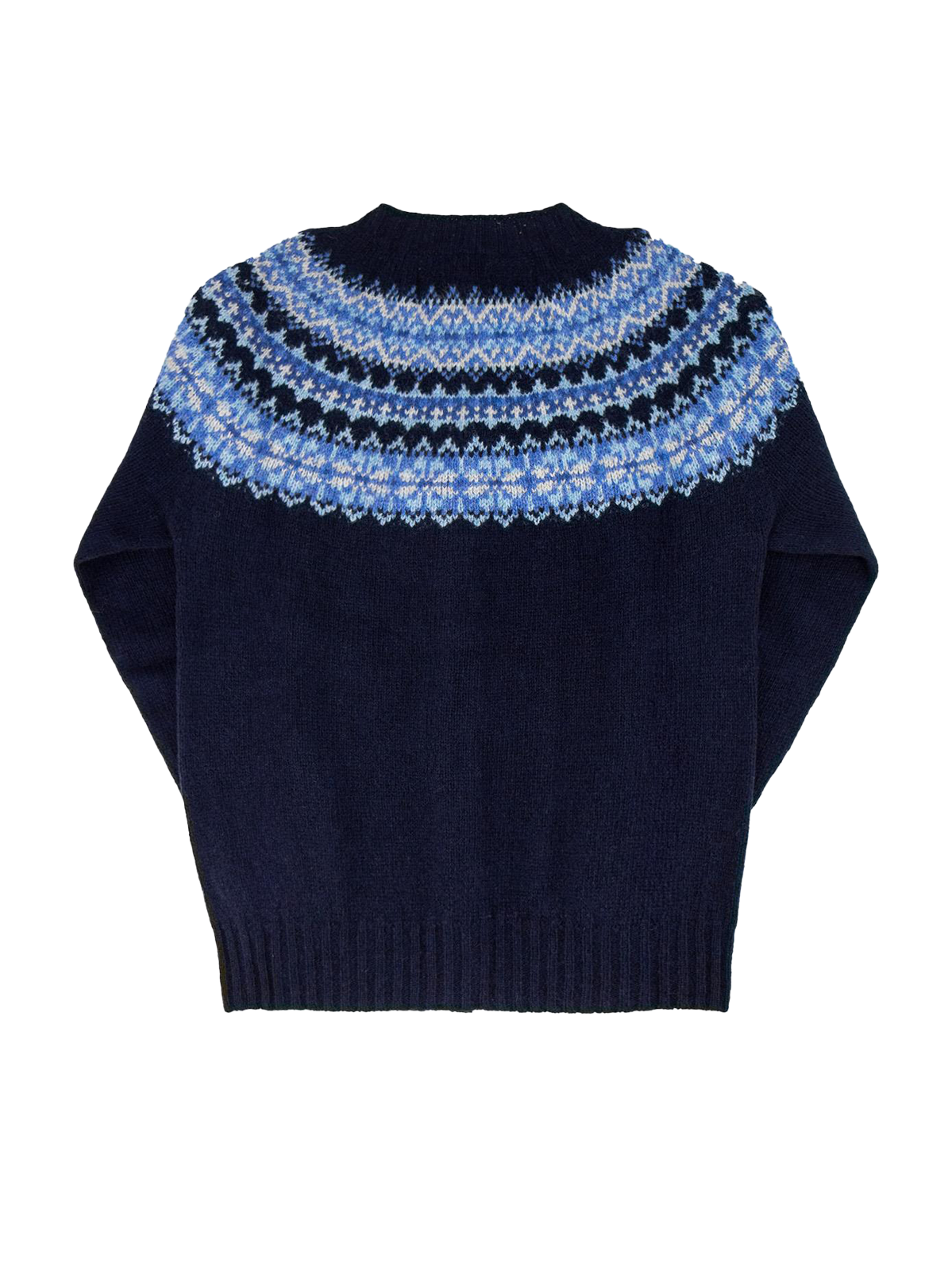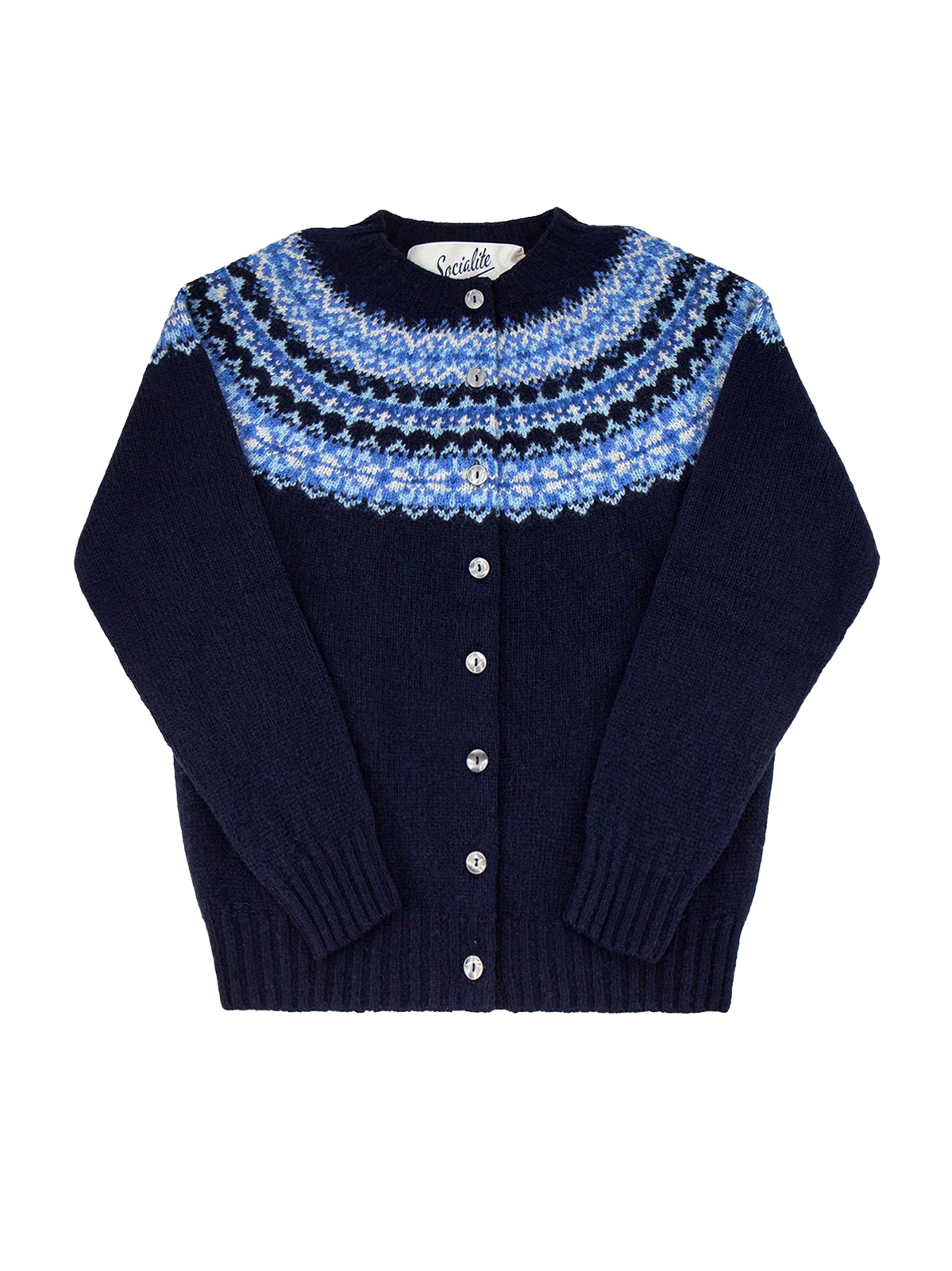 A luxurious 1940s-style cardigan in a rich navy blue shade with lighter blue highlights in its Fairisle design. Our Socialite Scottish knitwear pieces are meticulously handcrafted using traditional knitting methods, meaning that they'll keep you cosy and last a long time with proper care.