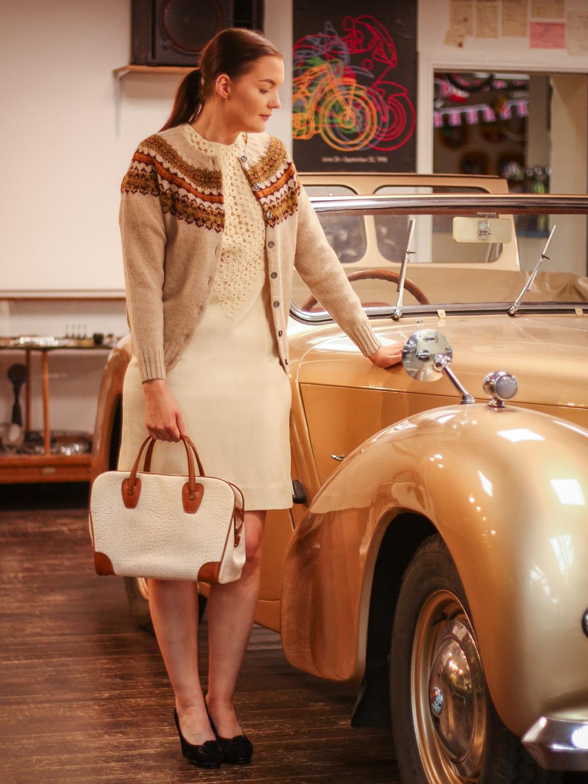 Authentic forties look cardigan in a neutral beige or cream shade, with green, orange and brown highlights in its Fairisle pattern. Handmade in a traditional knitting method which takes its inspiration from forties and fifties fashion, with deep welts and pearl buttons.