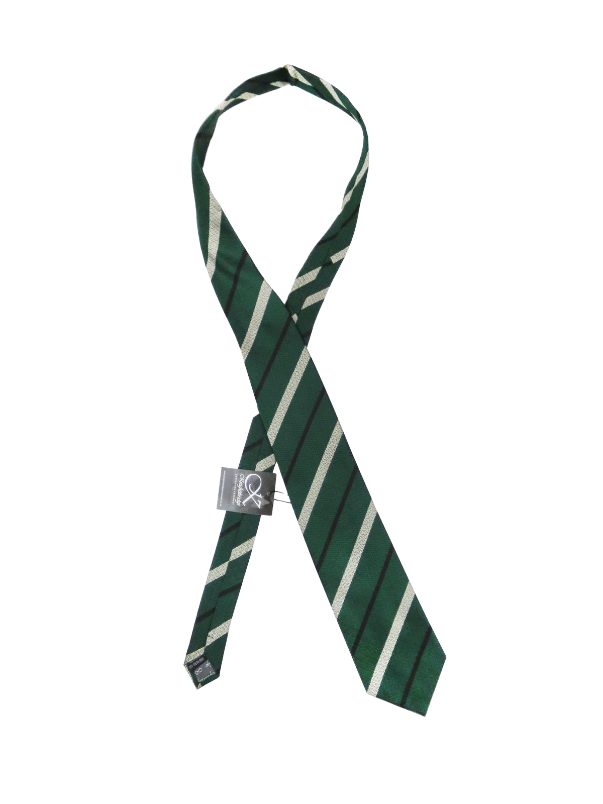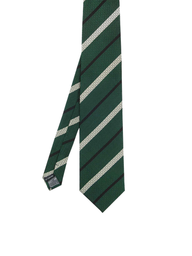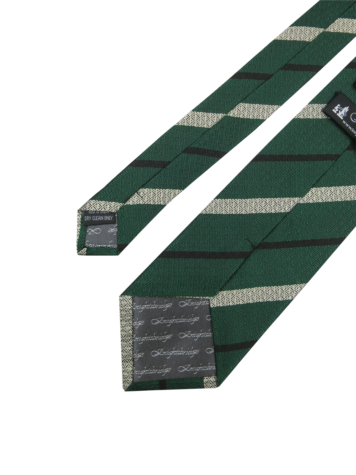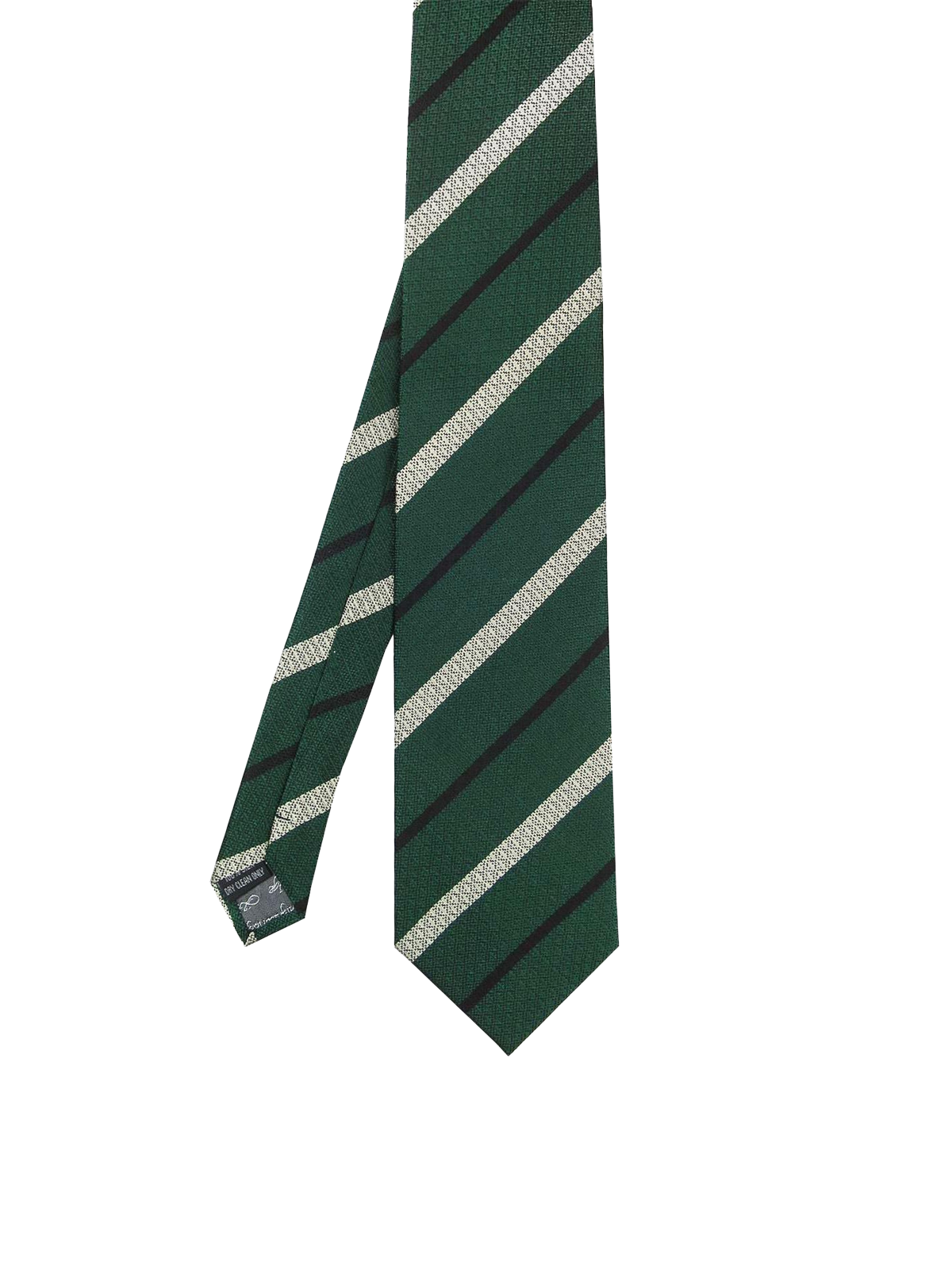 A high quality handmade 1940s style club tie featuring a refined fancy weave in green, black, and white stripes. This elegant forties inspired design adds timeless sophistication to any vintage or formal outfit.