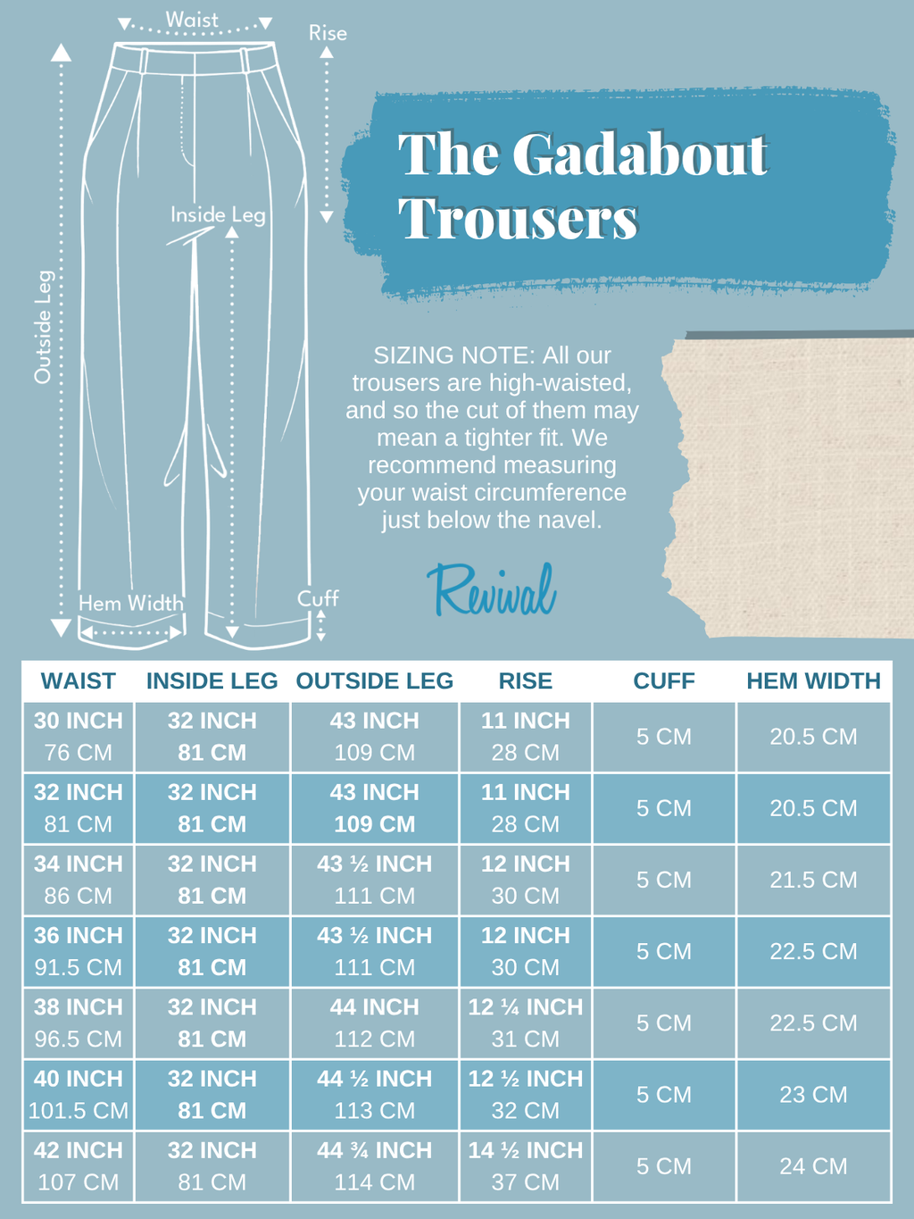All our trousers are high-waisted, so the cut may feel tighter. We recommend measuring your waist circumference just below the navel.