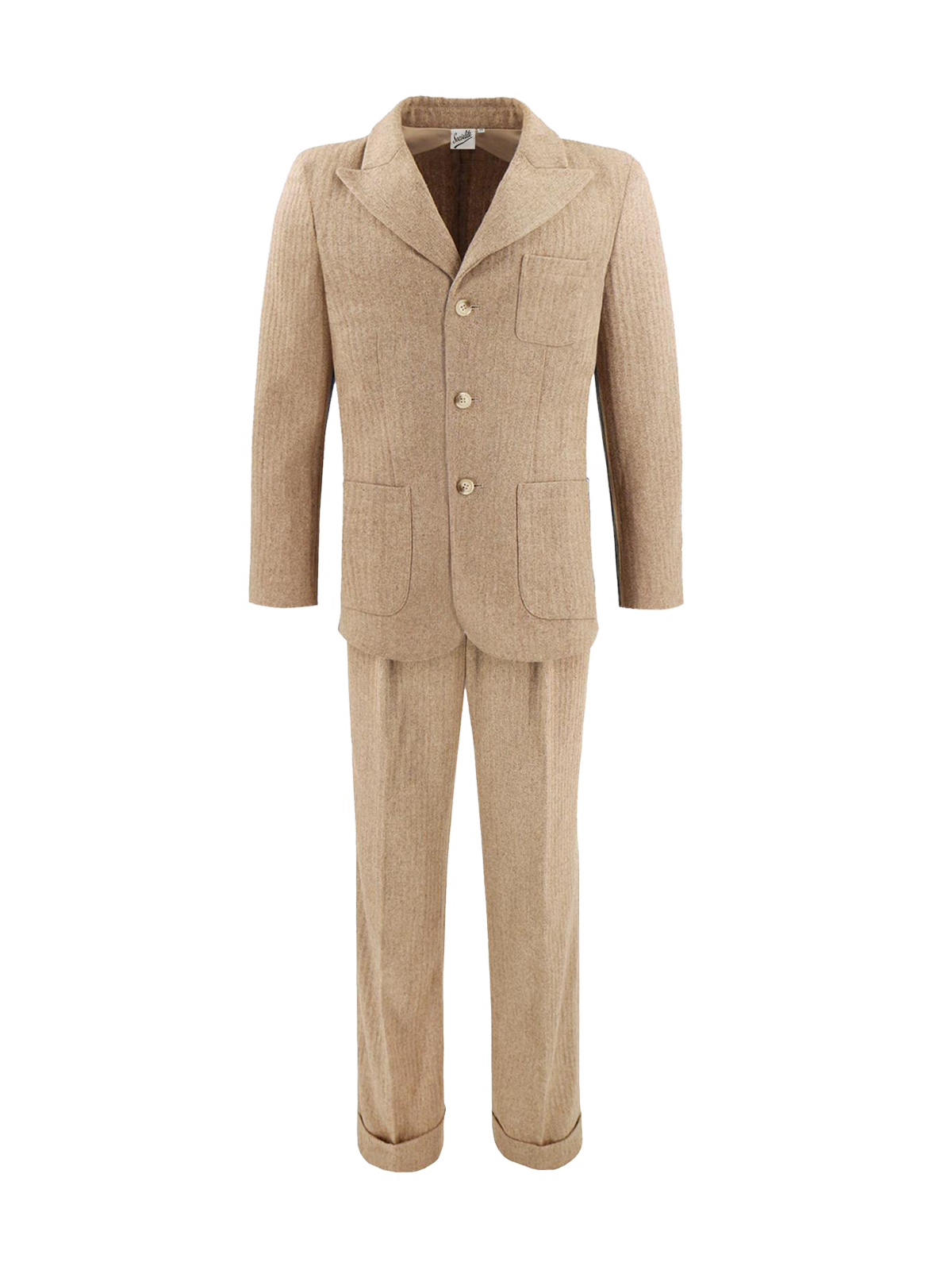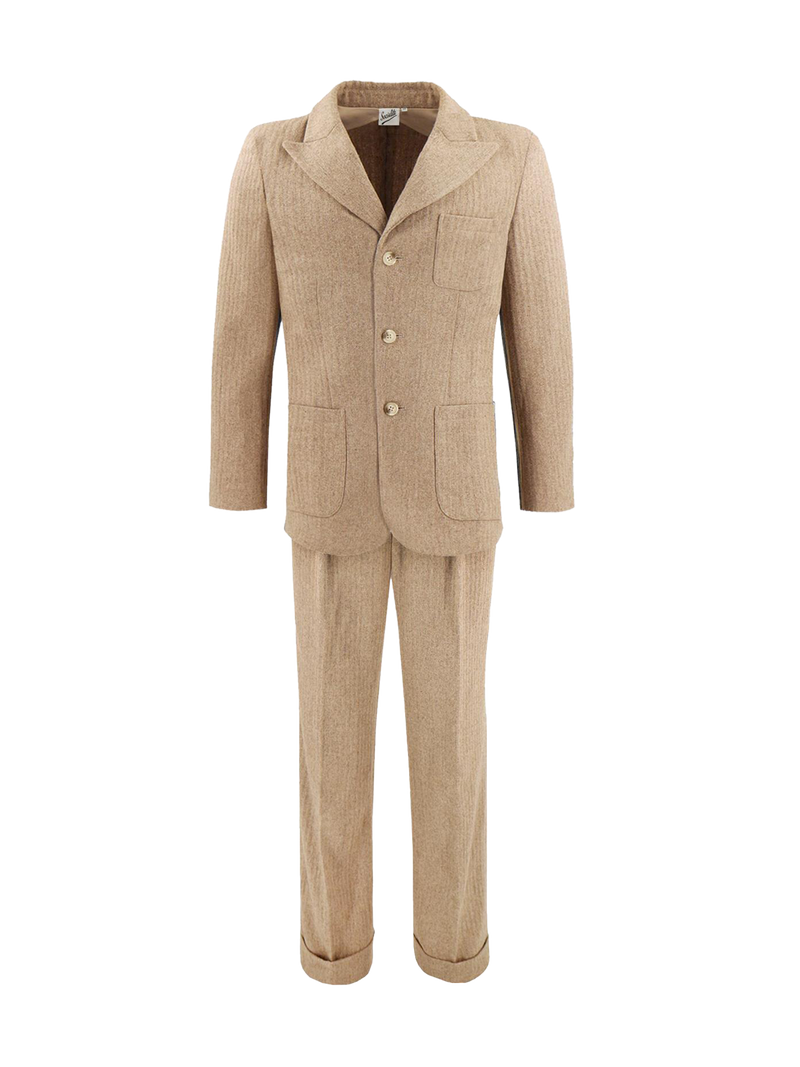 The jacket has three patch pockets and broad peak lapels, the coordinating trousers have an authentic high waist fit and fishtail back detail.