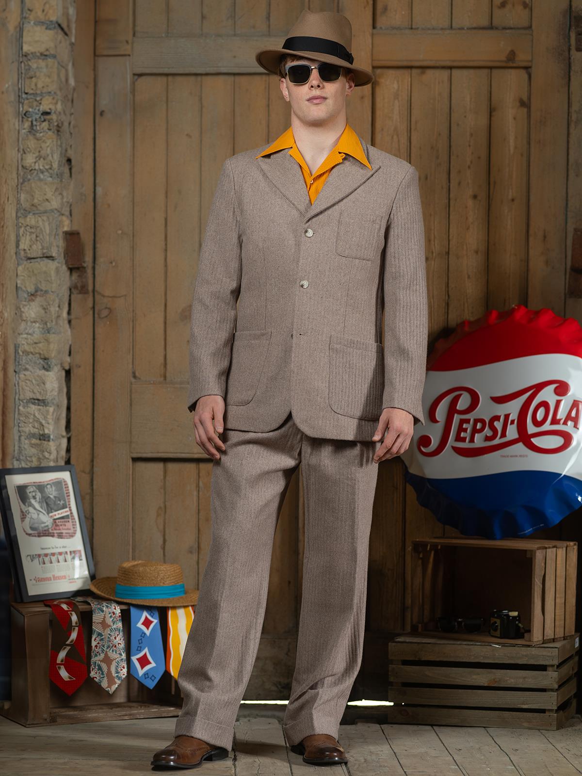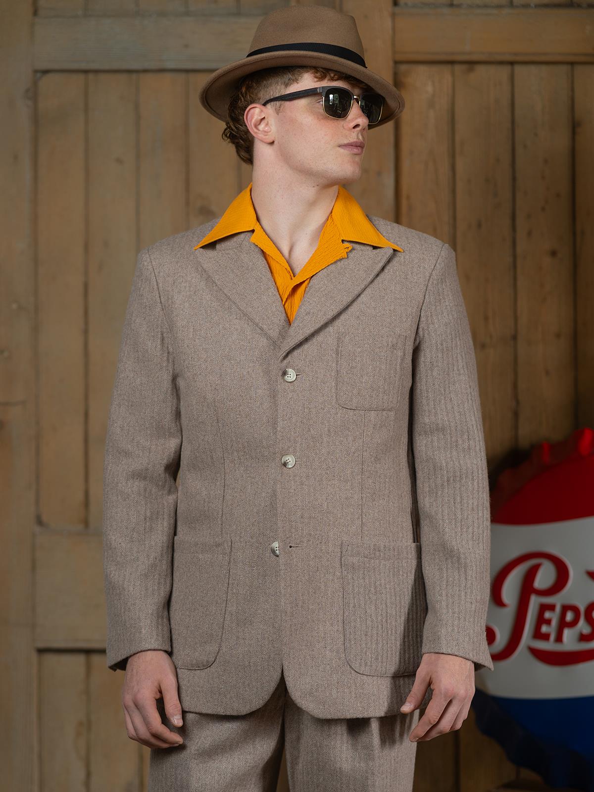 The Gallivant is our new wool blend 1930s 40s style suit, with classic tropical styling. This handsome suit is a high-quality vintage-style two-piece ensemble from our premium Socialite label. Both the jacket and trousers are realised in a versatile faint stripe neutral beige woven cloth that allows both pieces to be worn independently.