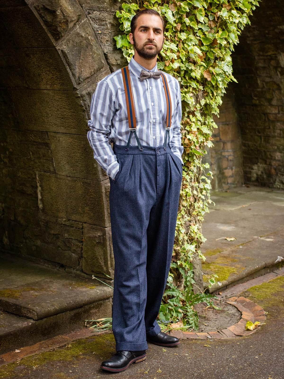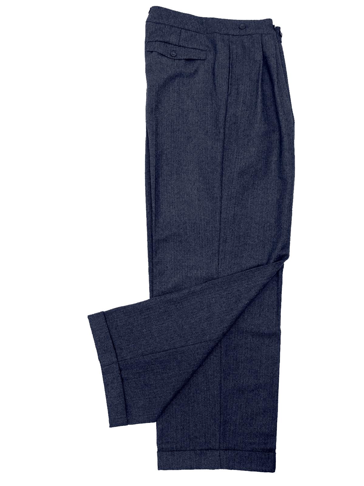 Period accurate high waist men's bag trousers in a high-quality soft dark blue flecked herringbone cloth.
