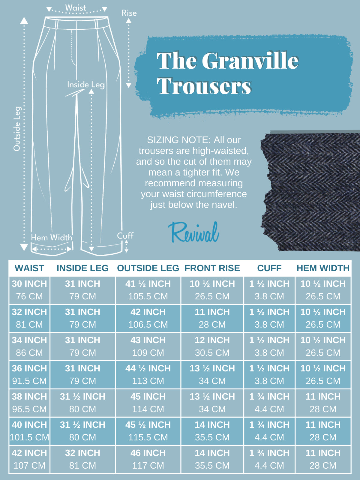 The Granville trousers are a baggy style designed to fit high on the waist. We recommend ordering your usual modern trouser size as the Granvilles already have an allowance for comfort ease.