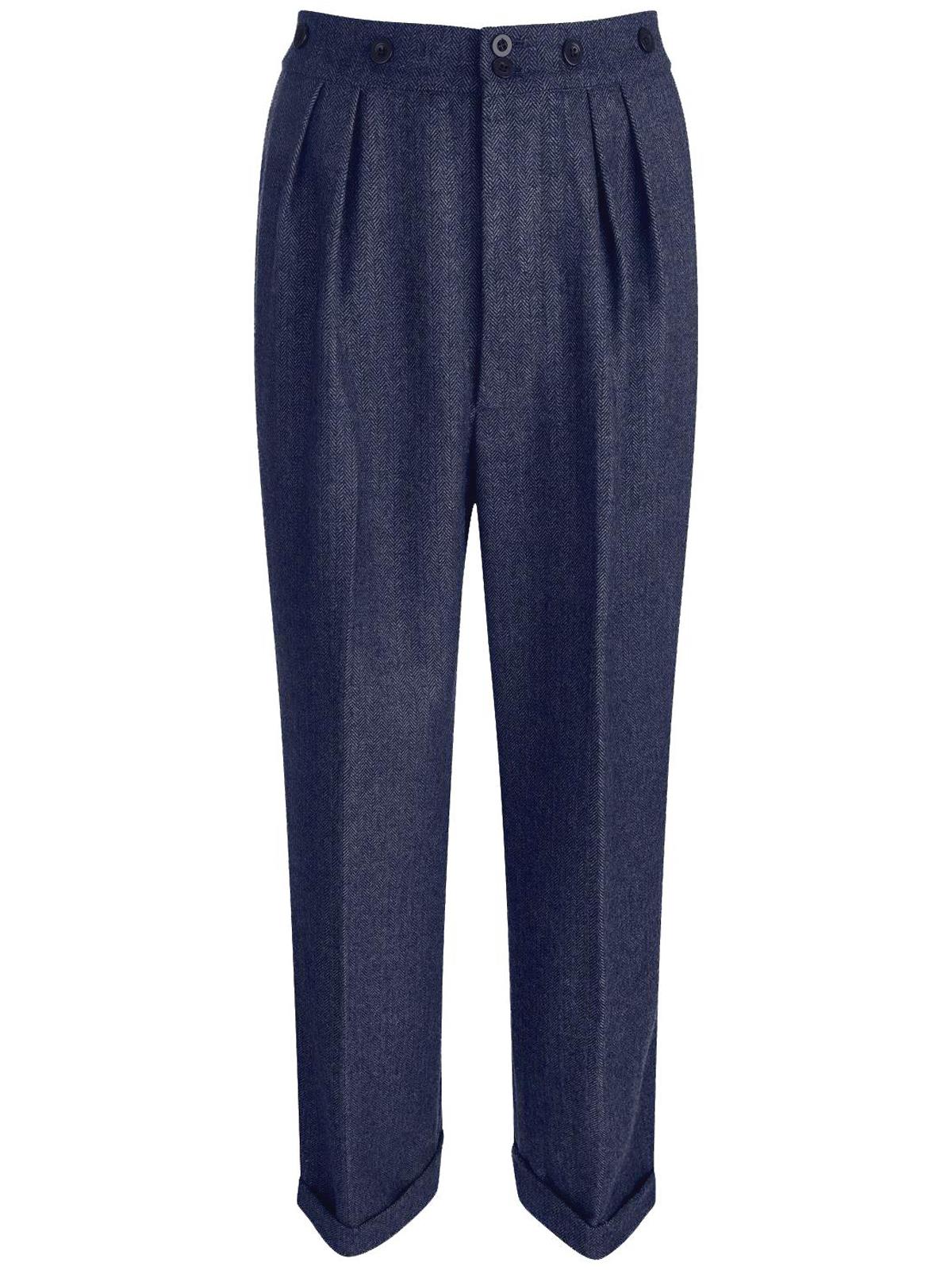 1940s Vintage Granville Herringbone Wool Bag Trousers in Navy Blue