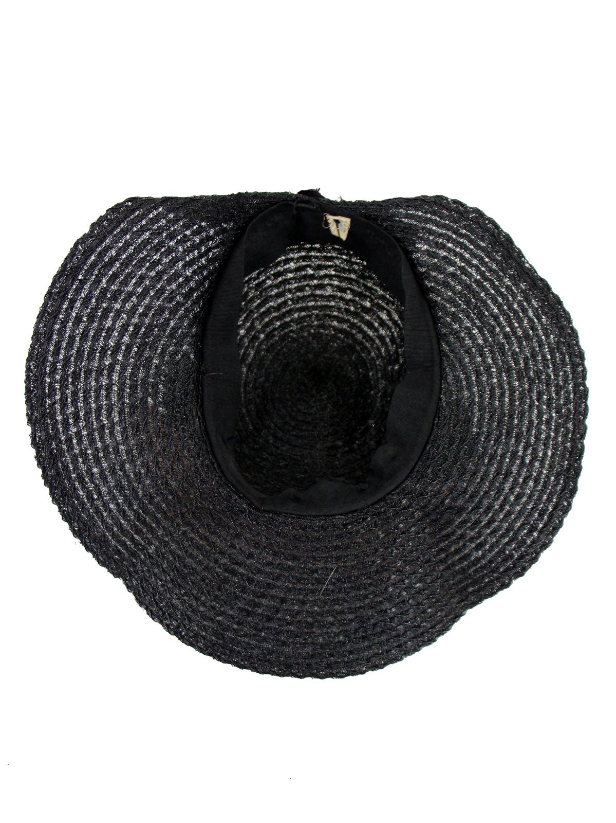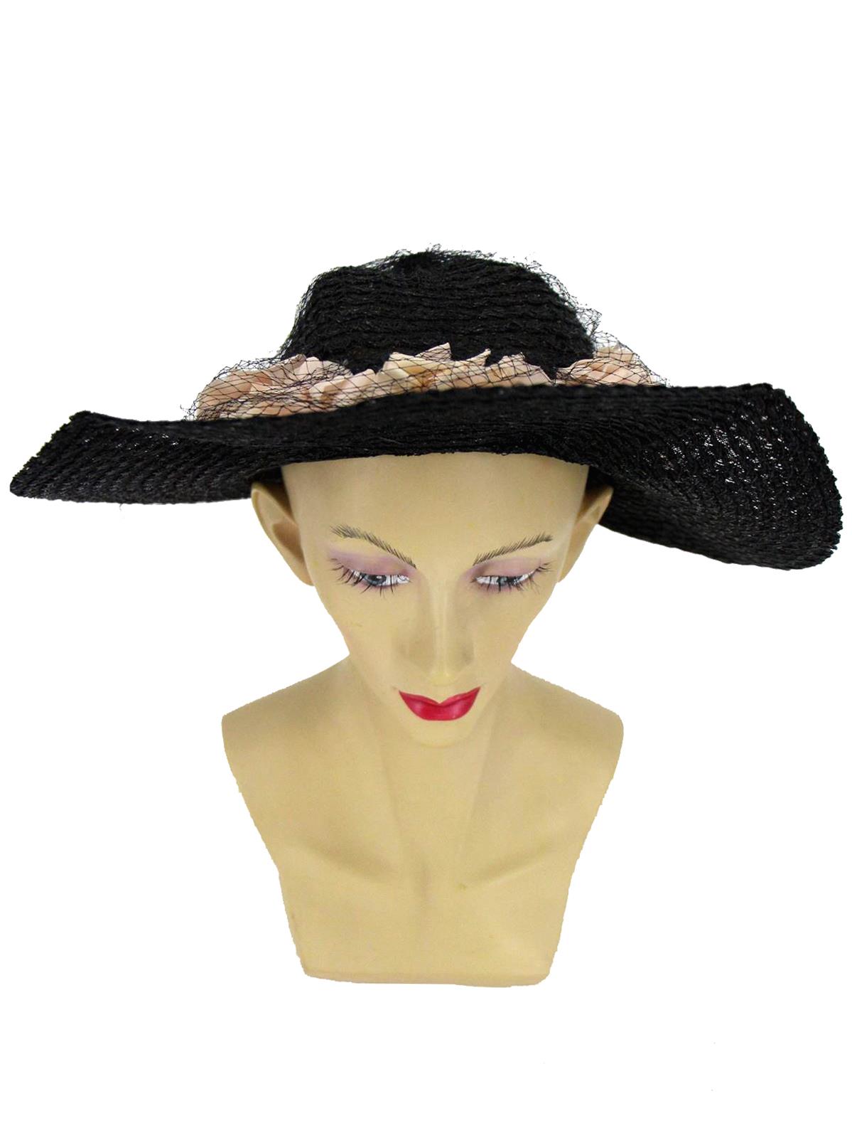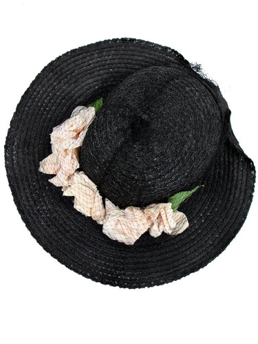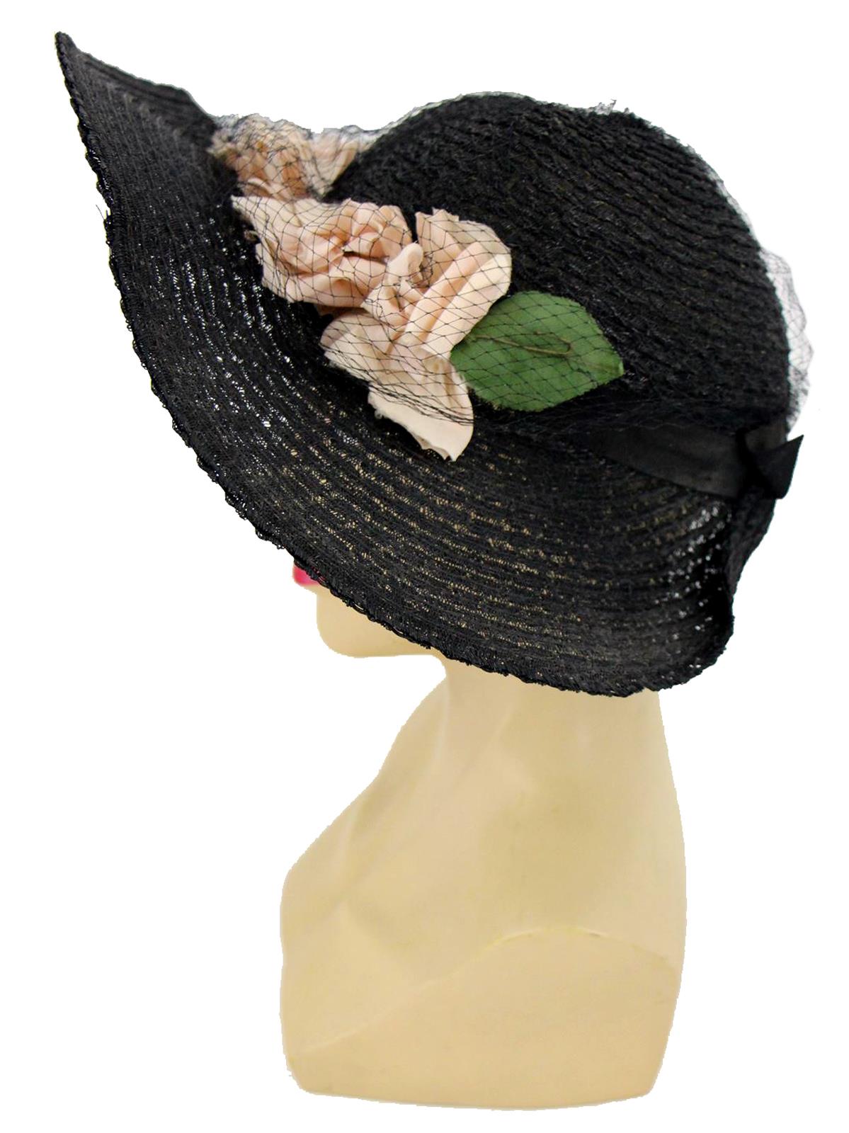The hat is a semi-sheer woven fabric, with the back folded toward the thick grosgrain hat band to create the halo shape. The hat is also decorated with a row of blush pink faux roses and leaves, as well as a swathe of black netting, making for a very glamorous piece.