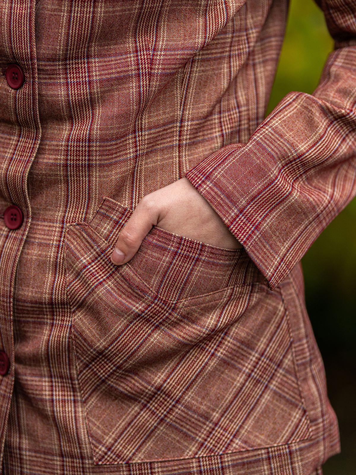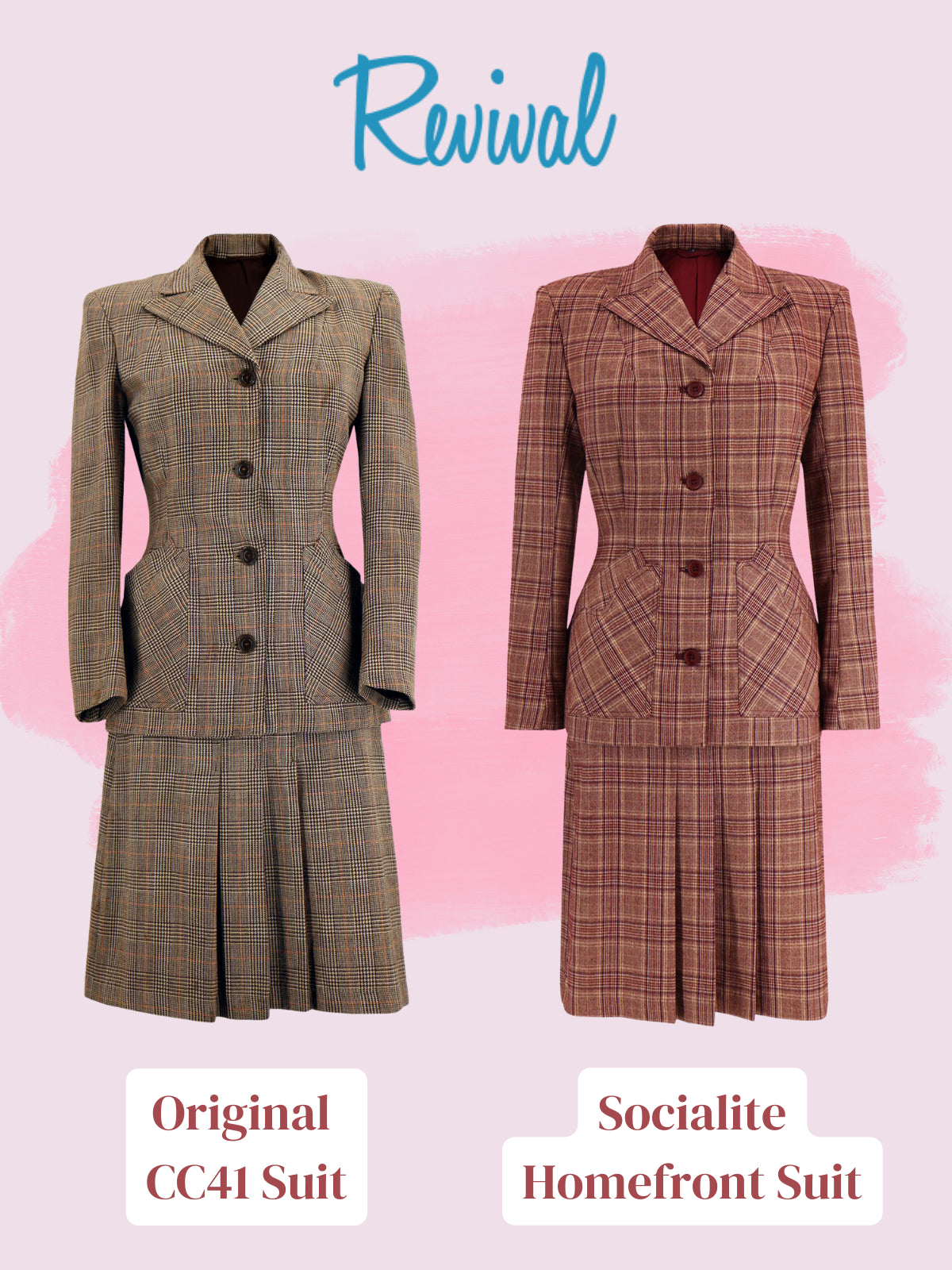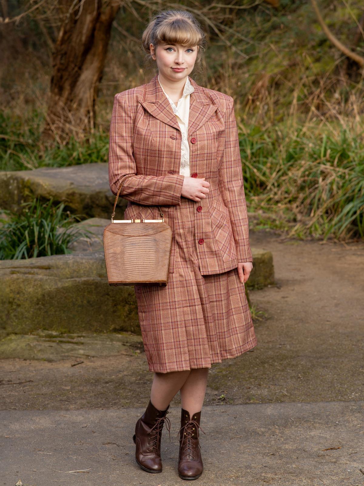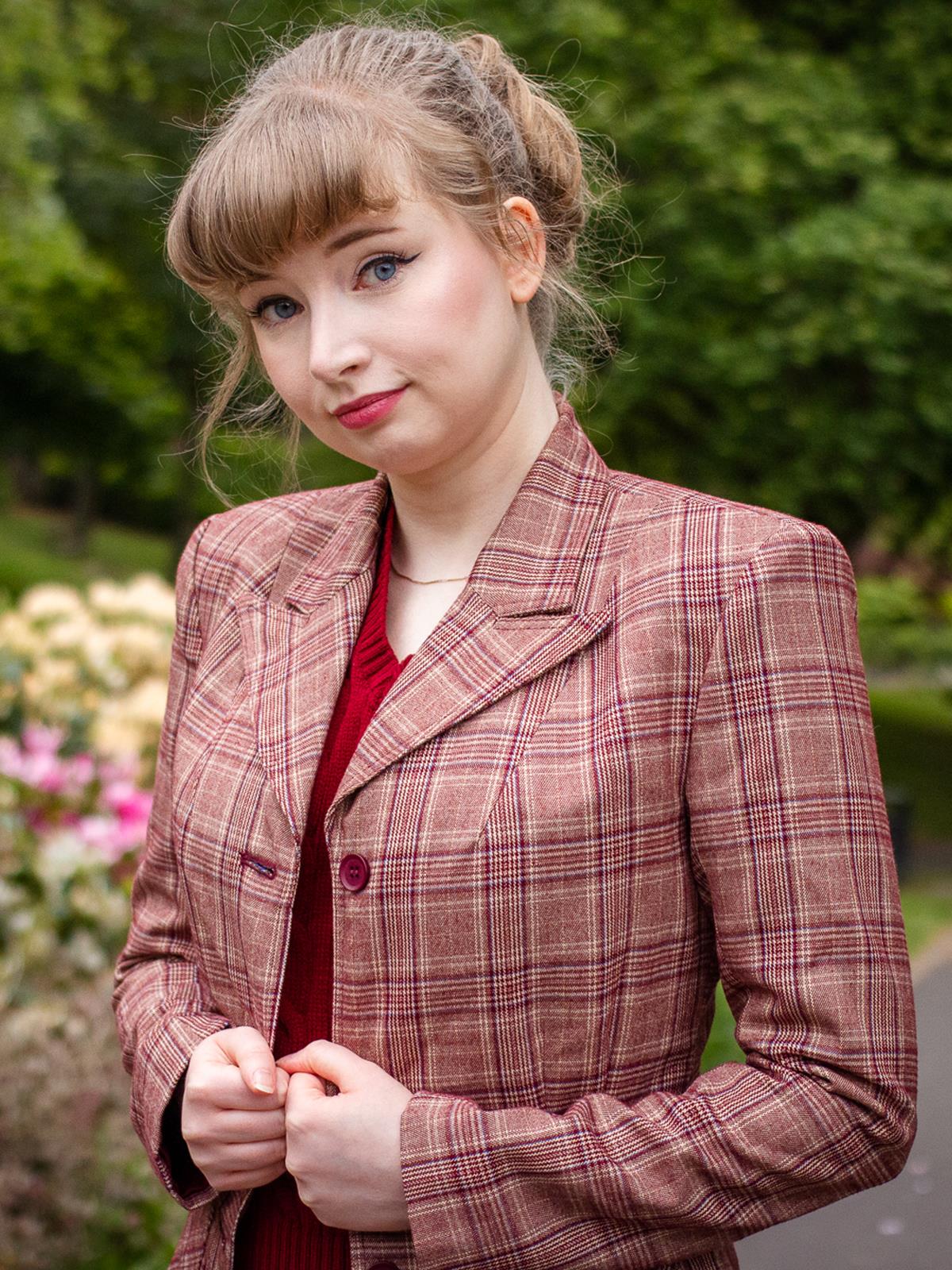 The design of our Homefront suit is taken from an original CC41 ladies' suit in our collection, lending this piece incredible accuracy to the styles of the 40s decade. Made of a soft wool-feel check fabric, the warm claret red tones make it ideal for wear during autumn and winter.