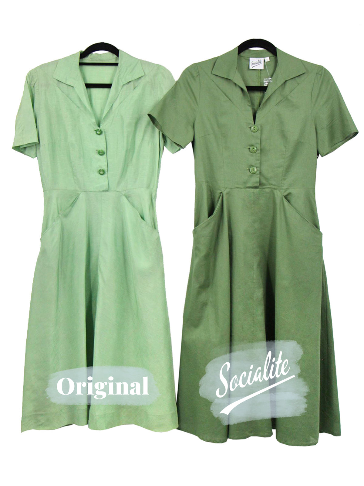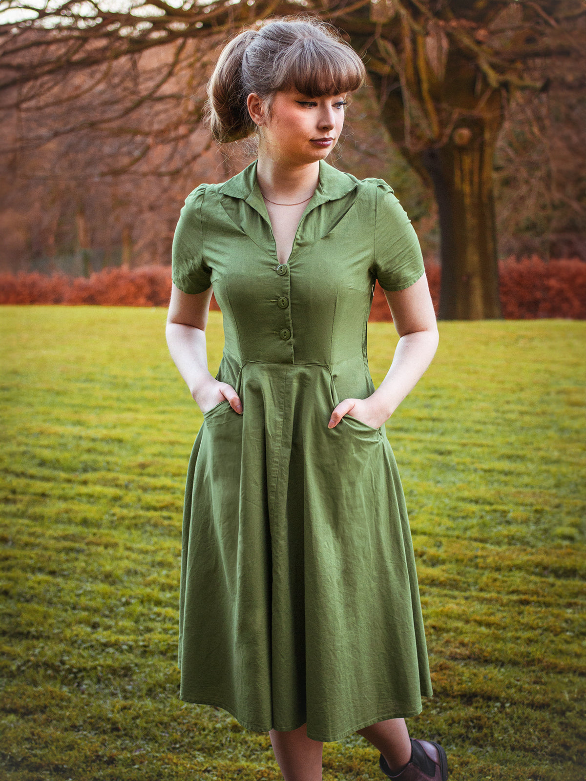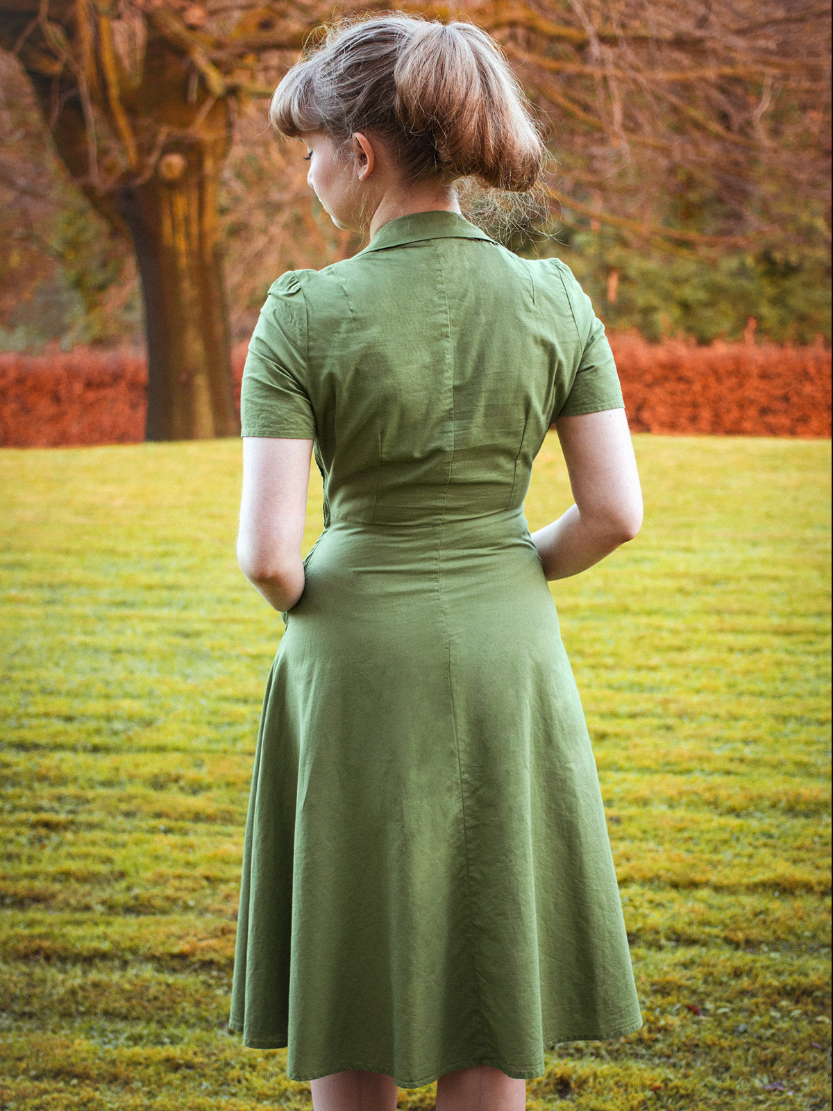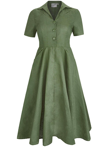 The Melody dress is a striking forties look shirtwaist dress, reproduced from an original vintage garment, right down to the smallest details like the three large feature buttons on the bodice. Made of an all-natural, lightweight and breathable pure cotton-linen blend fabric. The Willow green colourway is a rich, leafy green perfect for spring-summer weather, sure to be beloved by any vintage fashion enthusiast.