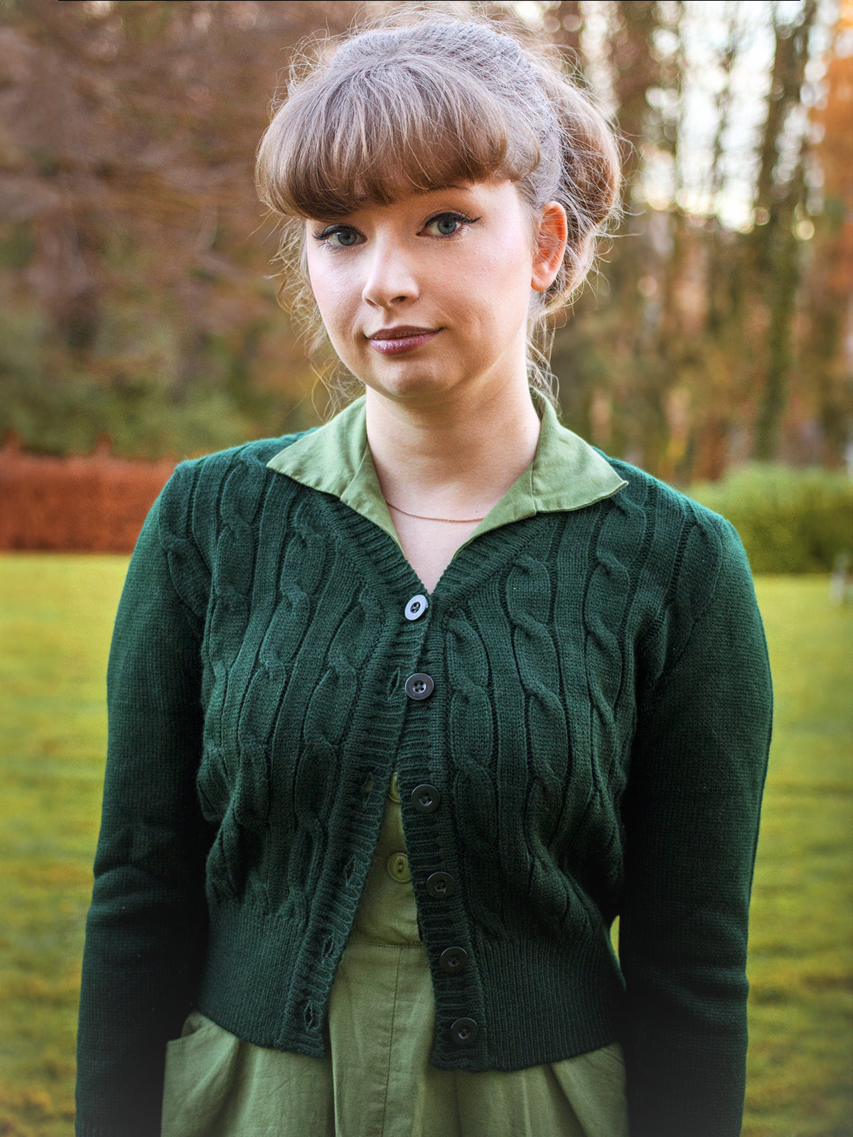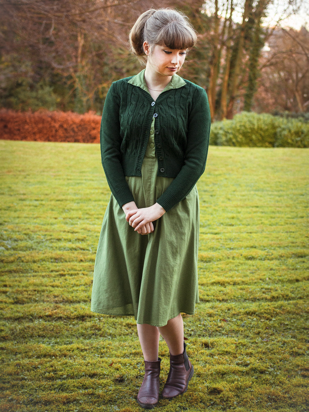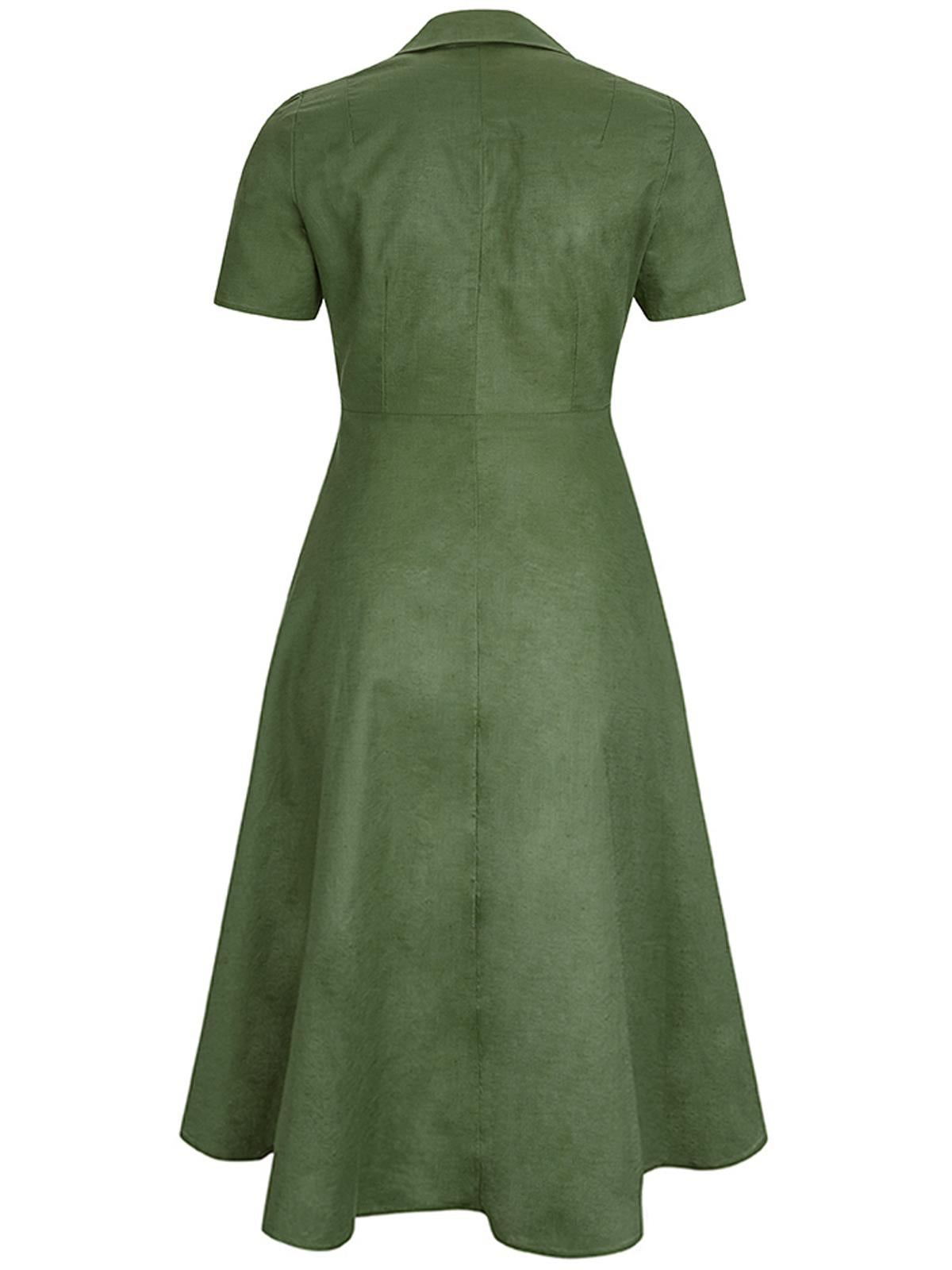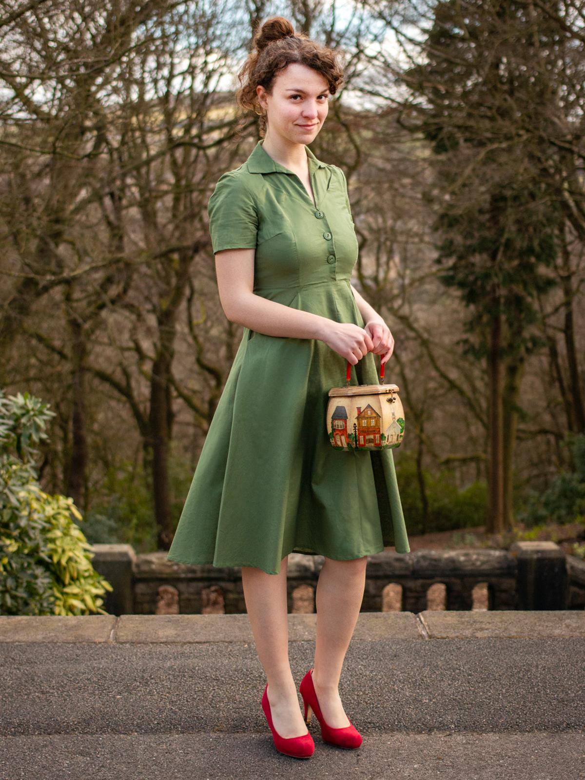 The Melody dress is a striking forties look shirtwaist dress, reproduced from an original vintage garment, right down to the smallest details like the three large feature buttons on the bodice. Made of an all-natural, lightweight and breathable pure cotton-linen blend fabric. The Willow green colourway is a rich, leafy green perfect for spring-summer weather, sure to be beloved by any vintage fashion enthusiast.