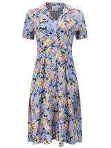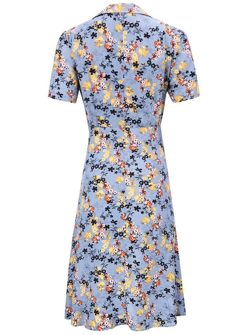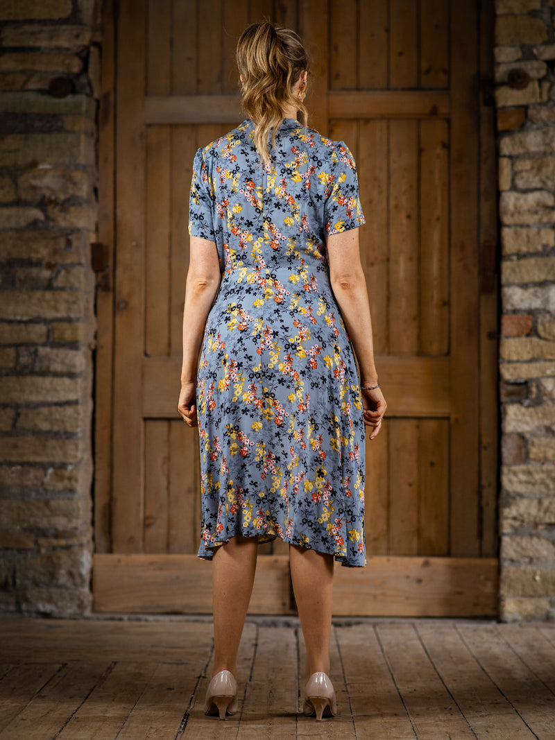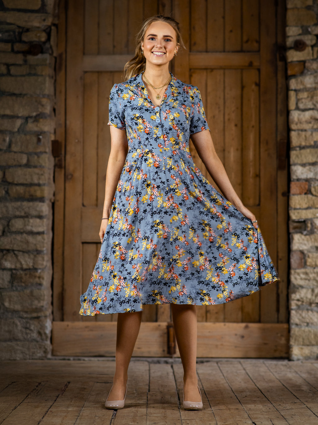 The Melody dress is a striking forties look shirtwaister style, replicated from an original vintage garment, right down to the smallest details like the three large feature buttons on the bodice. Made from a lightweight grey and yellow floral 100% Rayon fabric.