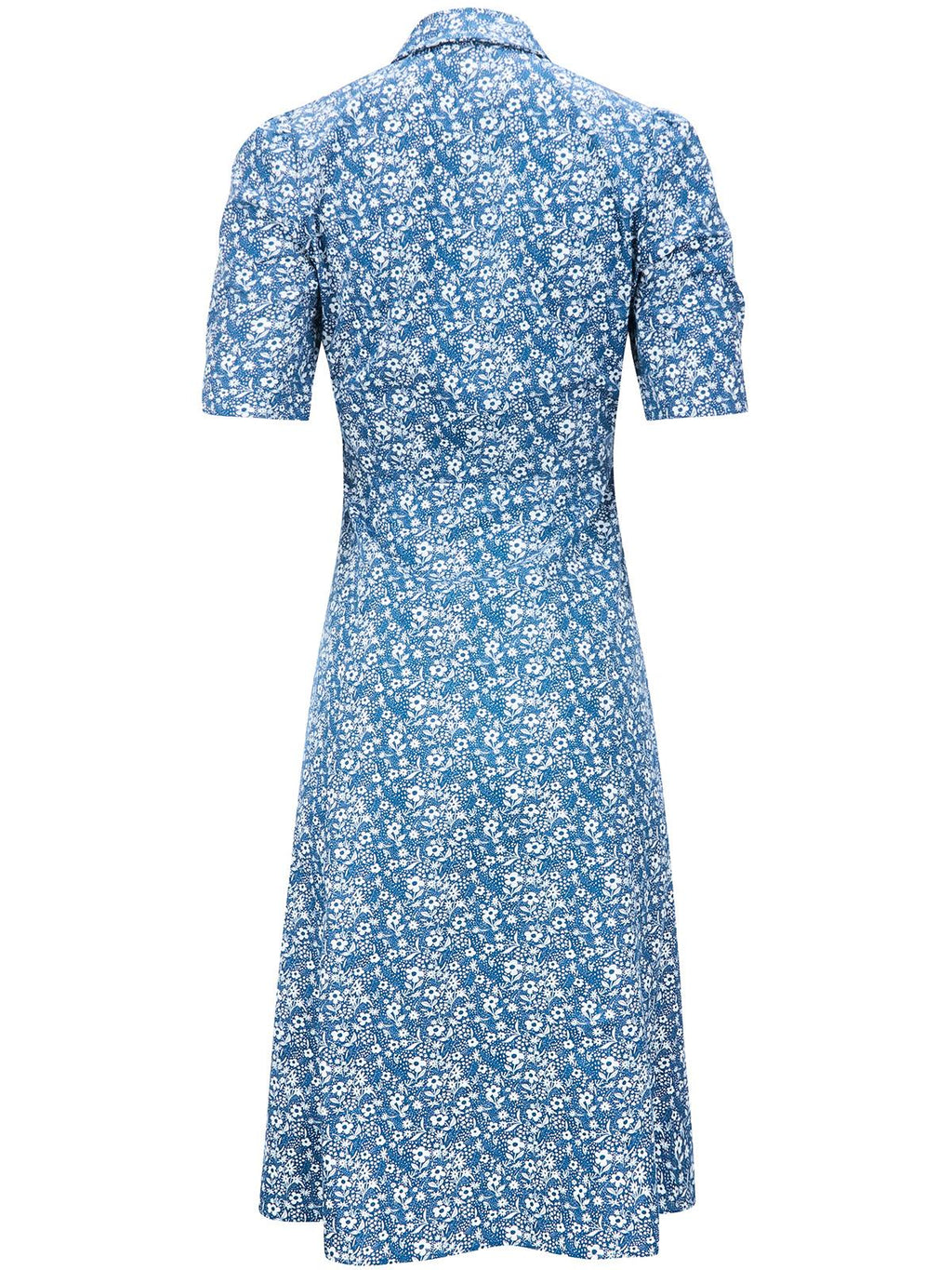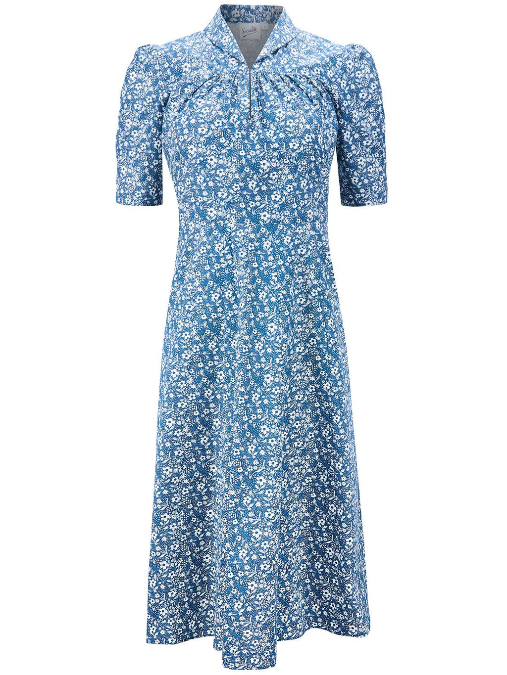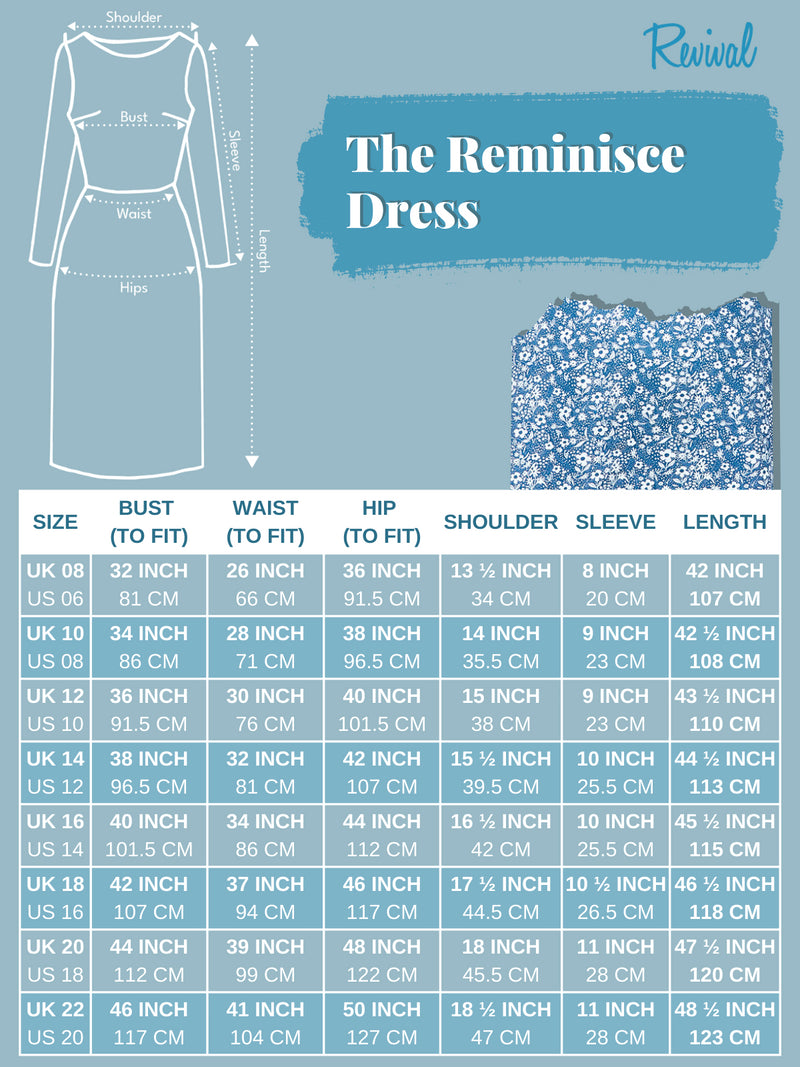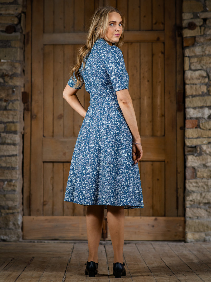The Reminisce dress is a pleasing forties-look tea dress, accurately copied from an original garment from the era. This iconic vintage day garment has a low neckline with a horizontal row of gathers to the bust, which can be fastened higher with a hook-and-eye closure if preferred. The construction of the Reminisce is one that flatters the figure in the way only vintage clothing can.