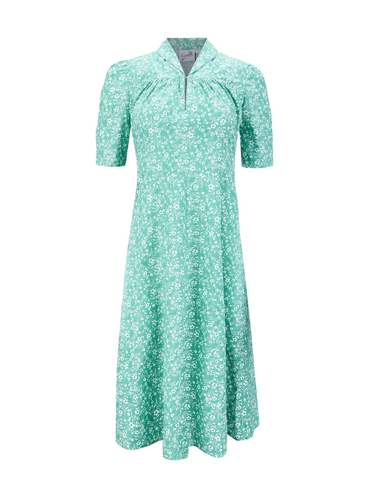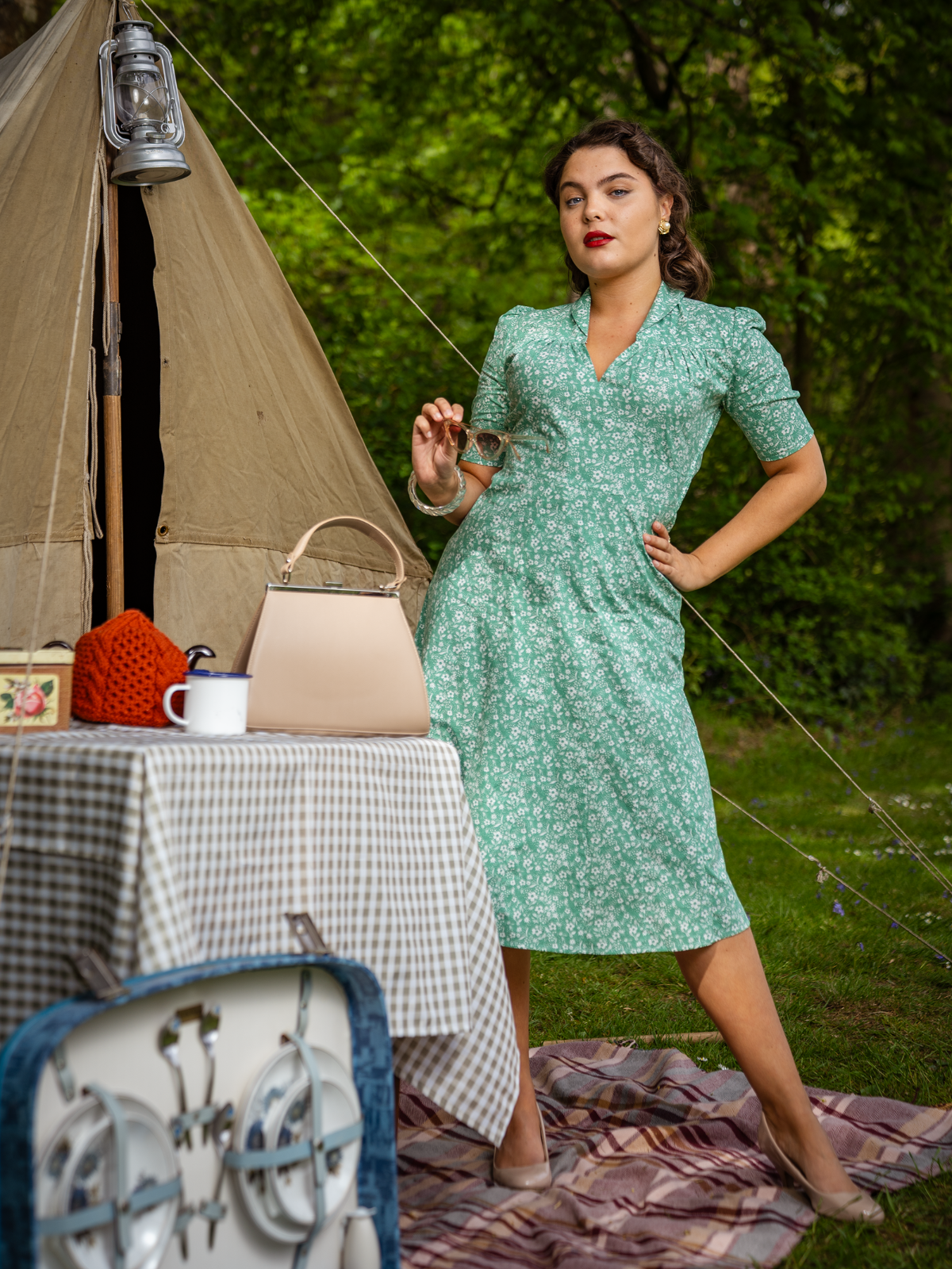 The Reminisce dress is a pleasing forties-look tea dress, accurately copied from an original garment from the era. This iconic vintage day garment has a low neckline with a horizontal row of gathers to the bust, which can be fastened higher with a hook-and-eye closure if preferred. The construction of the Reminisce is one that flatters the figure in the way only vintage clothing can.