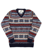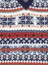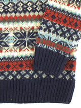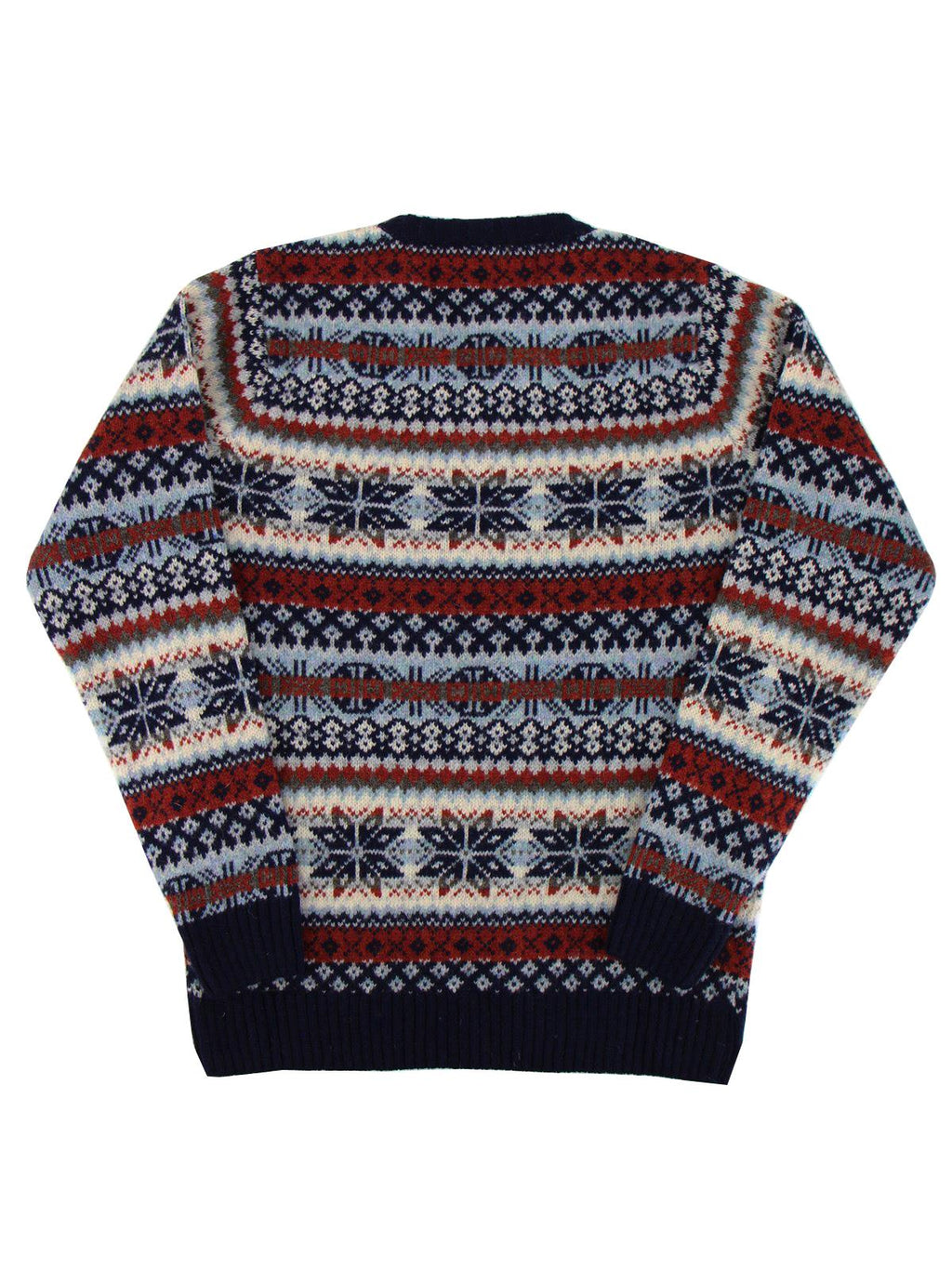This particular style is a long-sleeved jumper or sweater in a dark navy blue, with accents of rust red, light blue, grey and cream.