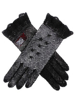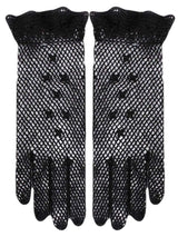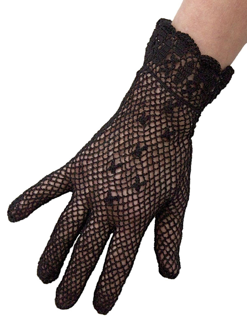 The iconic ladies accessory of the forties. Pretty crochet patterned fronts with scalloped wrists. Brand new reproduction cotton gloves in the style of the 40s decade.