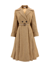 Our Promenade coat is an incredible timepiece from the forties. The design is taken from the pattern of an original 40s coat we have in our archive. Our Autumn 2023 version has been improved and updated from our previous run of this iconic coat. We've made some small tweaks to the design and selected a new, premium wool blend fabric that's soft to the touch and drapes beautifully on the figure.