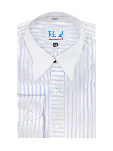 This Orton "grandad" shirt features a subtle blue and pink stripe, exclusive to our brand, and comes with a white detachable spearpoint collar. The shirt has two buttonholes in the neck to attach the included white collar, swap it out for another style (available separately), or to wear without for a more casual 1930s - 1940s look. The stripe evokes the thirties and forties period perfectly and will be a versatile staple for your vintage wardrobe.