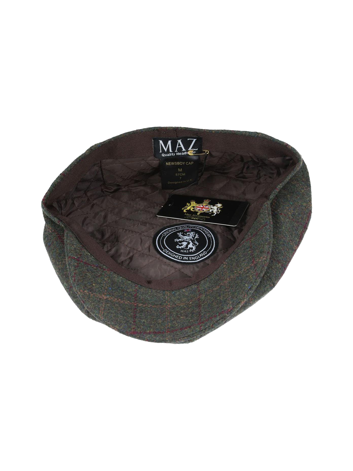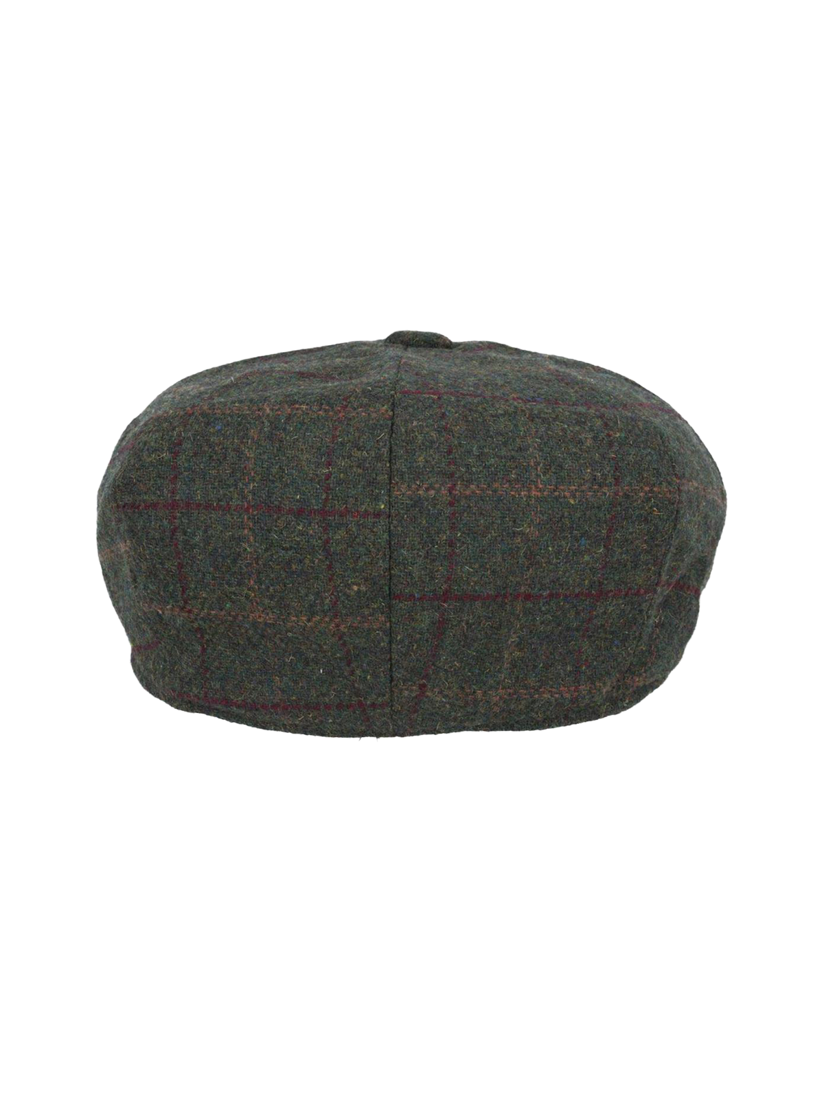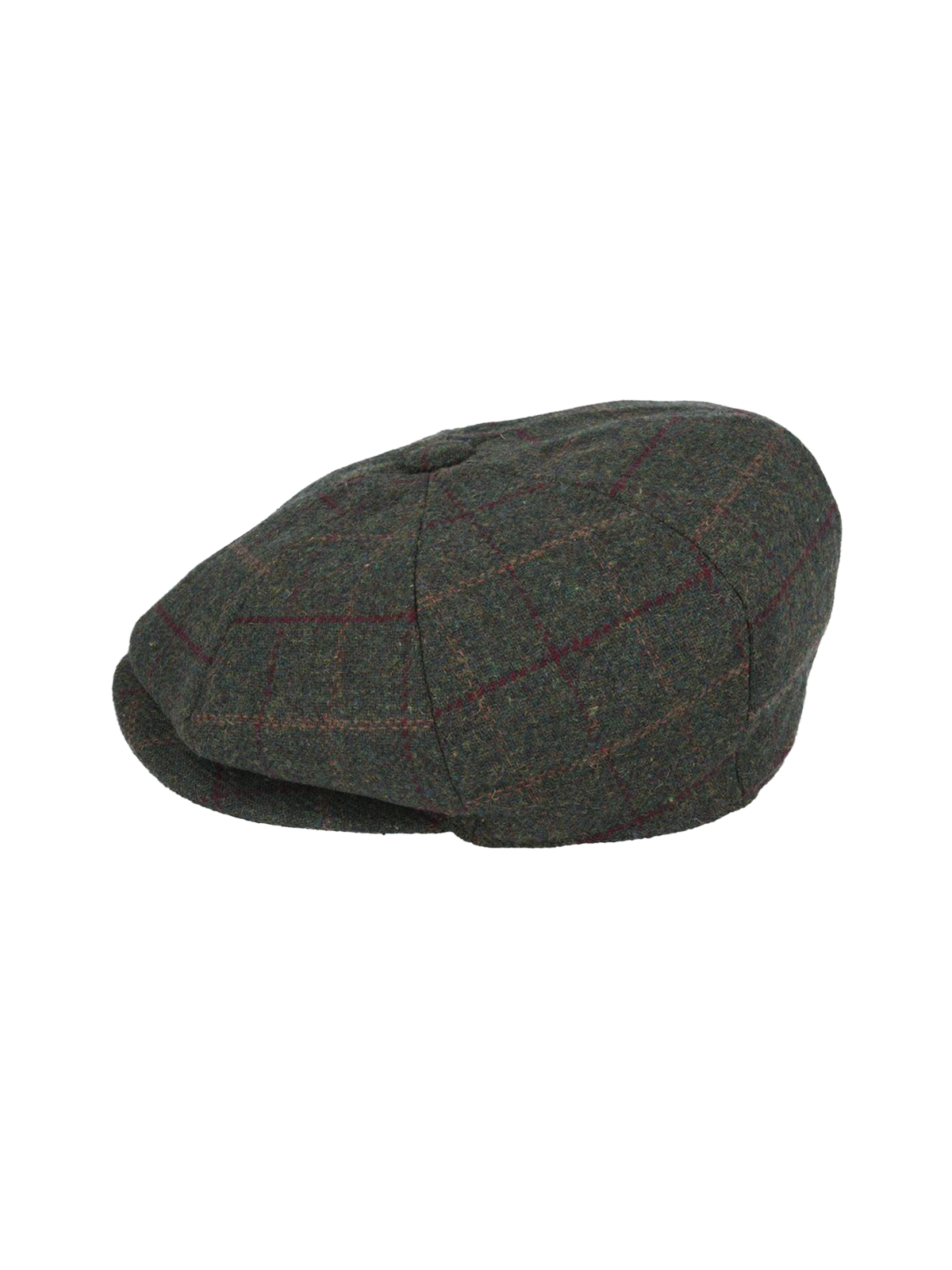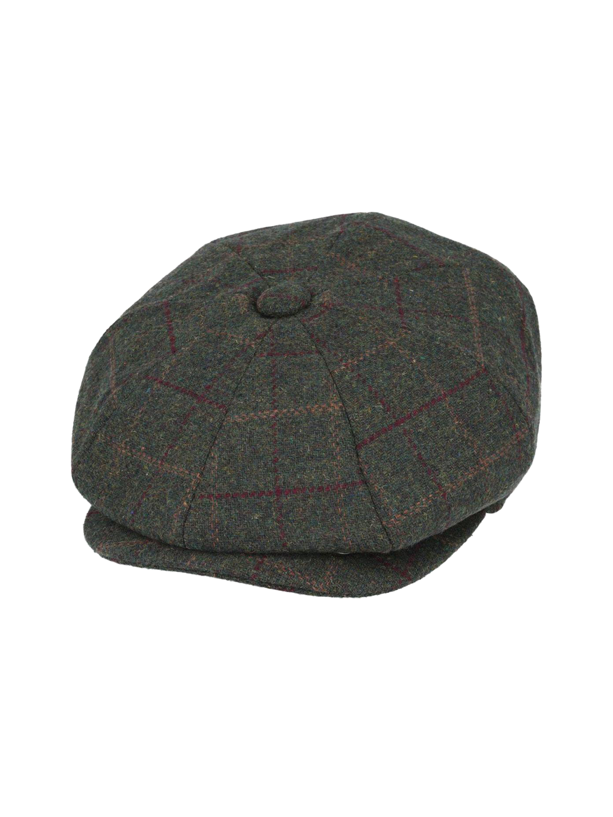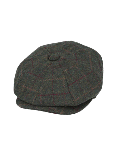 Green herringbone 8 panel newsboy cap with dark green and red large check.