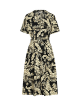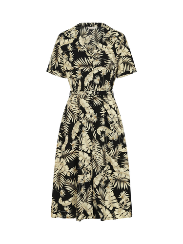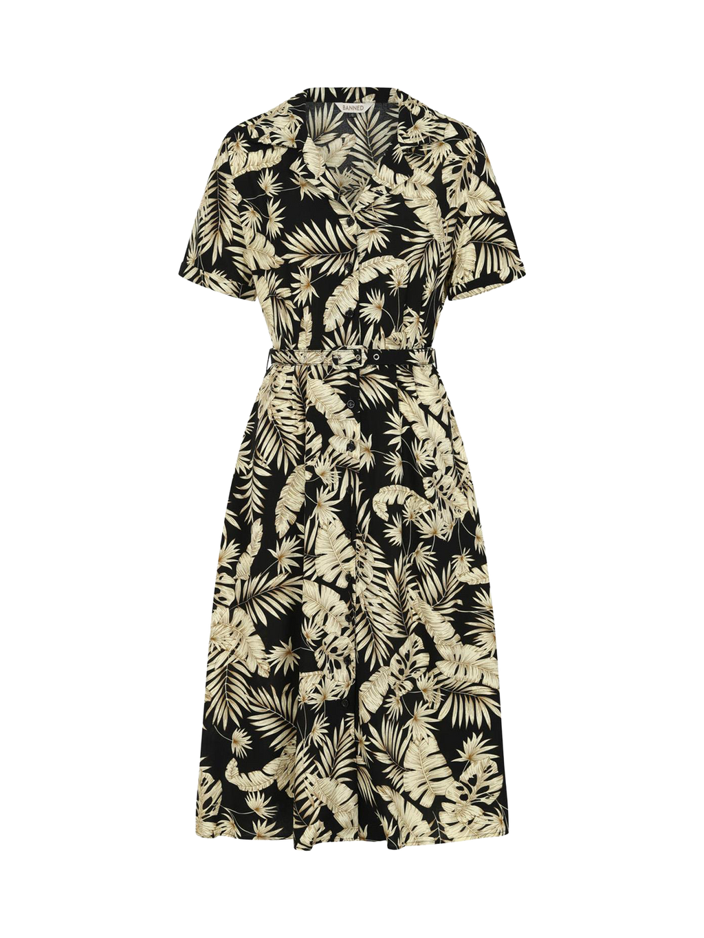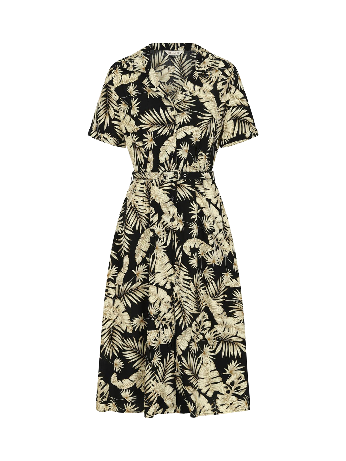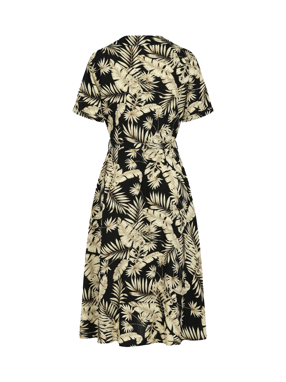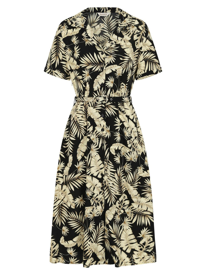 Add a touch of classic retro charm to your wardrobe with this 1950s-inspired black and cream Hawaiian print shirtwaister dress. Featuring a timeless floral pattern, this dress fastens with matching black buttons down the front and includes a coordinating fabric belt for a flattering fit. Designed with practical side seam pockets and a comfortable silhouette, it’s the perfect spring-summer staple for any vintage fashion lover.