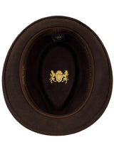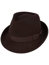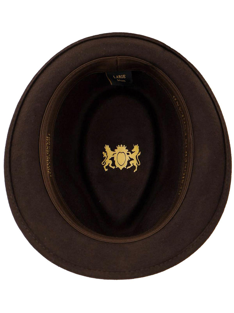 The iconic brown trilby is a perfect finishing touch for an authentic 1950s-inspired outfit. Crafted from solid wool felt, it features a turned-up grosgrain edge, a deep hatband, and a ribbon tail detail to one side. Designed in a crushable style, it travels easily without losing its shape. Handmade from 100% wool with a water resistant finish, this timeless trilby is a versatile classic for any gentleman’s vintage wardrobe.