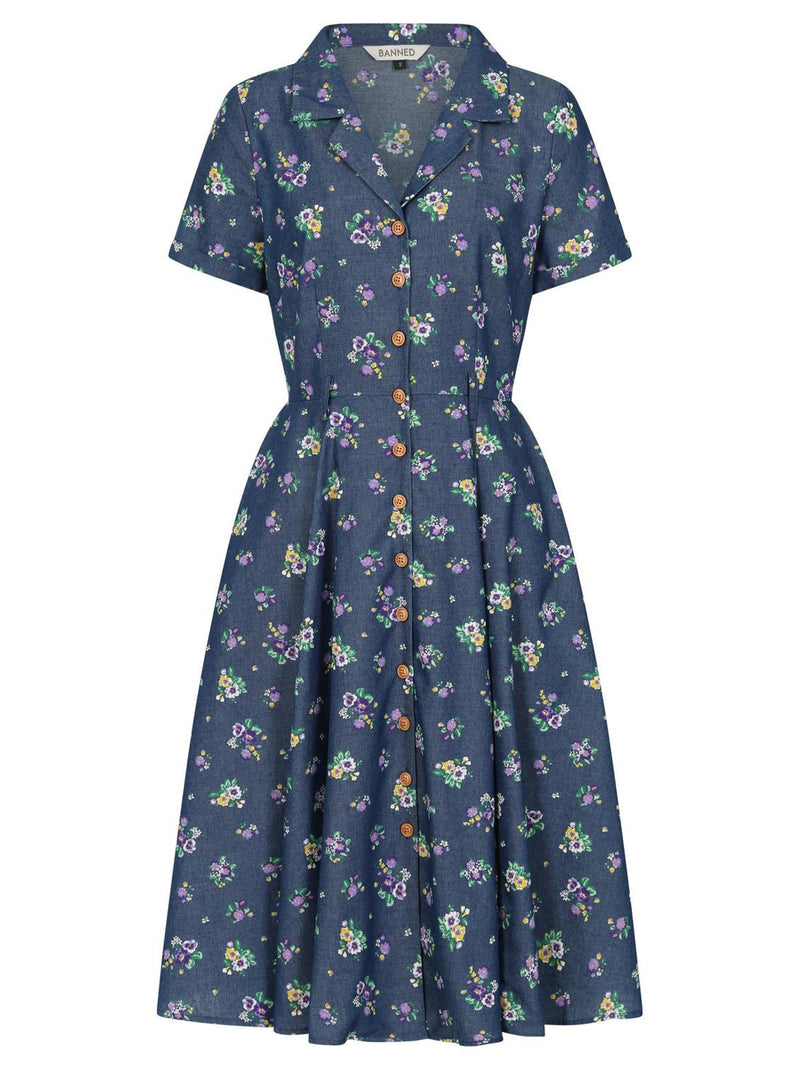 Vintage style shirtwaist dress crafted from a denim-look fabric, offering both a classic and casual vibe. Featuring a flattering full skirt and practical pockets and a matching belt to cinch at the waist. The dress showcases a beautiful purple and yellow floral print, with its button-down front, this dress effortlessly combines comfort and charm for any occasion.