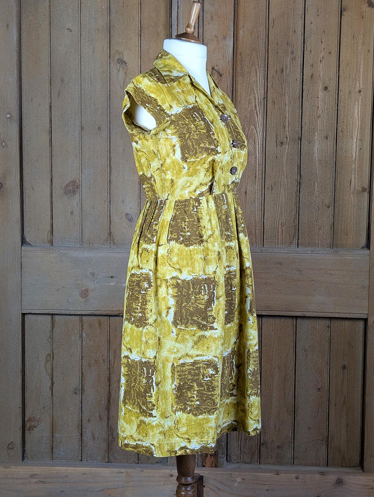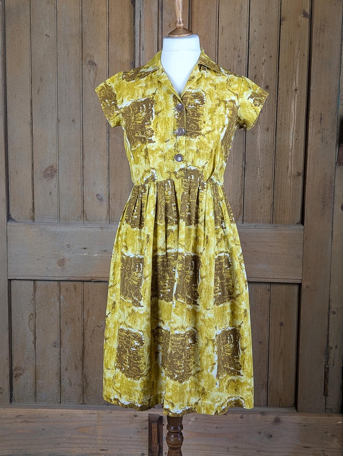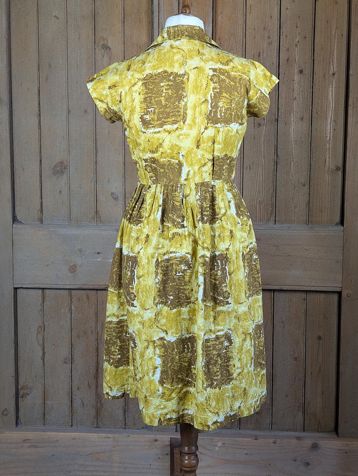 This genuine 50s cotton day dress has a mustard and khaki abstract block pattern.