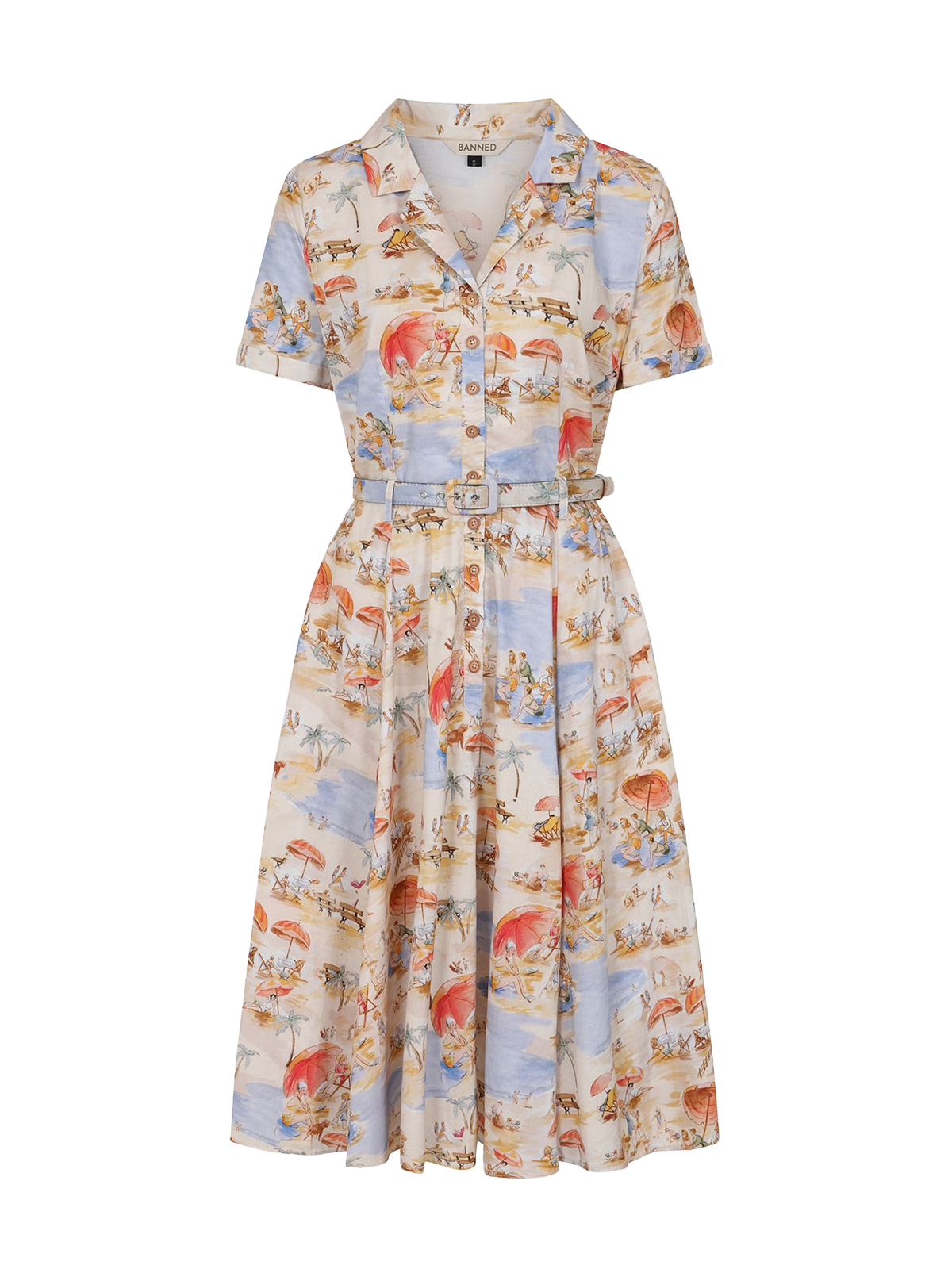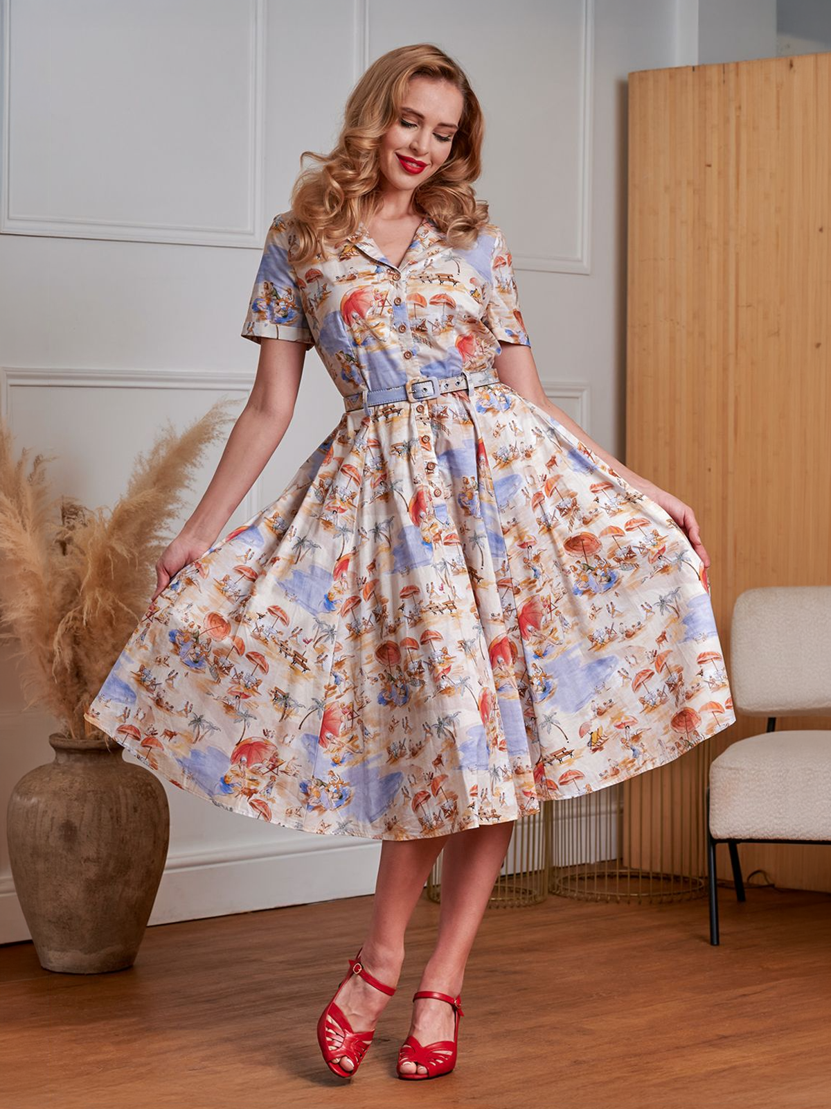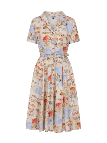 This 1950s inspired dress features a whimsical beach theme print on a classic fit-and-flare silhouette. Made from 100% breathable cotton, it is designed for comfort from day to night. With its feminine cut and dreamy aesthetic, it’s a versatile midcentury staple that balances playfulness with a timeless fit.