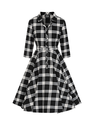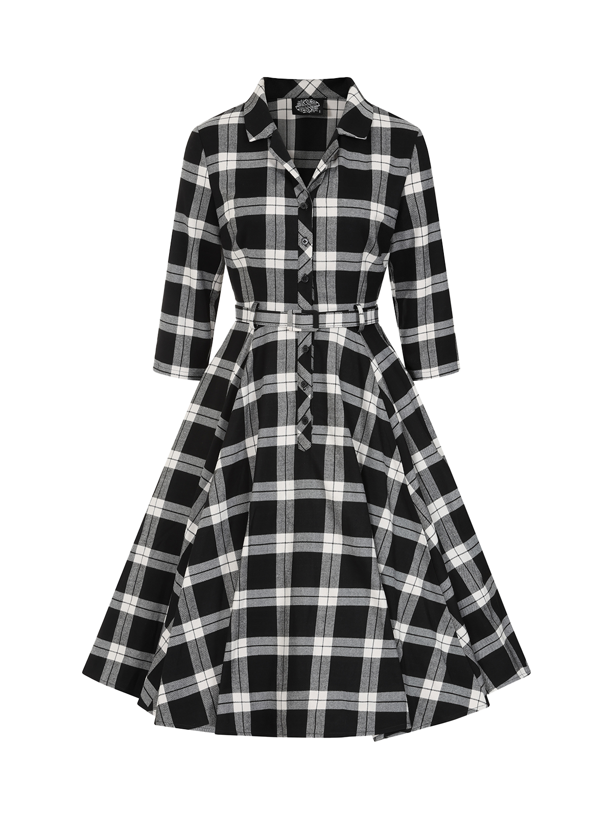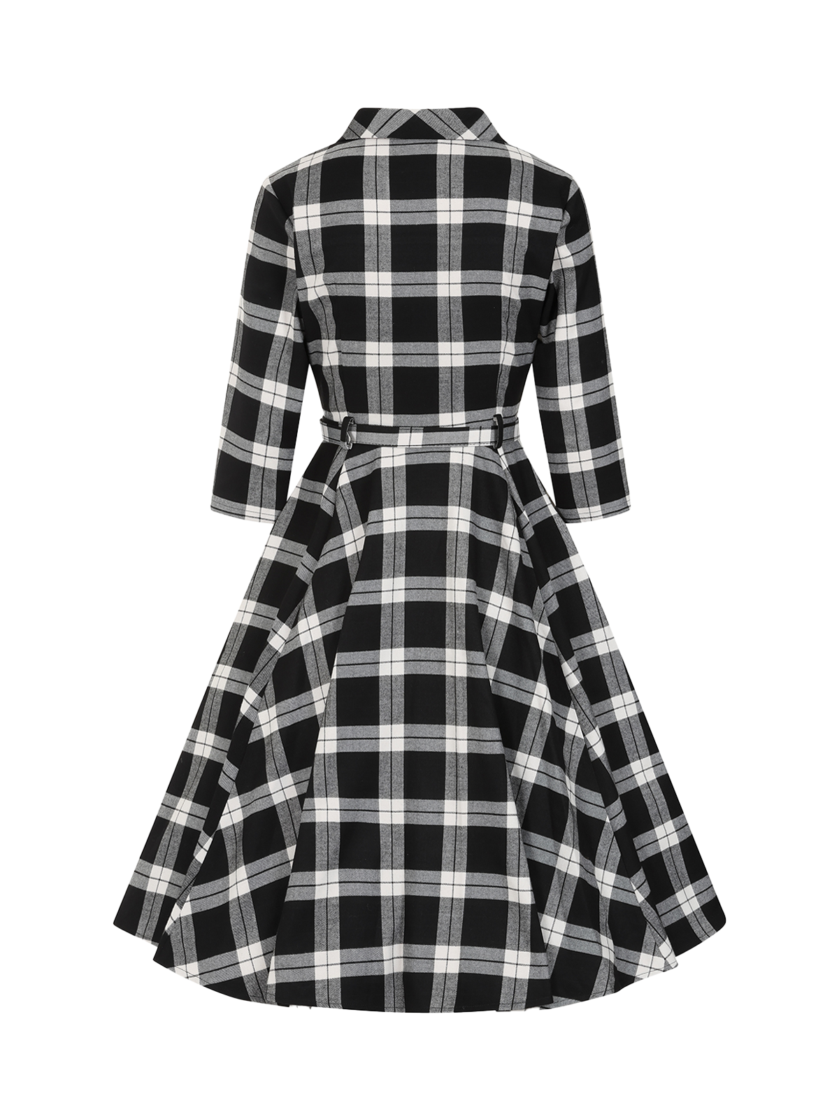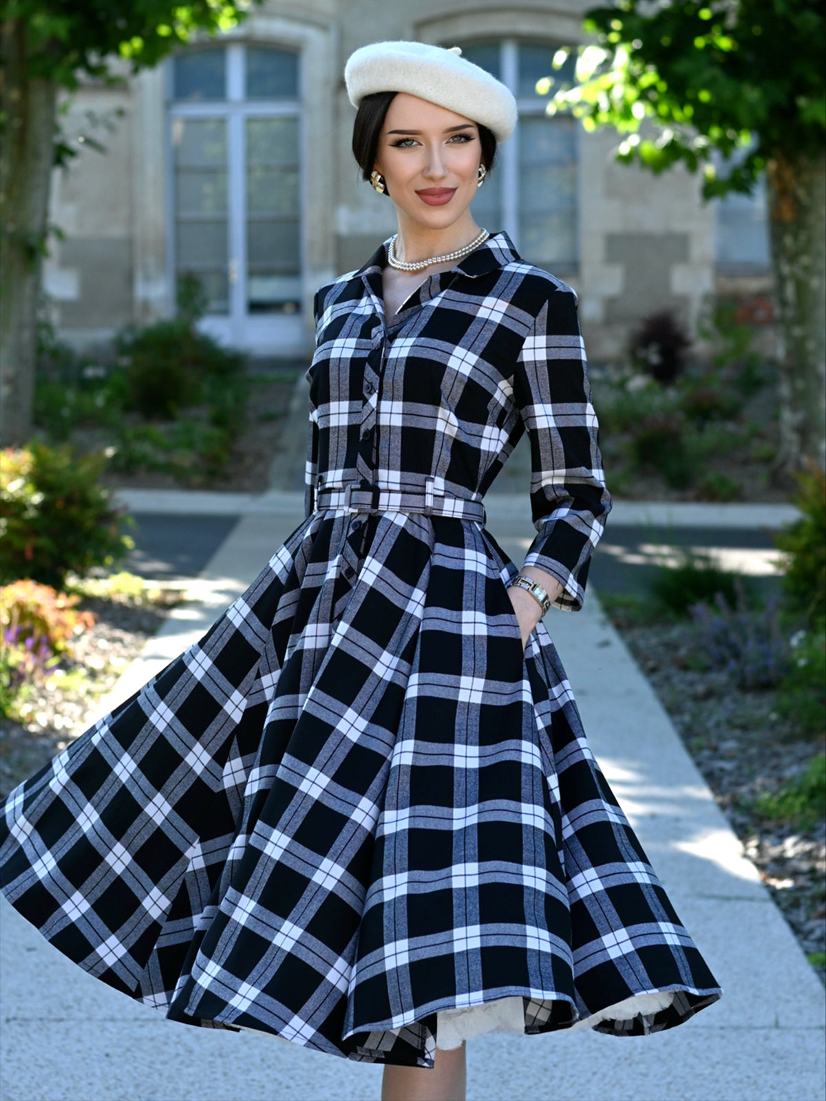A vintage inspired swing dress in cream and black tartan, combining timeless plaid with a tailored silhouette. Designed with a lapel collar, ¾ length sleeves, and a button front placket, it has belt loops with a matching belt to cinch the waist. Finished with hidden side seam pockets for everyday practicality.