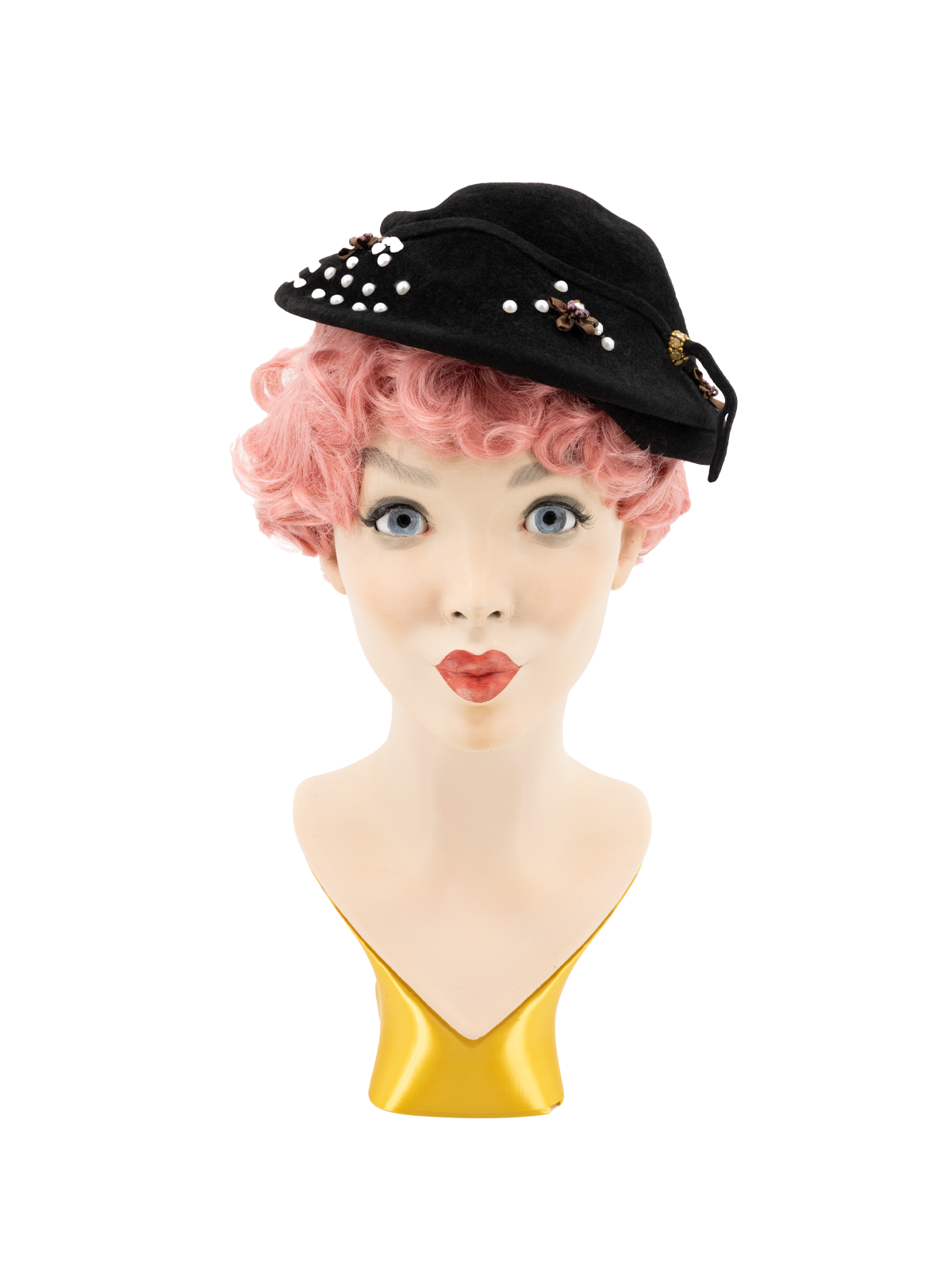 This original 1950s occasion hat is a structured, sophisticated example of midcentury millinery. Made from black velour, the piece features period correct accents.