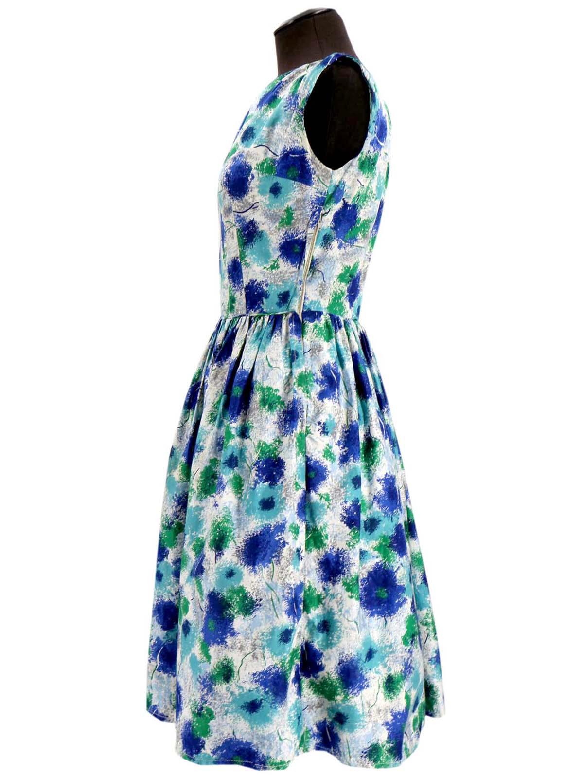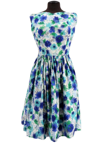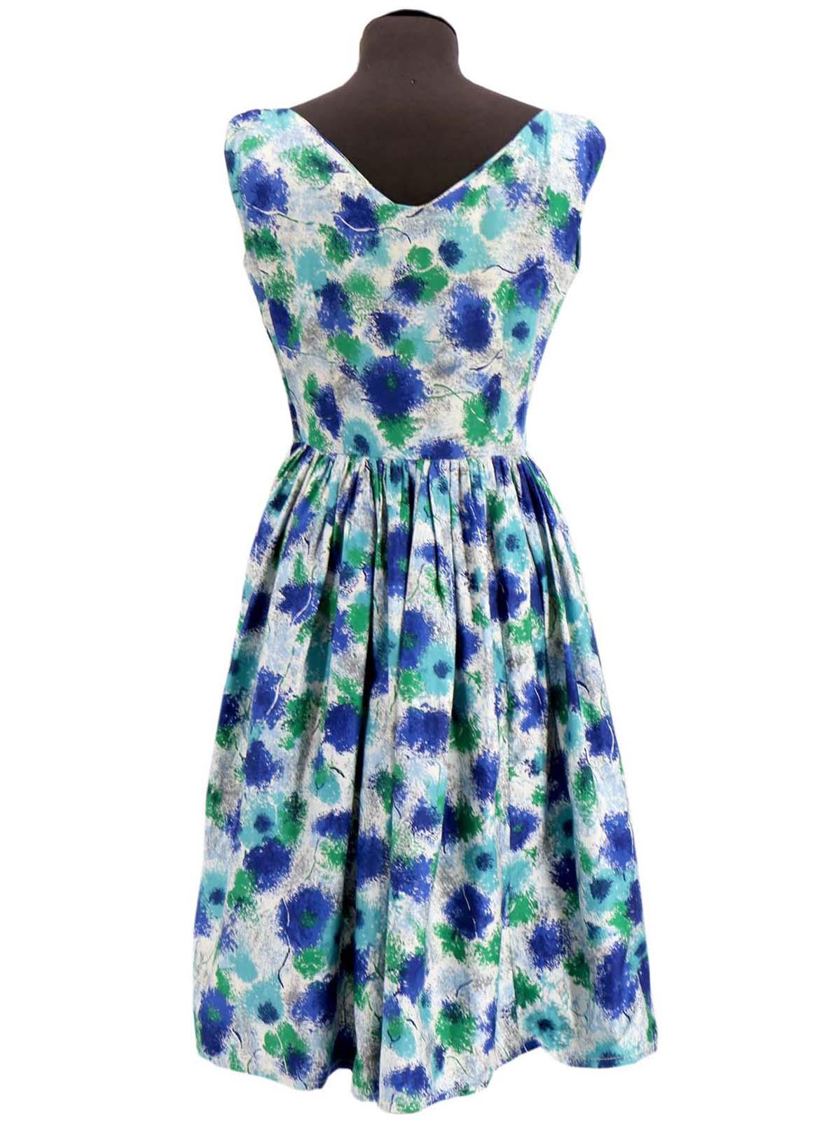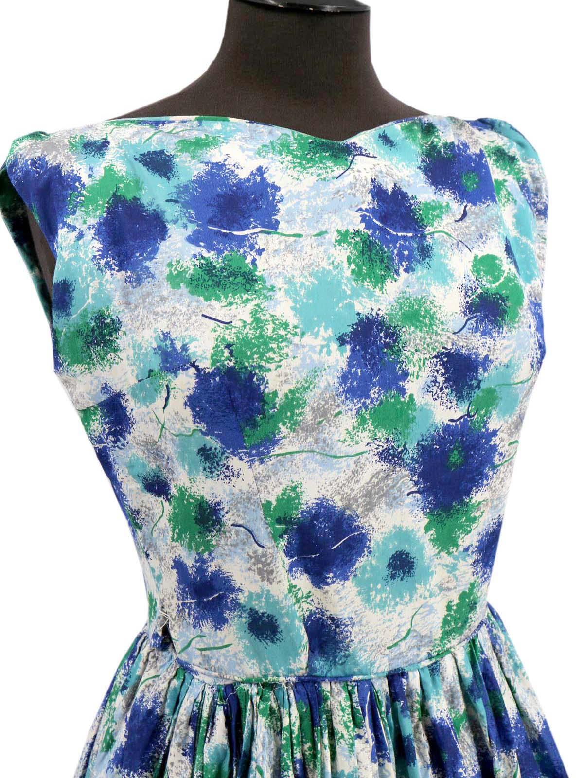 This classic fifties dress is made of a lightweight cotton and features a blue, green and white abstract pattern, reminiscent of florals.