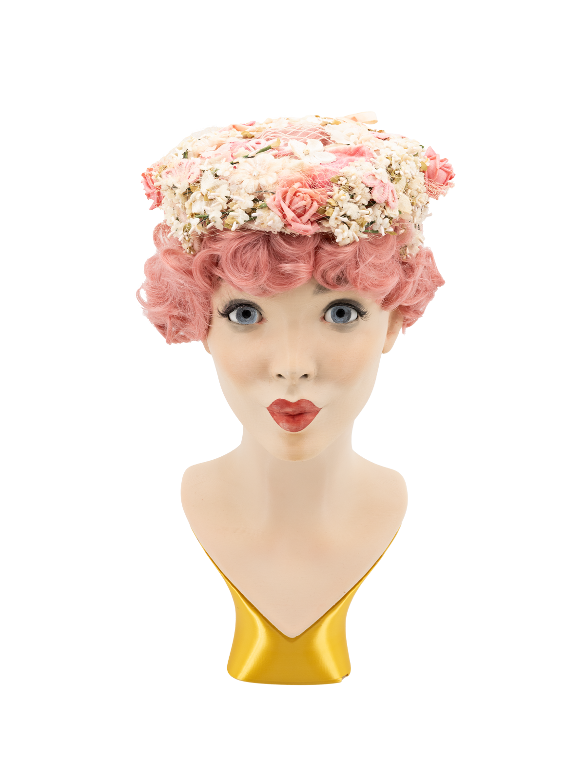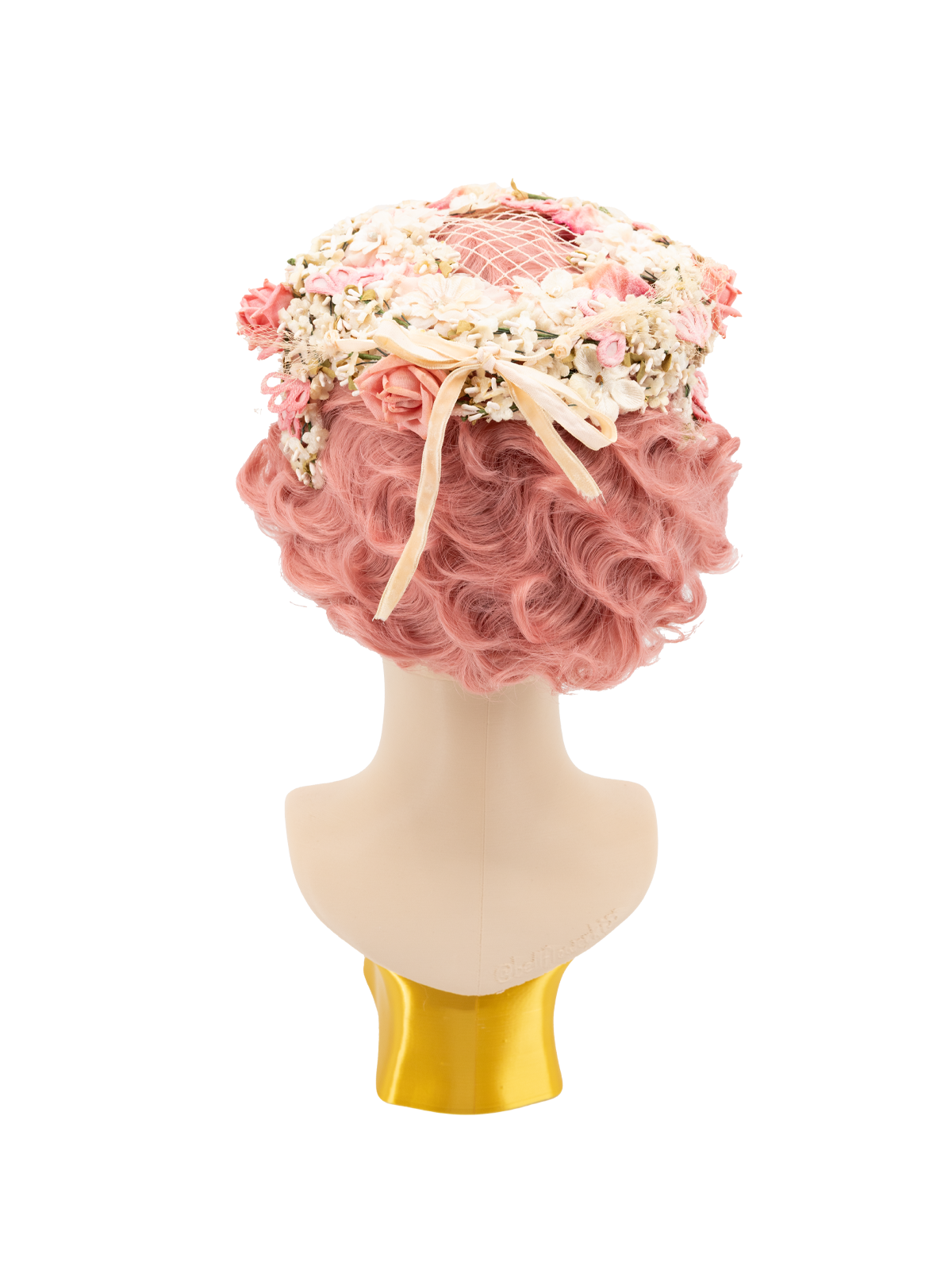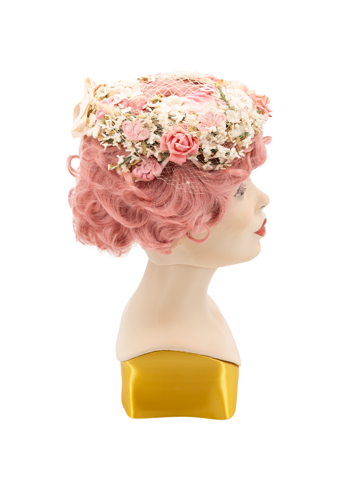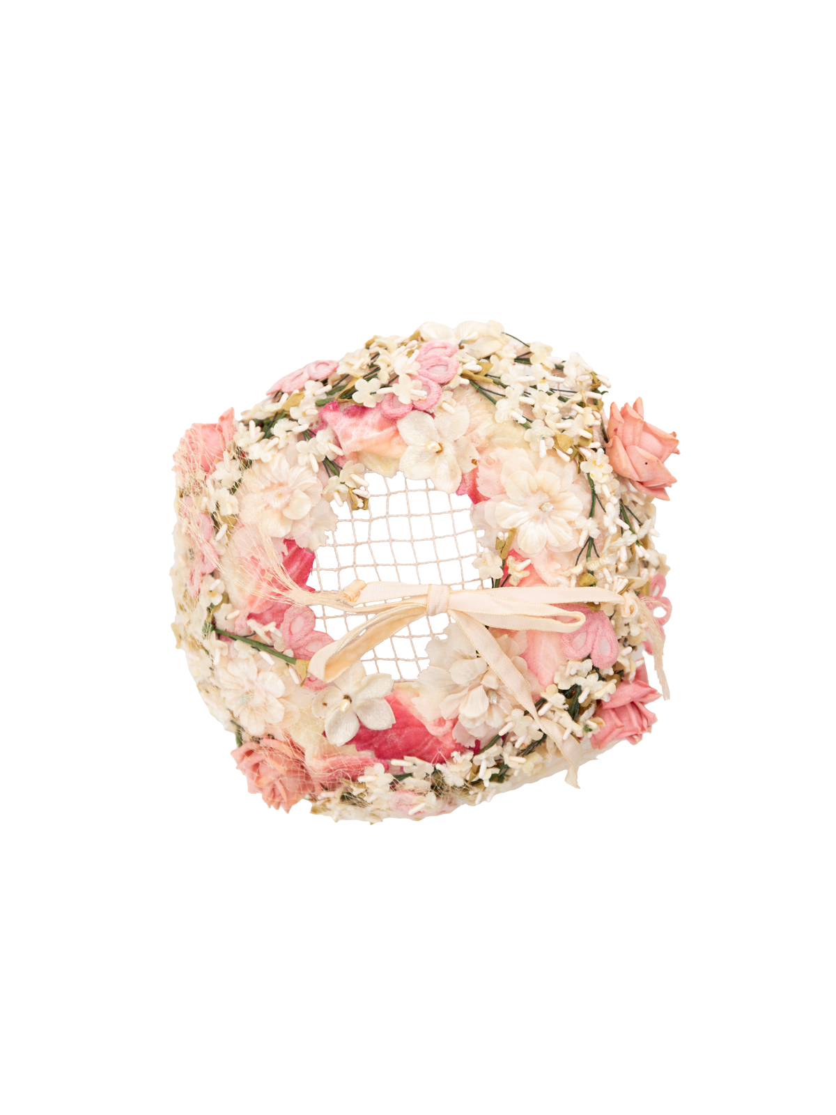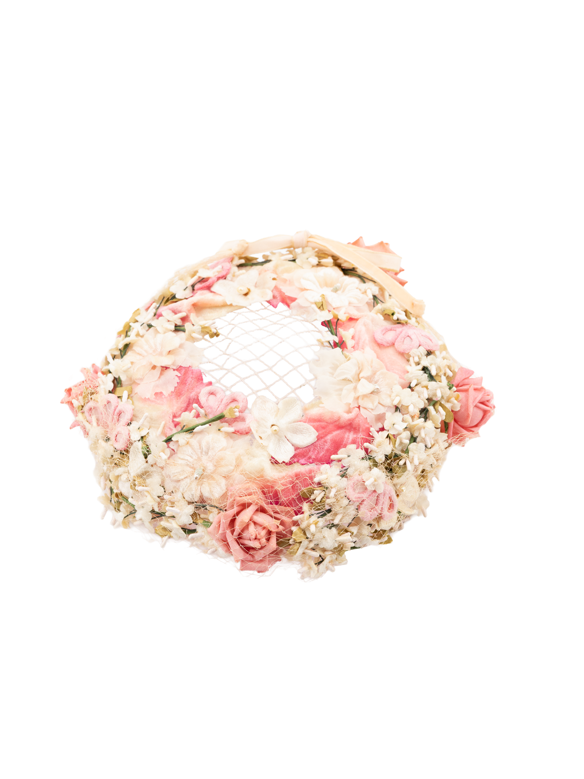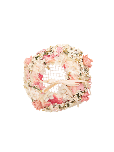 Delicate pink casque hat. This open crown design features a delicate arrangement of cream and tonal pink floral blossoms and foliage. Some age related wear and tear.