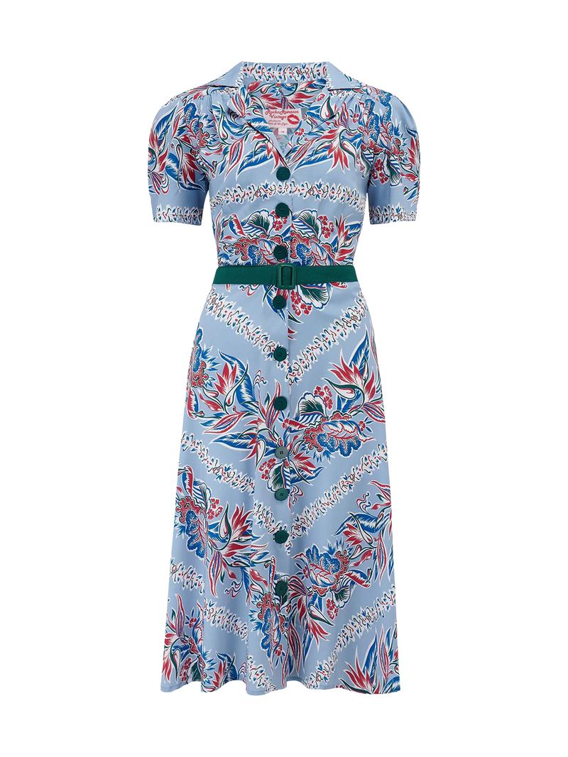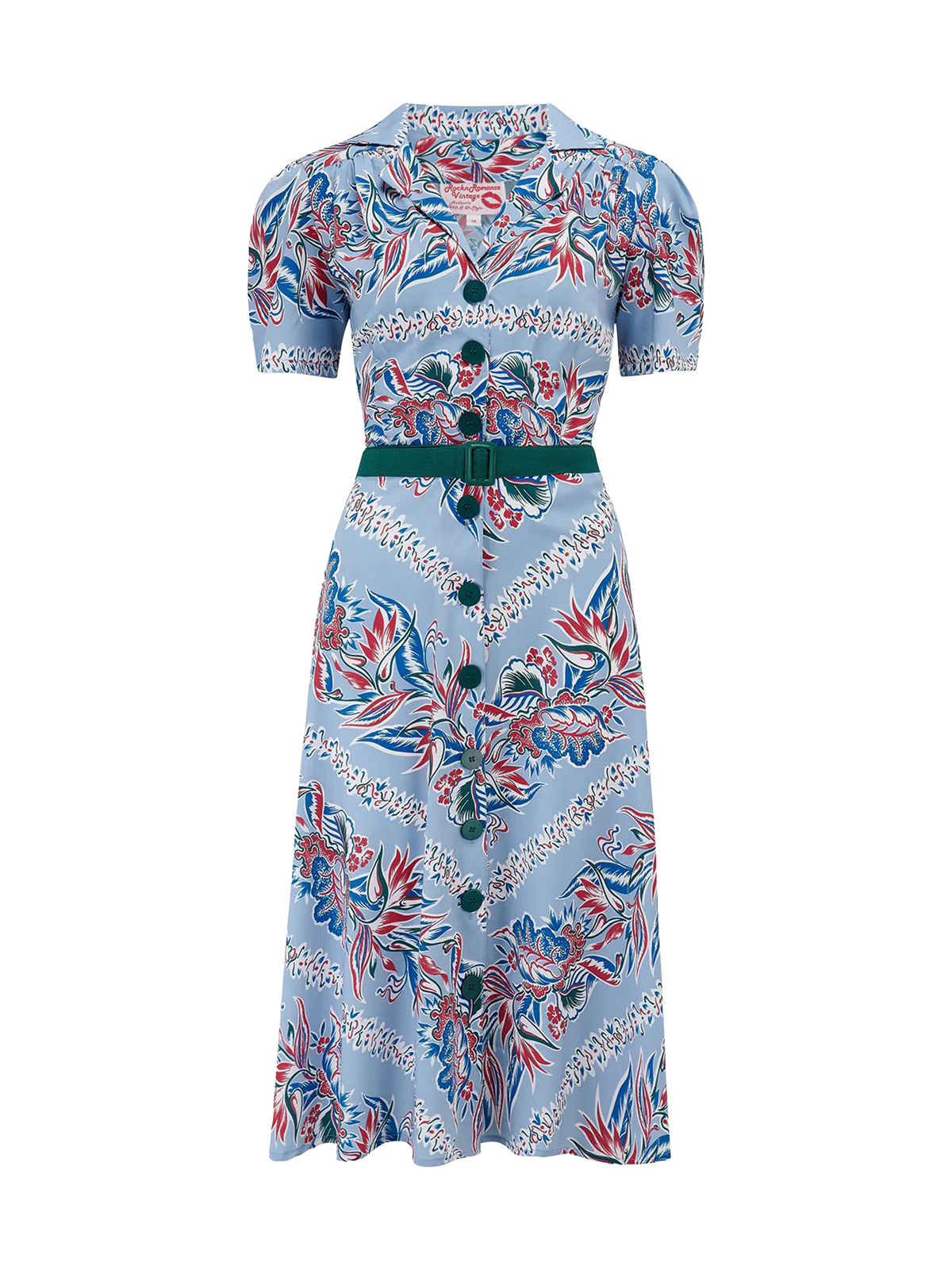 This midcentury inspired shirt dress features a striking Polynesian print on a soft crepe-textured fabric, combining comfort with true vintage flair. Coordinating green buttons and a matching fabric-covered belt complete the classic 1950s look.