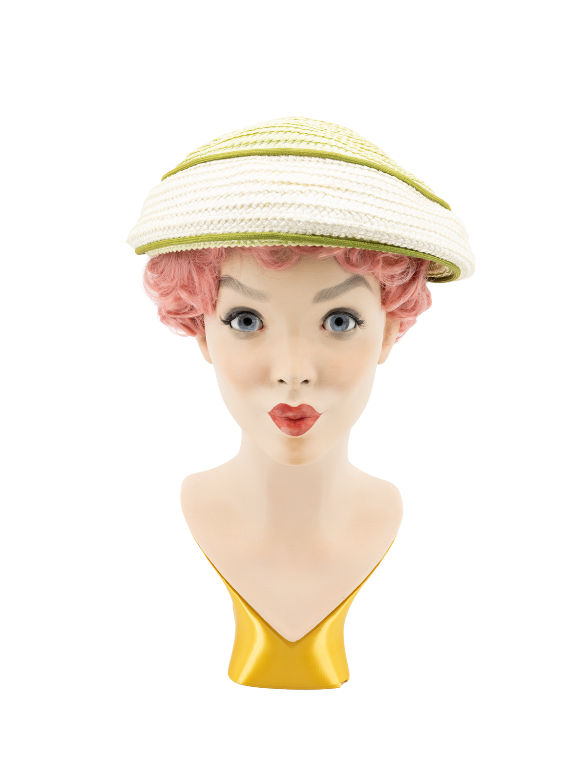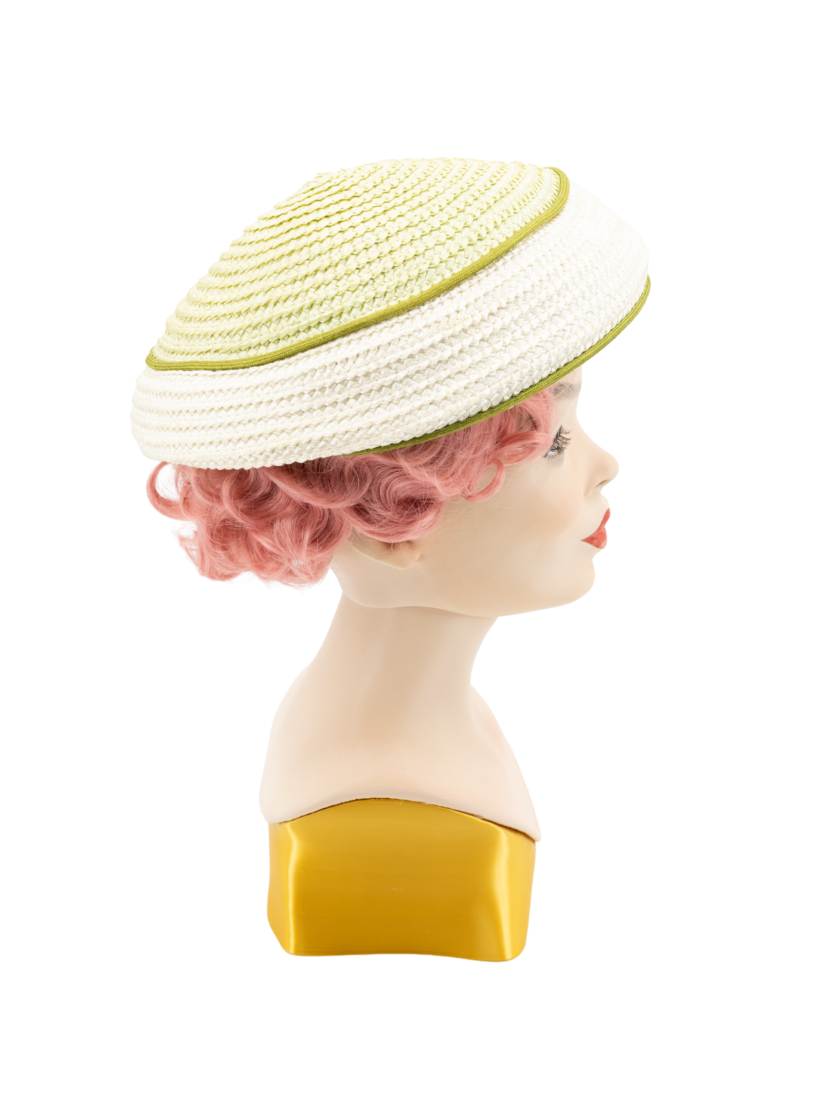 An authentic midcentury statement piece by Herbert Bernard New York. This 1950s mushroom hat features a striking spiral woven pattern in sage green and white, capturing the quintessential Dior-inspired ‘New Look’ silhouette. Great vintage condition.