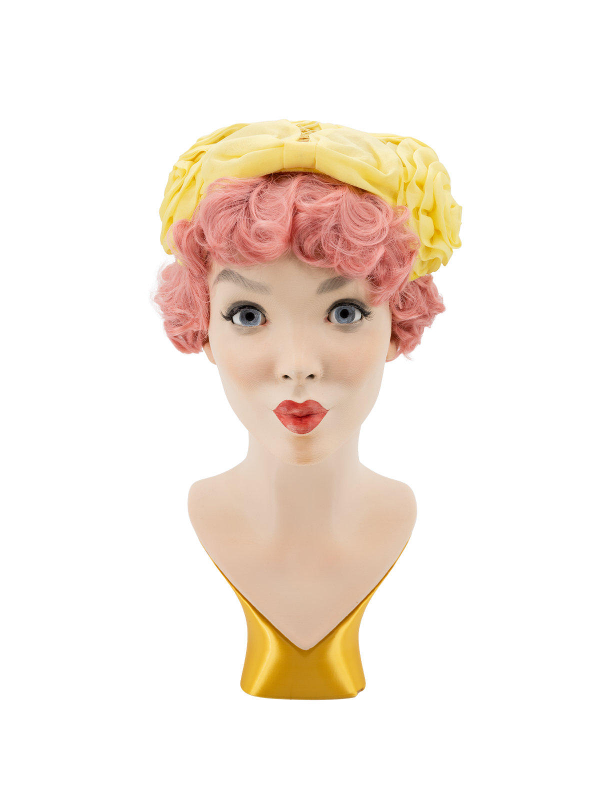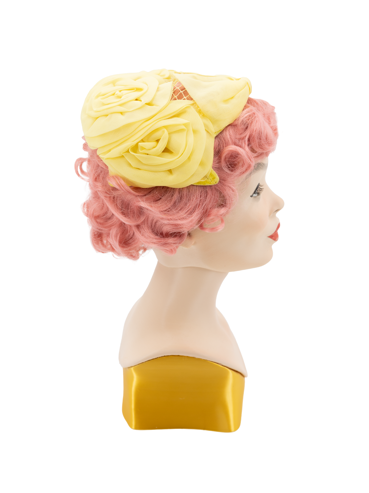 This authentic 1950s style casque hat combines structured design with delicate detailing. Rendered in a soft lemon yellow, it serves as a sophisticated focal point for vintage inspired formal wear. A mark on one of the rosettes, to the side of the hat, but otherwise in good condition.