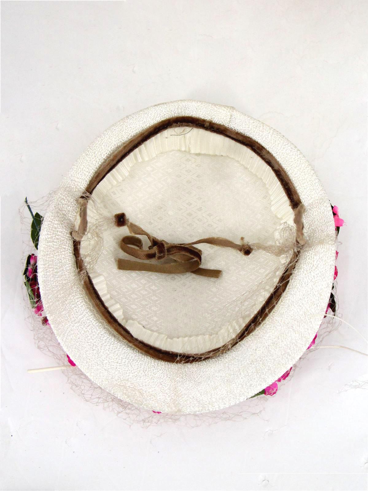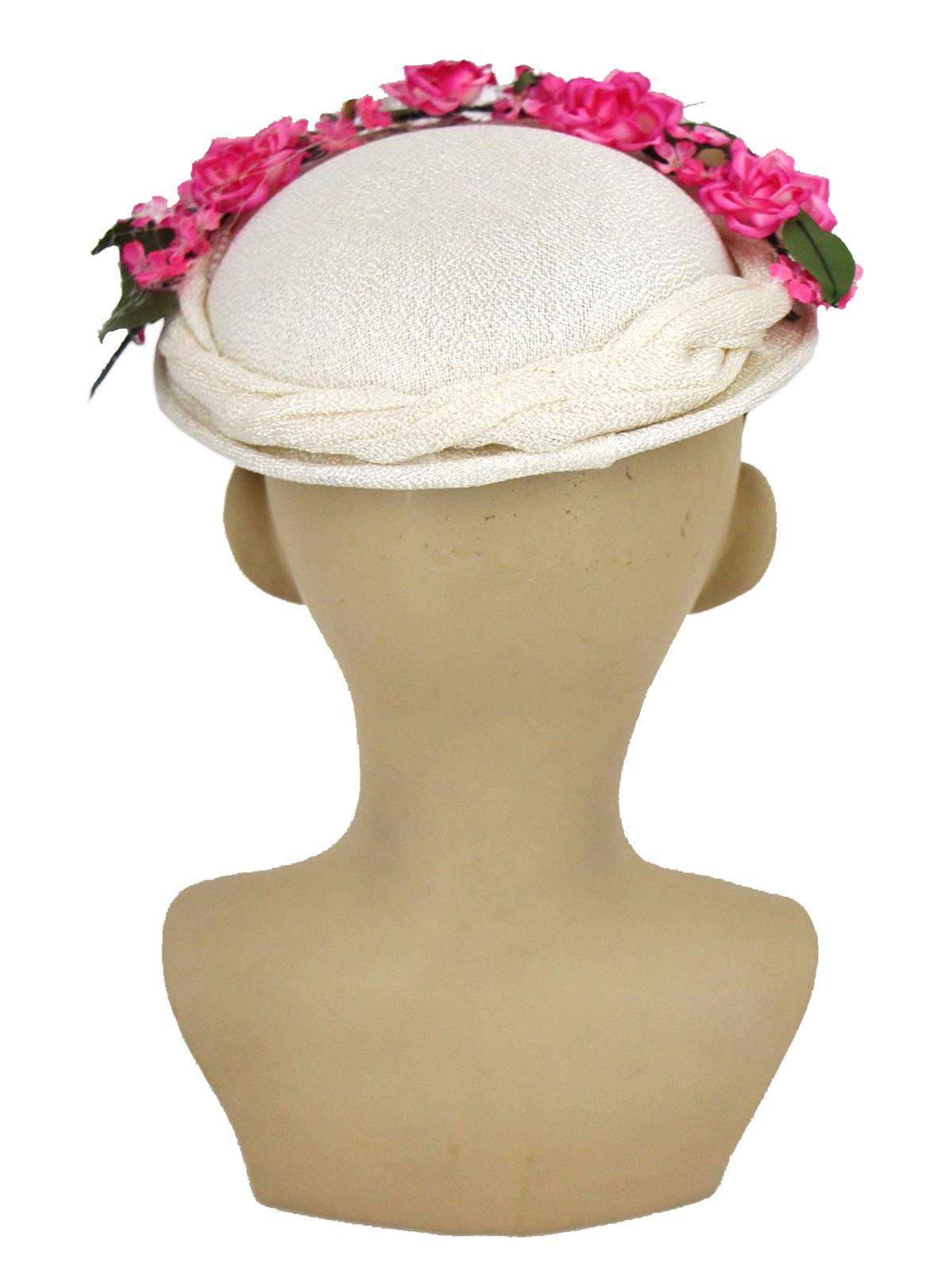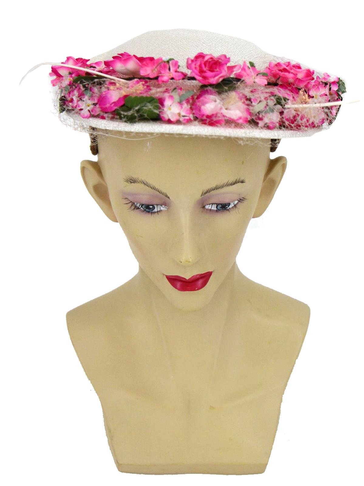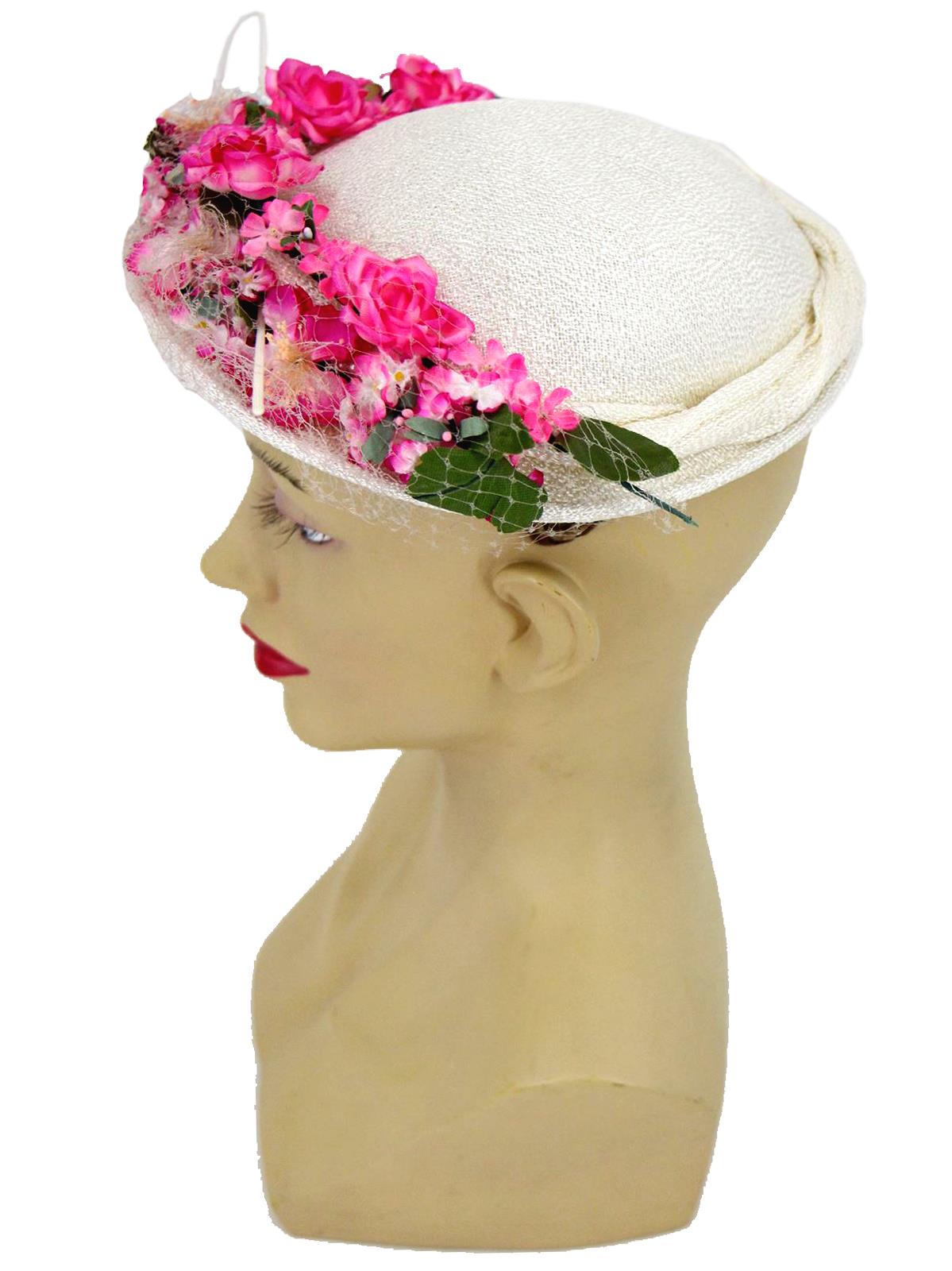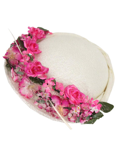 This true vintage floral hat is a great vintage find. The hat is a shallow shape, decorated with a swathe of vibrant pink flowers and some small branches and leaves, as well as a white strike-through quill. A striking choice to complete your fifties outfit, with whimsical charm.