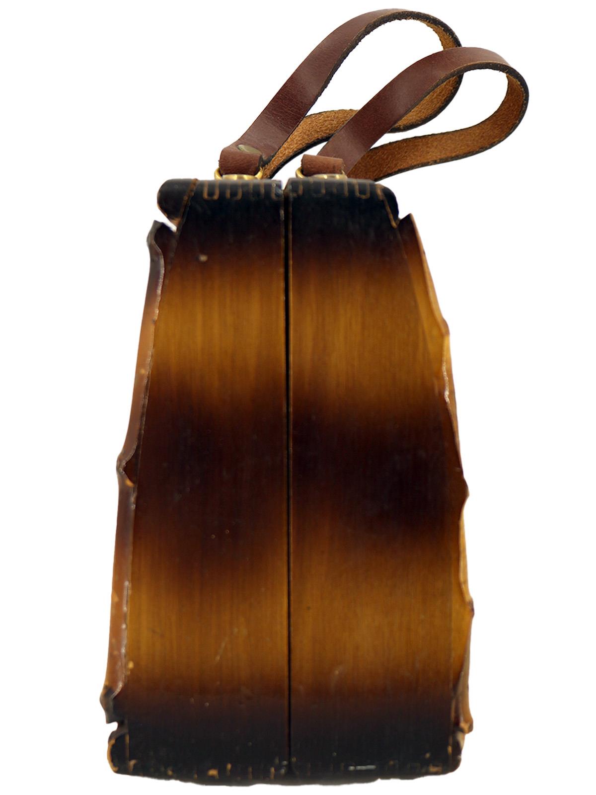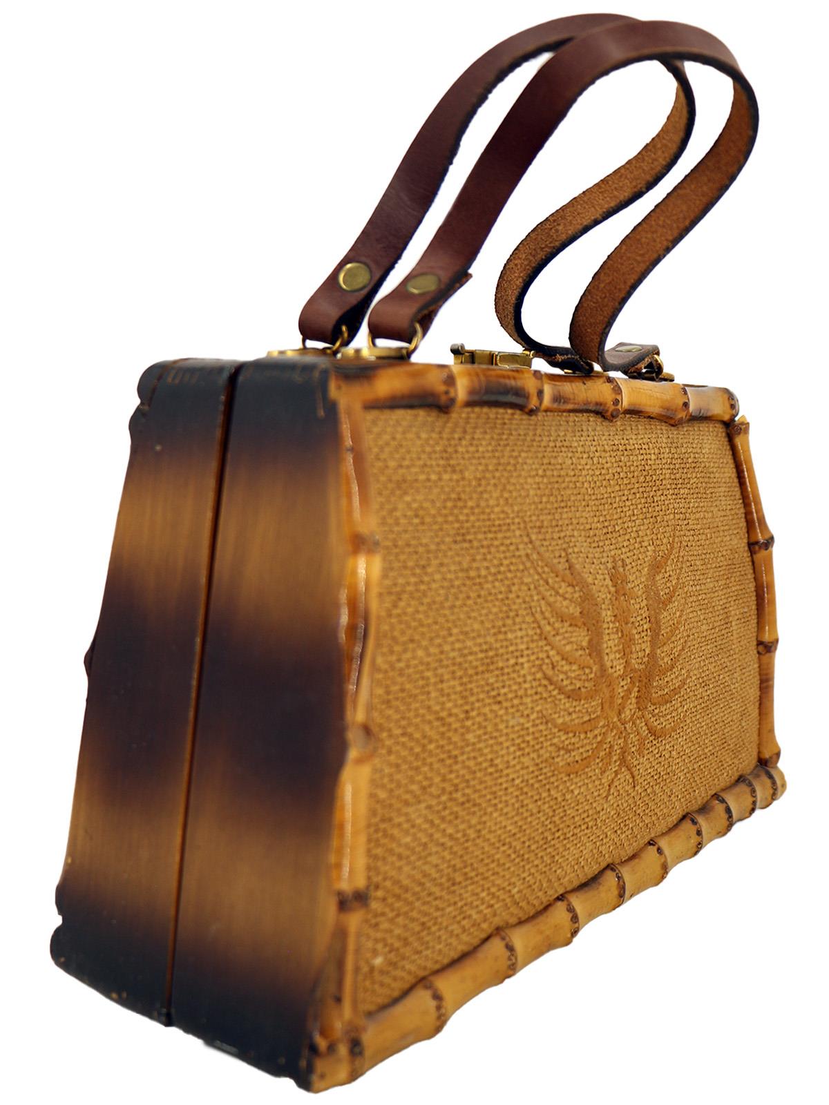 This bamboo wood box bag is a rare fifties find. The body of the bag is made of wood, while the front and back panels are made of woven burlap, the front featuring an ornate crest design. The bag is accented with leather handles and gold hardware that complete the beachside or "tiki" vibe.