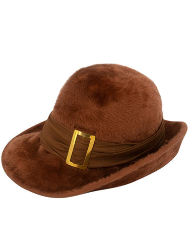 Jaunty soft brown hat with a fabric hatband. Decorated with a gold front buckle.