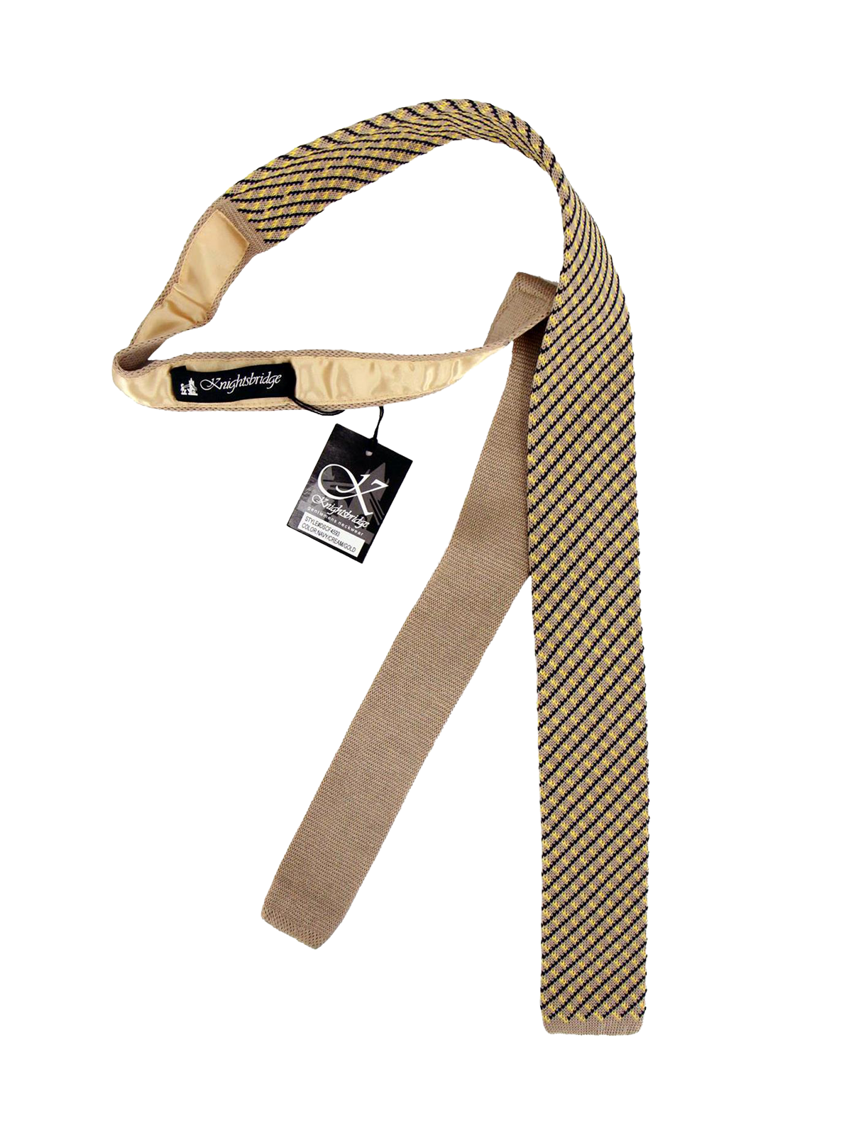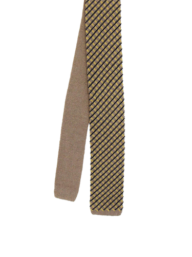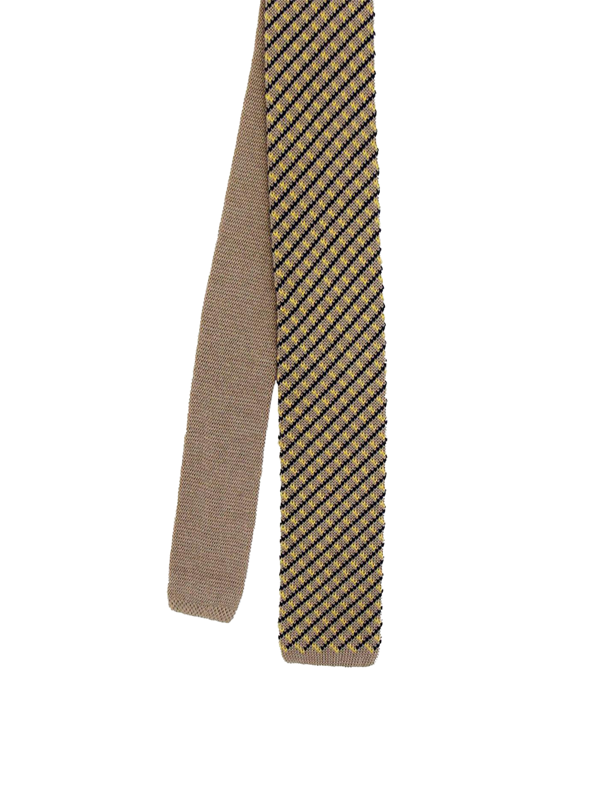 A 1960s inspired slim tie in knitted pure silk, featuring an attractive beige, yellow, and black check. Finished with a satin lining at the back neck for added comfort and durability.