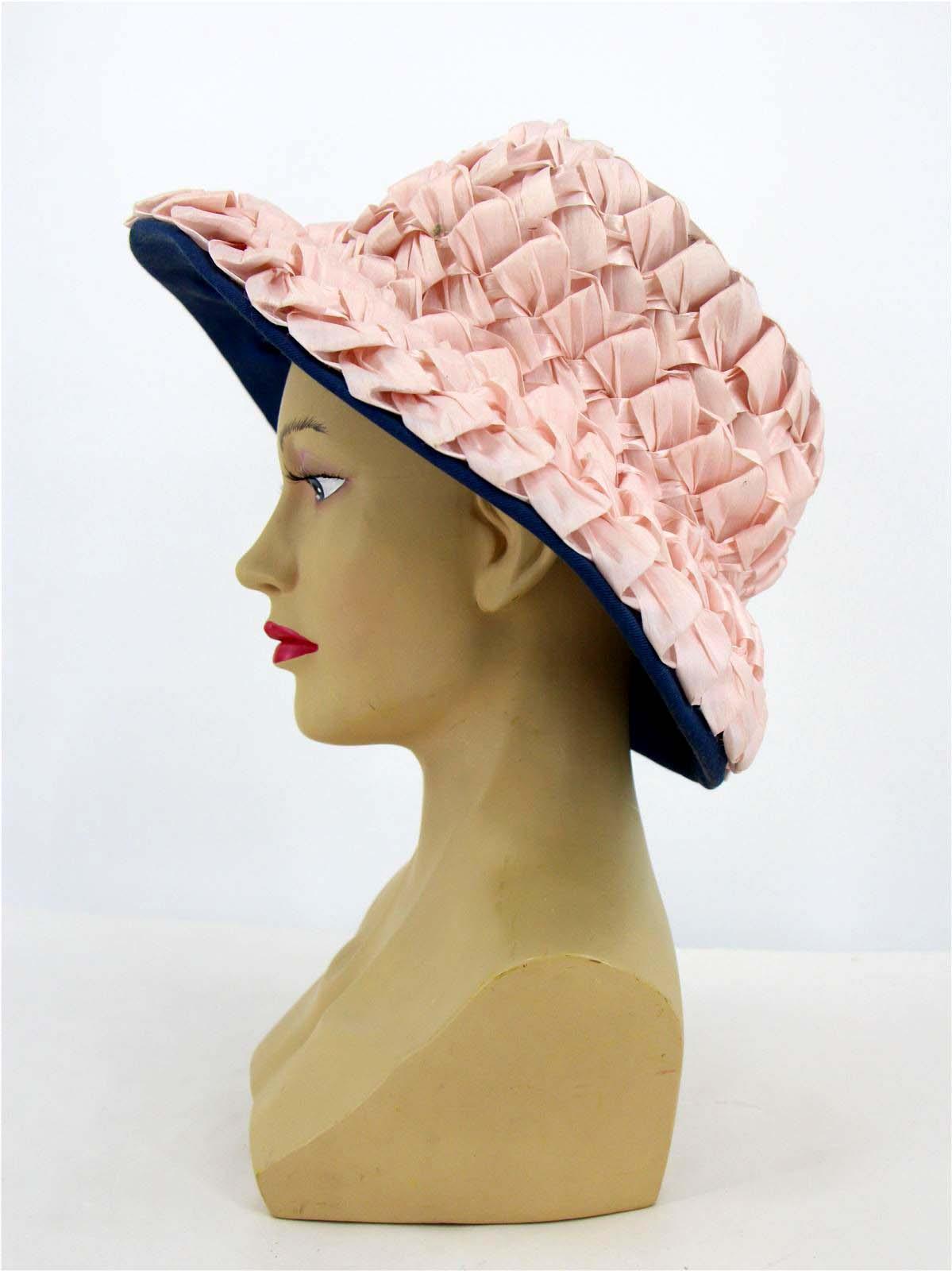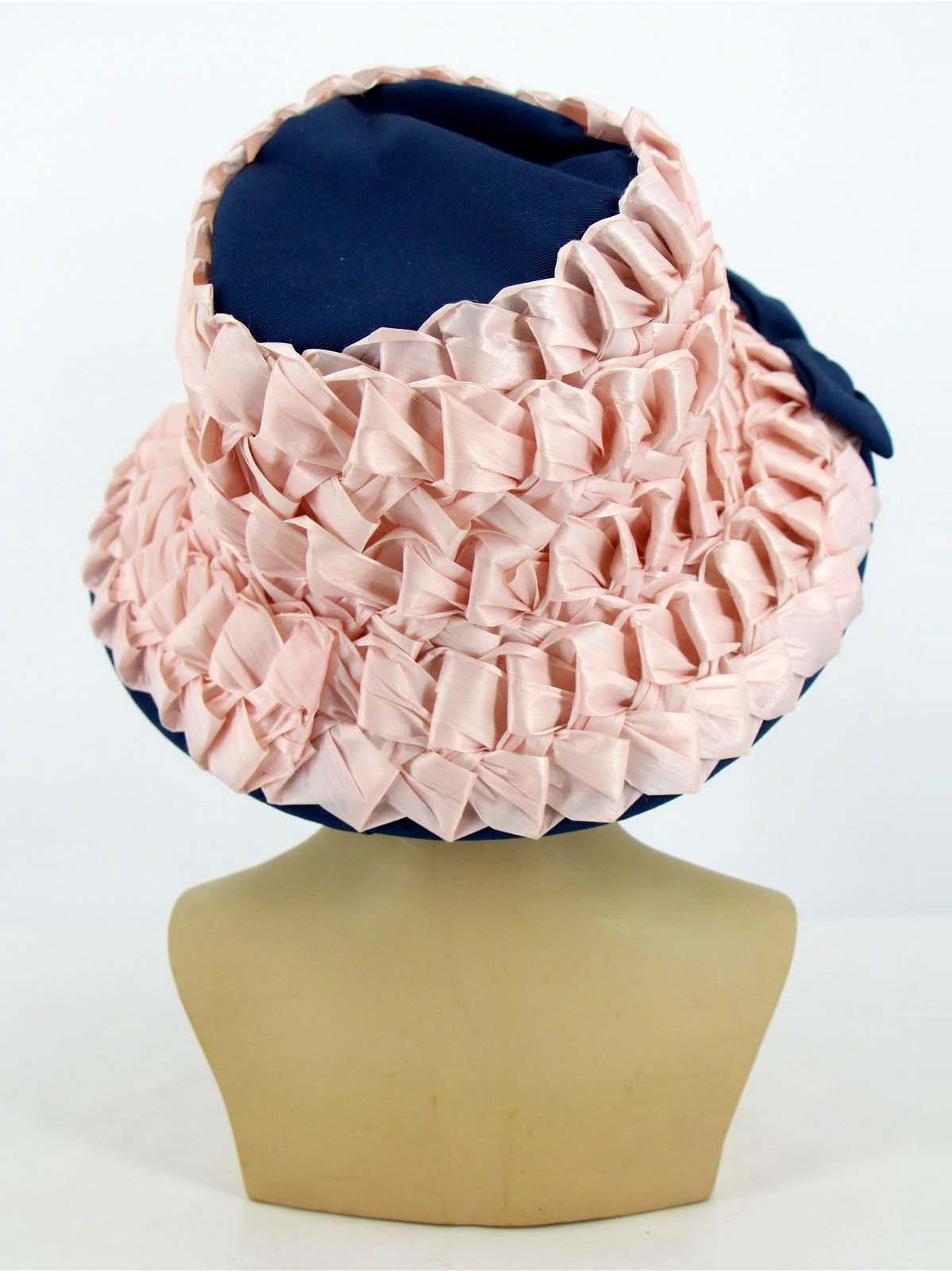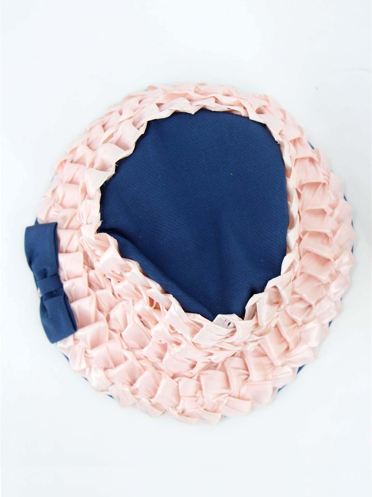 This charming original sixties vintage hat is made of a blue grosgrain fabric, with pink raffia weaved across the brim and crown.