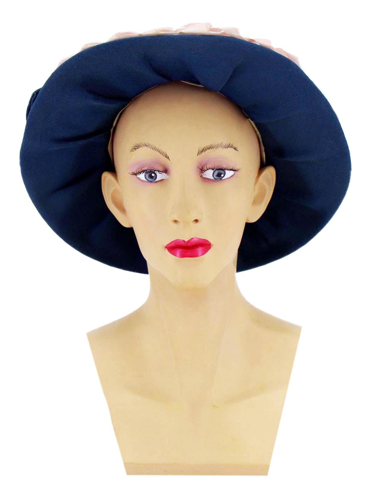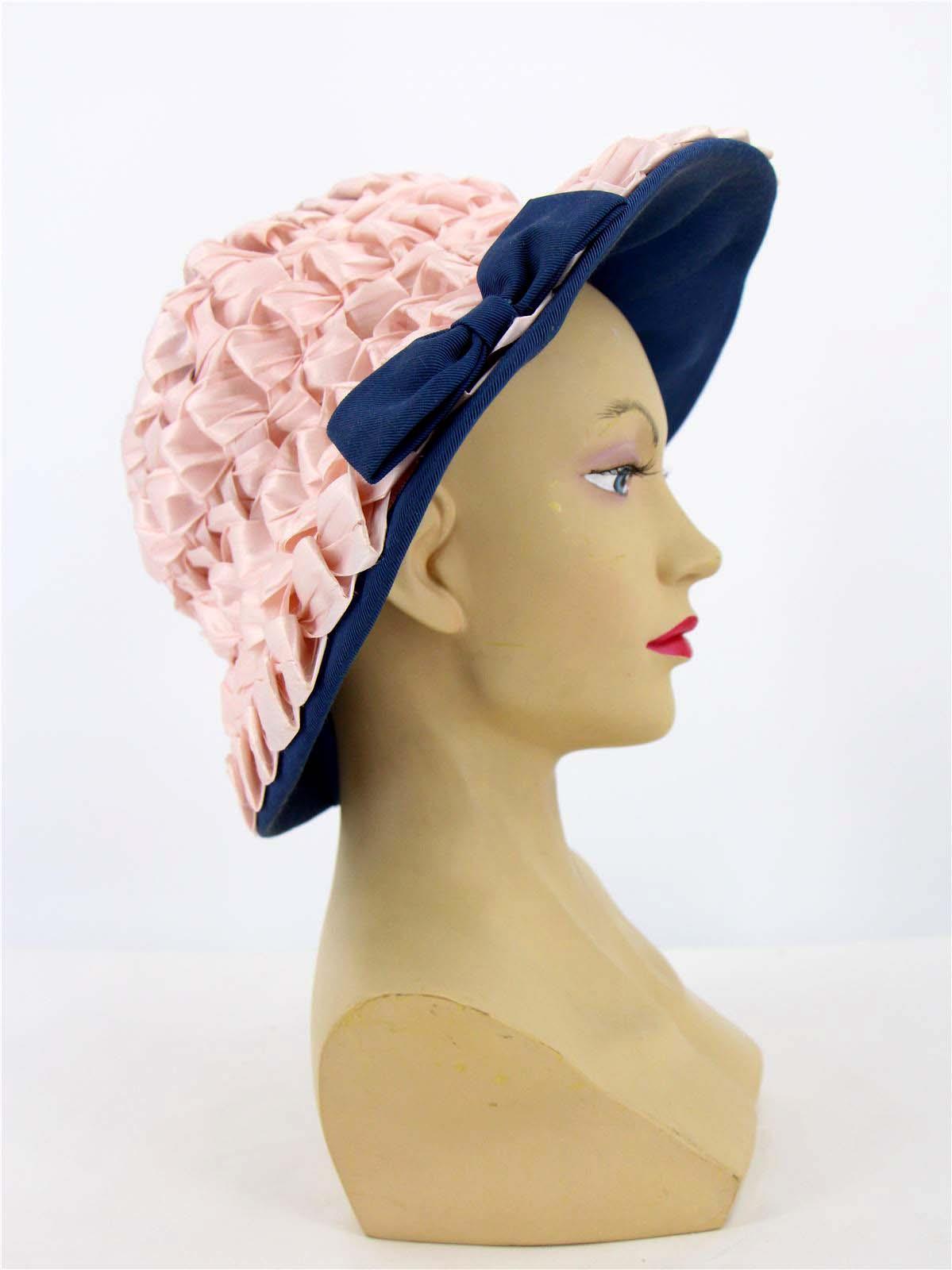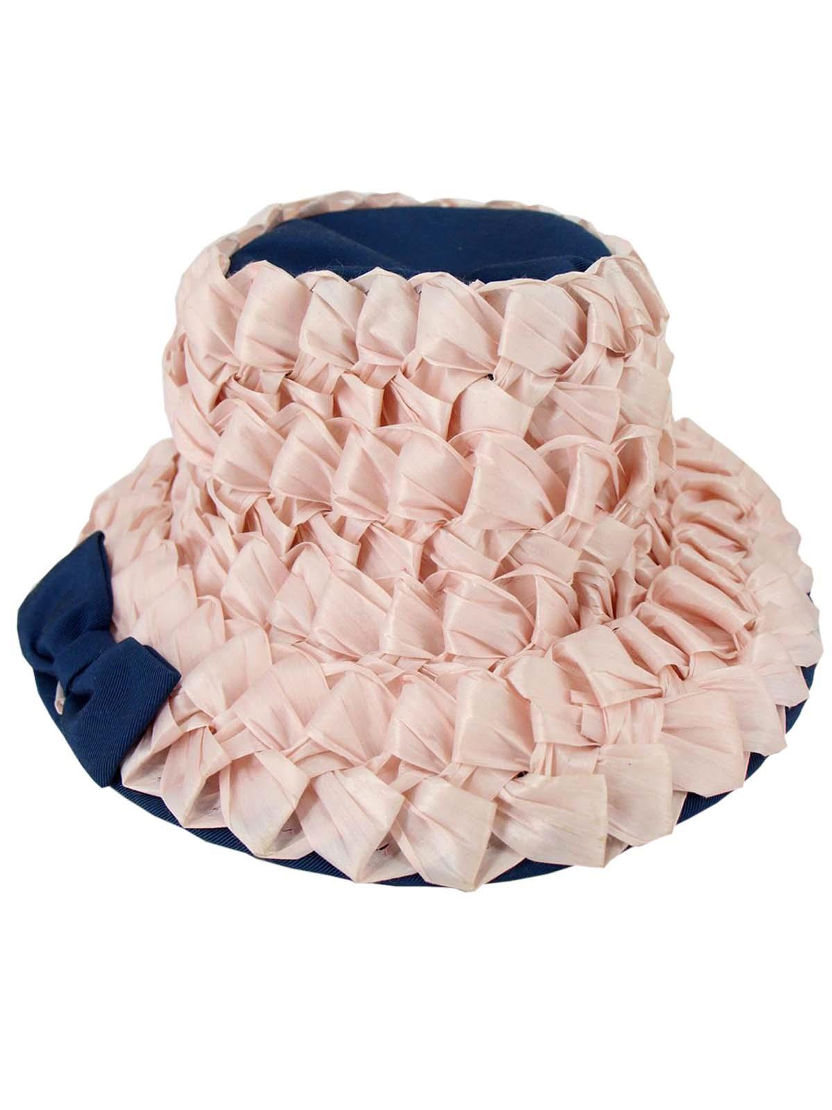 This charming original sixties vintage hat is made of a blue grosgrain fabric, with pink raffia weaved across the brim and crown.