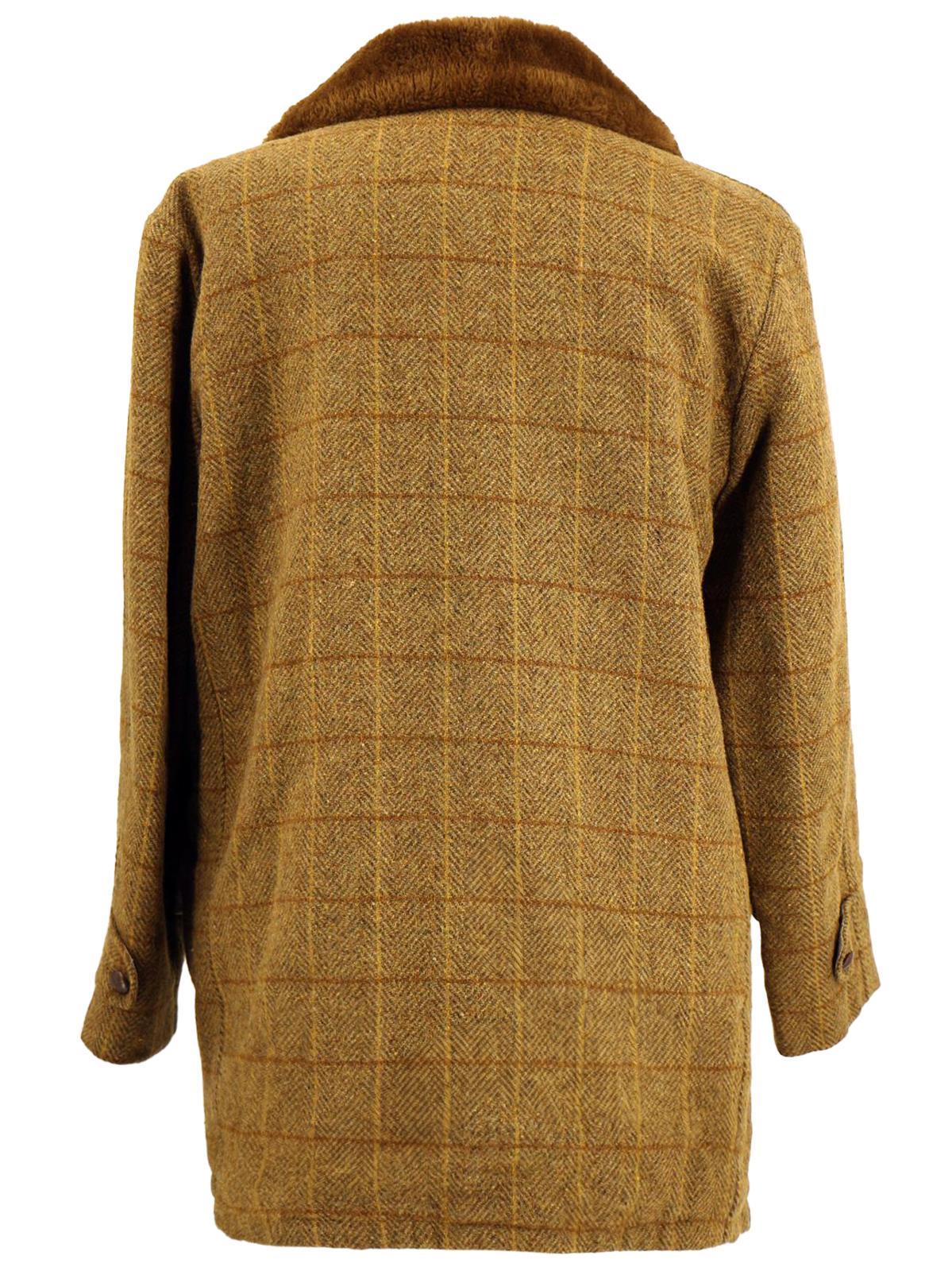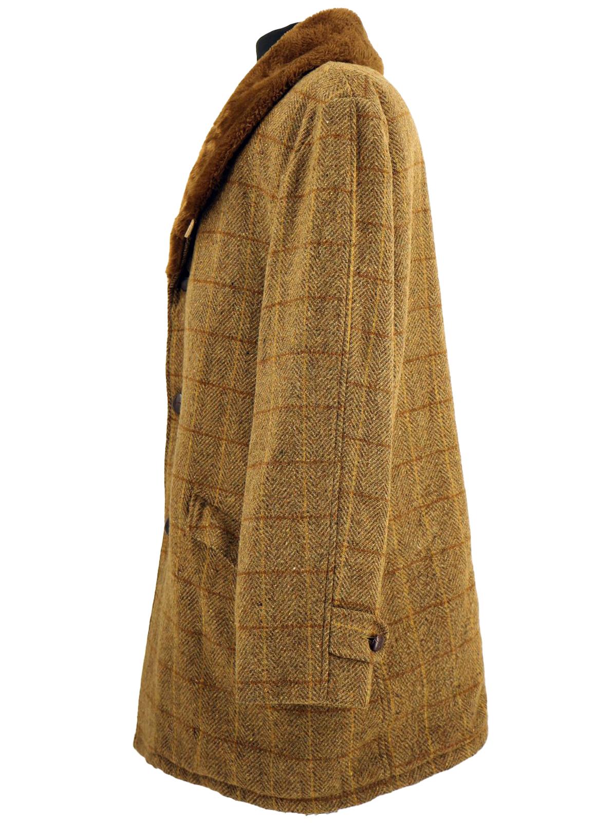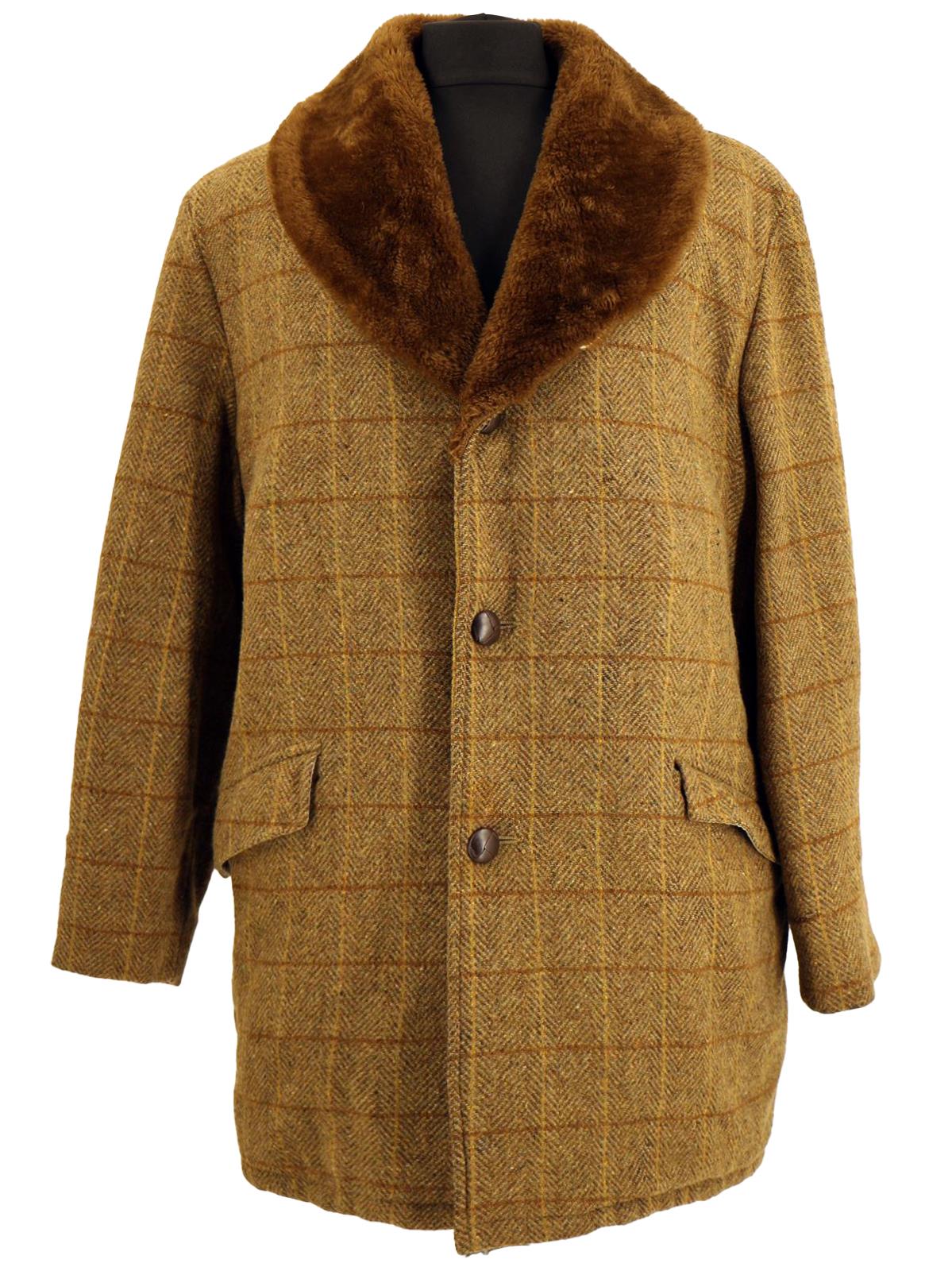 This sixties era vintage sport coat is a classic country green shade, is fastened with three large buttons and features a wide faux fur collar.