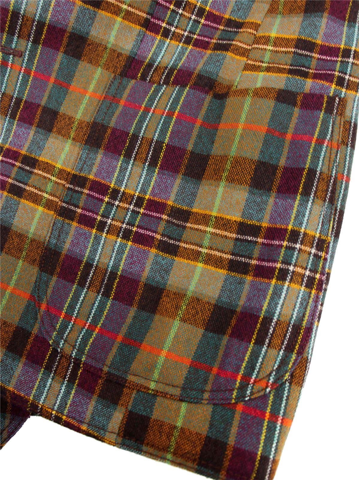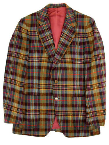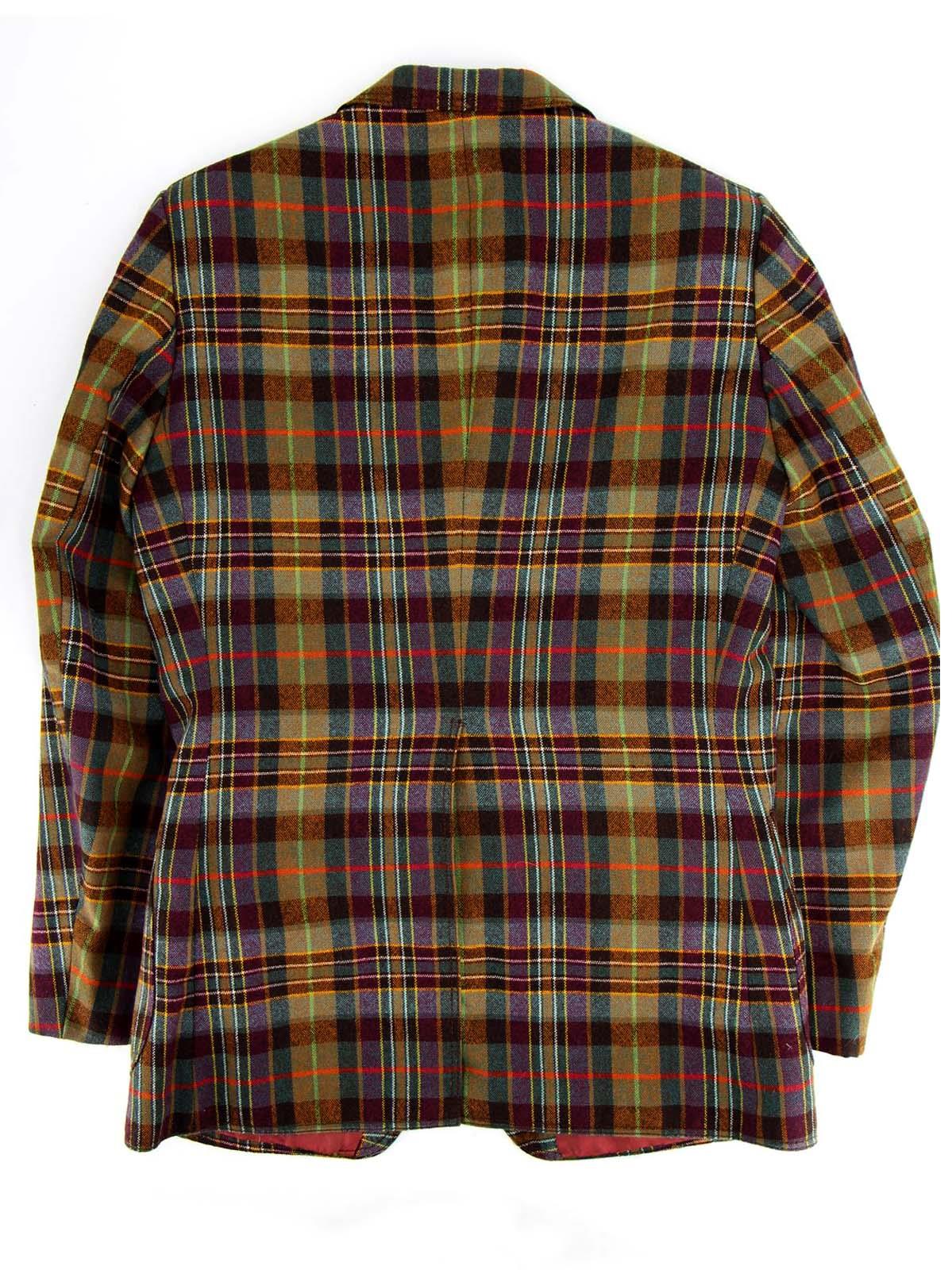 This true vintage blazer is a unique find. Its iconically 70s wool blend fabric features a bright and striking check, with hues of green, purple, red and yellow in its pattern.