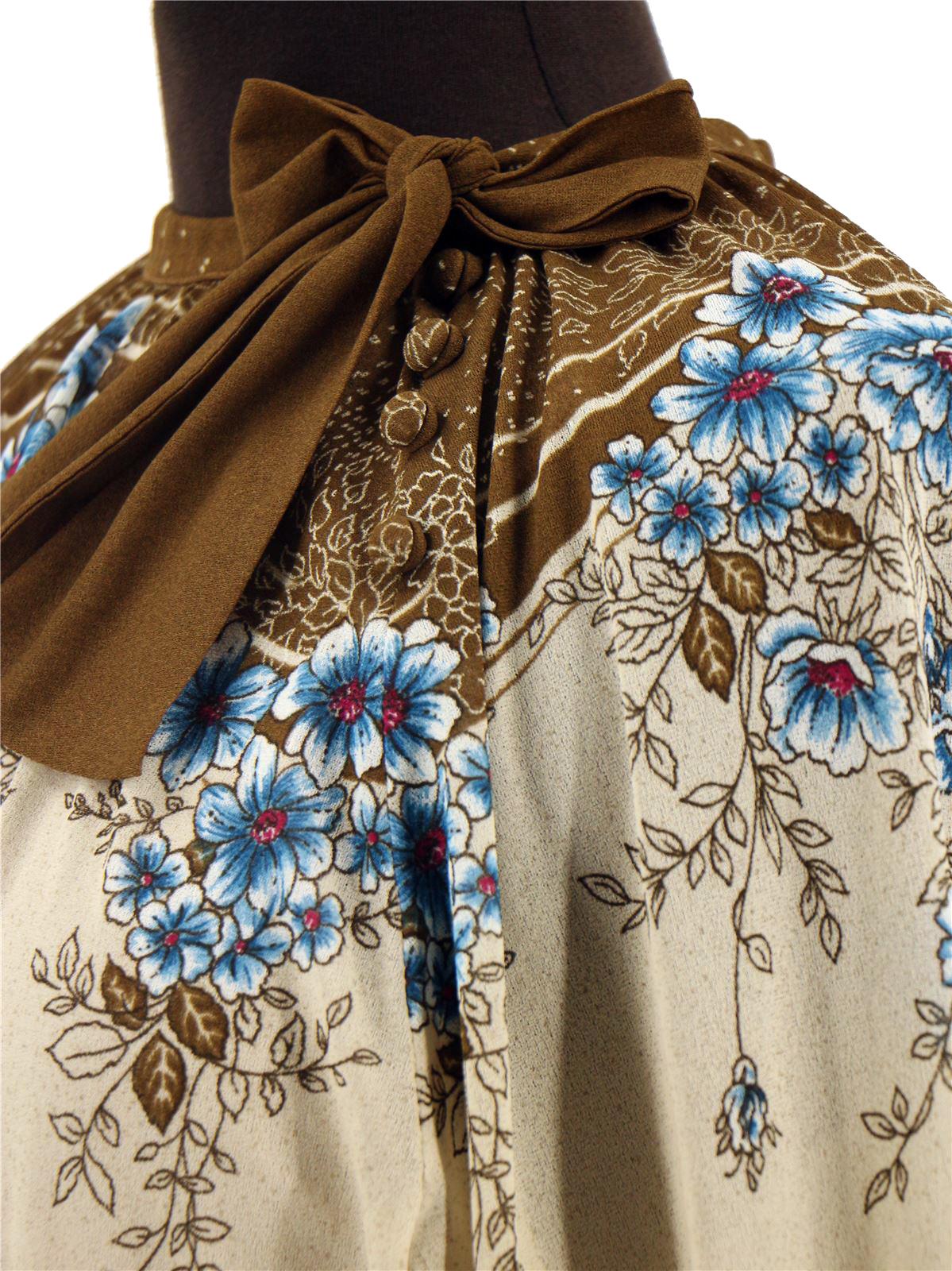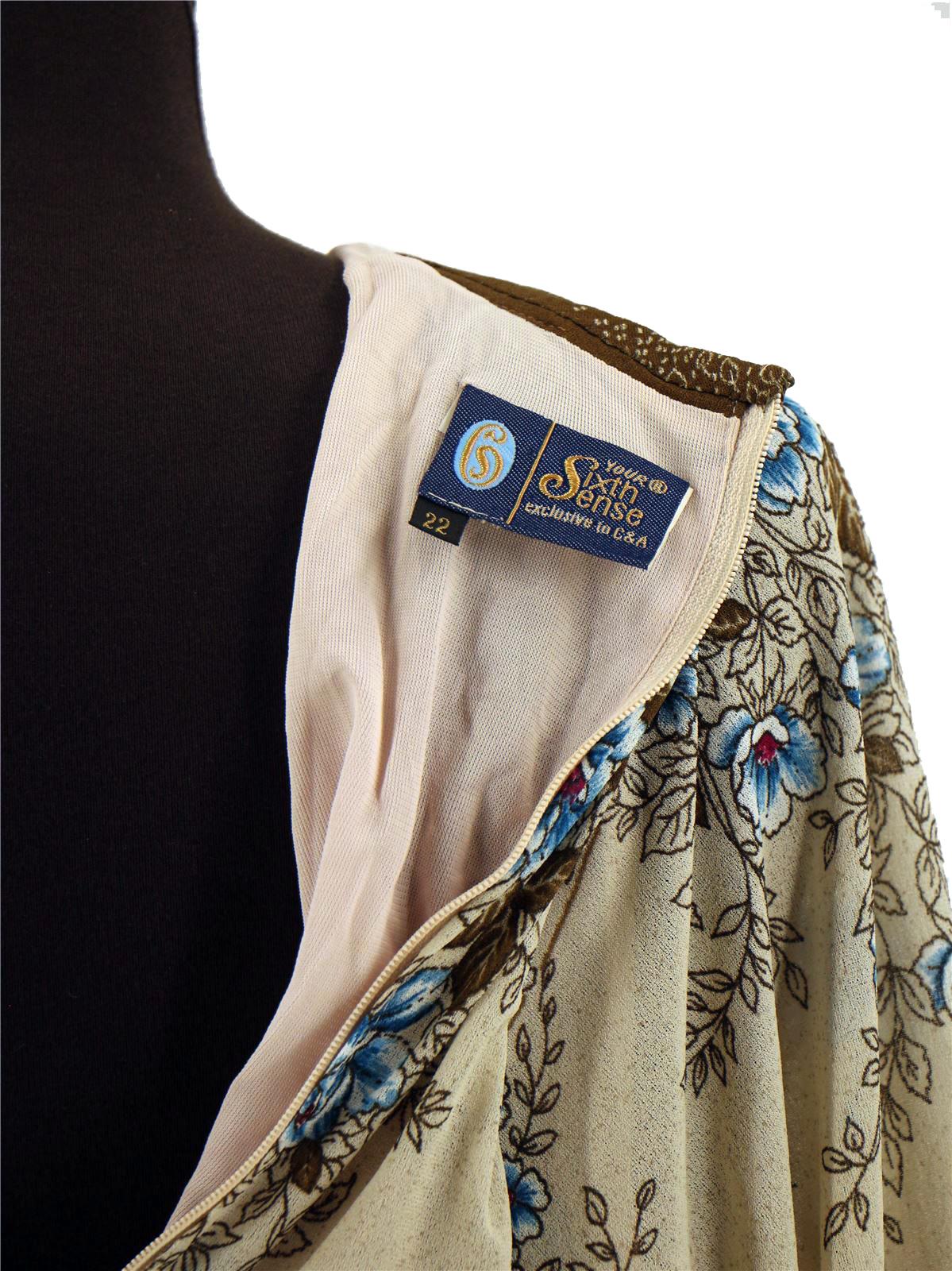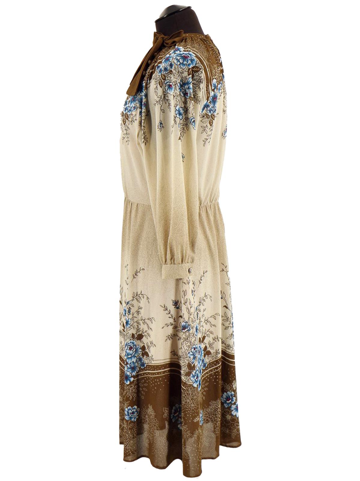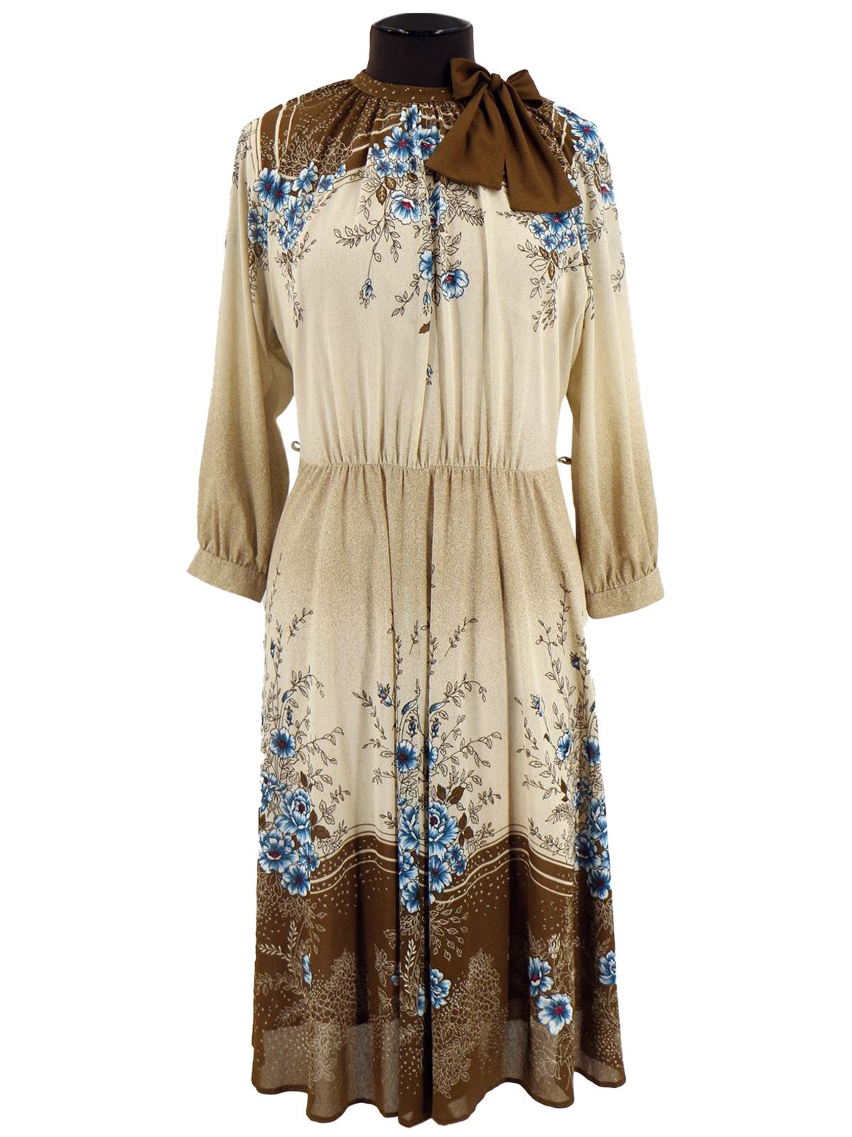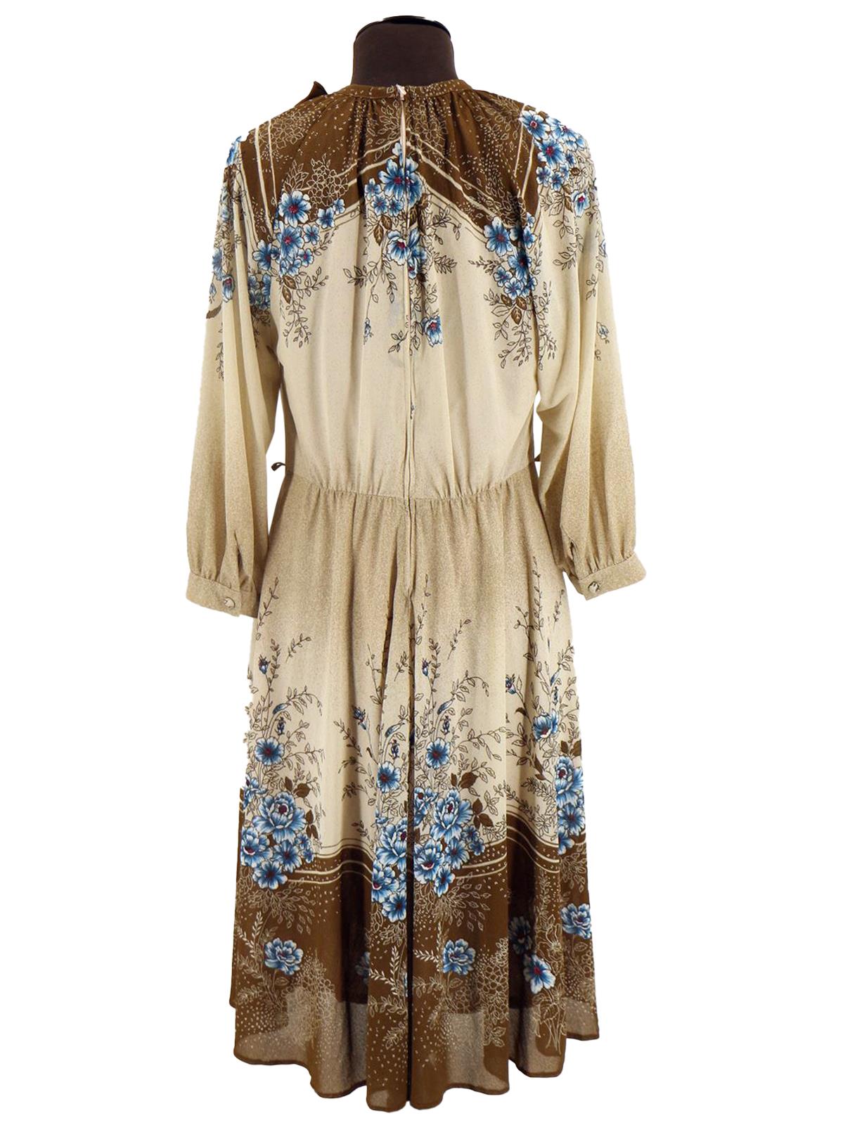 This true vintage C&A dress is made from a neutral-colour synthetic fabric with chocolate brown features and a blue floral pattern.