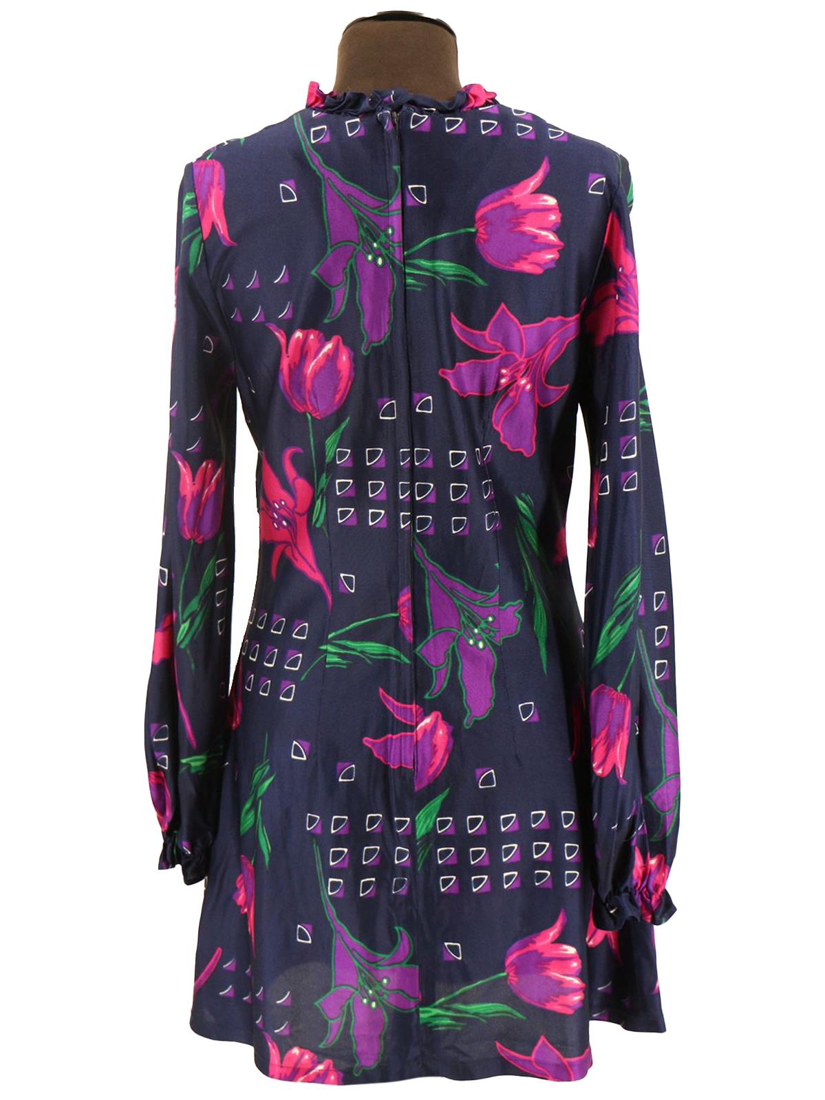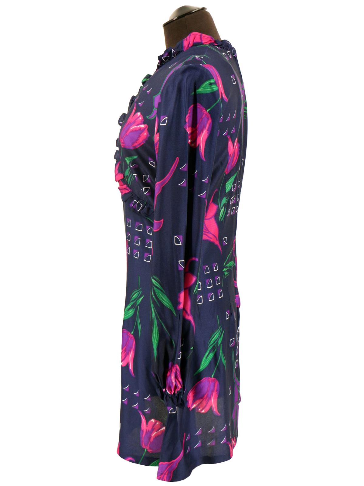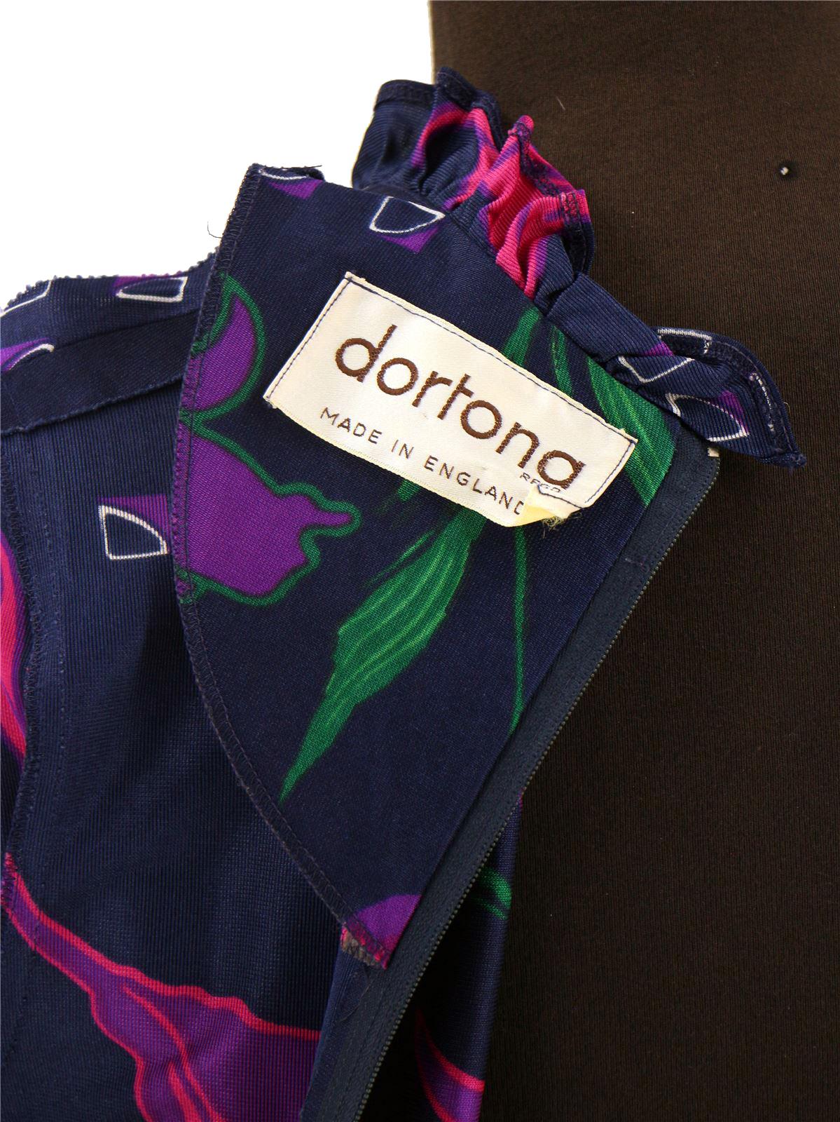 This Dortona label dress is made from synthetic, easy-case fabric realised in navy with pink and purple florals.