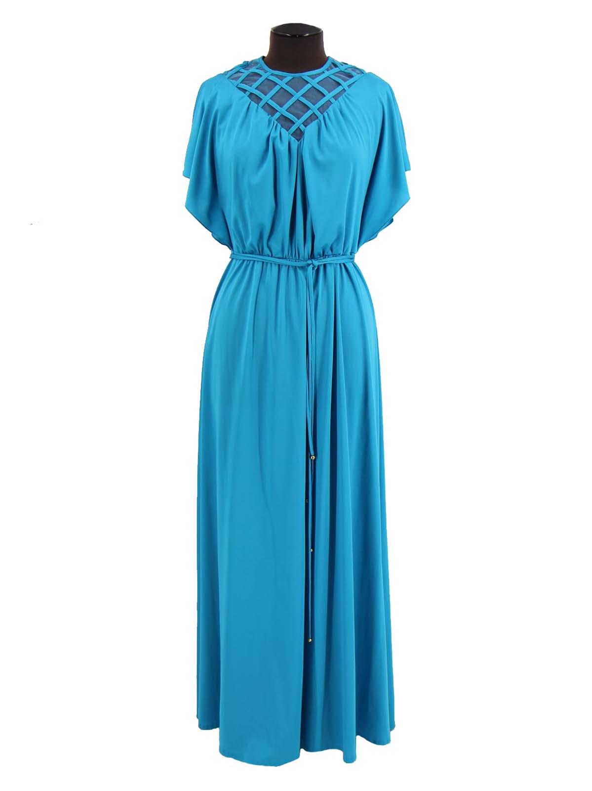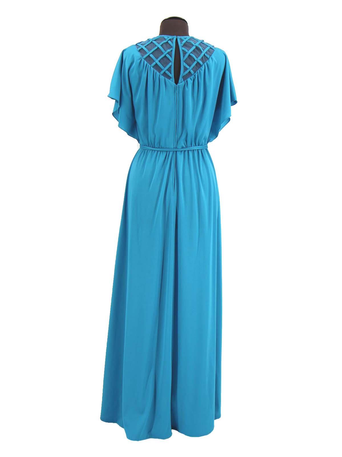 This stunning teal blue maxi dress has a semi-sheer panel across the bodice that is adorned with self-fabric lattice patterning. Such a great unique detail.
