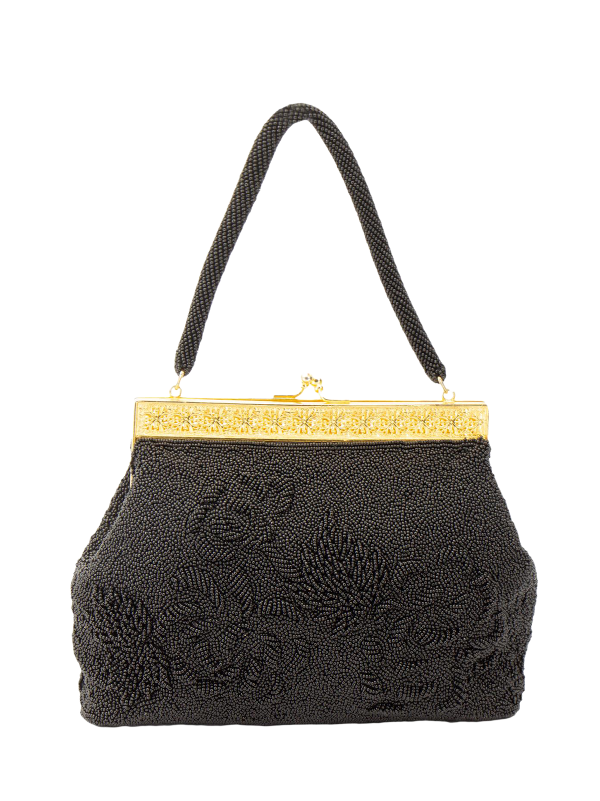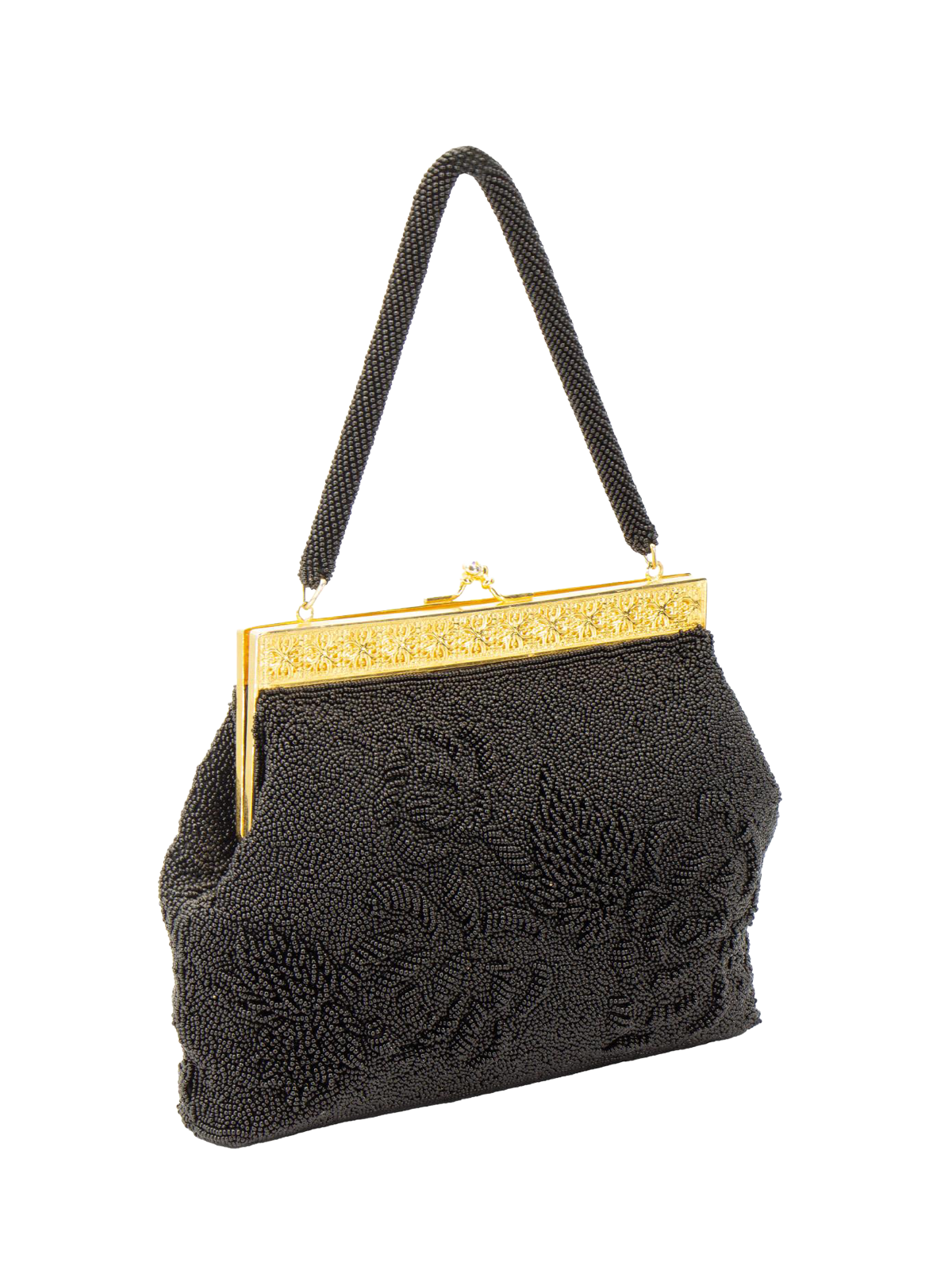 An exquisite original 1940s occasion handbag, richly encrusted with beads for a striking layered 3D effect. Finished with a pretty fretwork gold frame, this collectable evening purse is full of vintage character and timeless glamour.