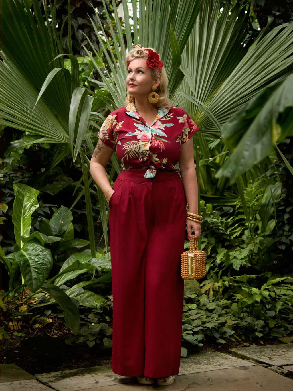 Versatile vintage look wide Palazzo pants in a plain dark red. Easy to wear vintage-inspired charm. A versatile staple that is a great transitional piece to take you from day to evening way in a jiffy with a simple switch of tops and accessories.