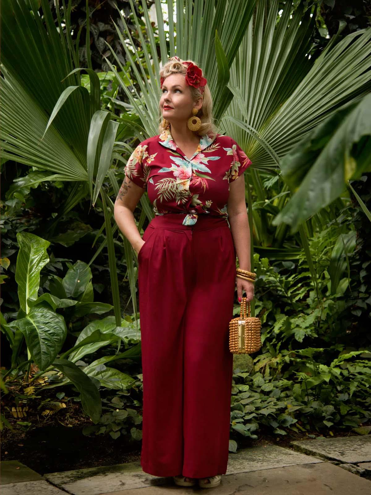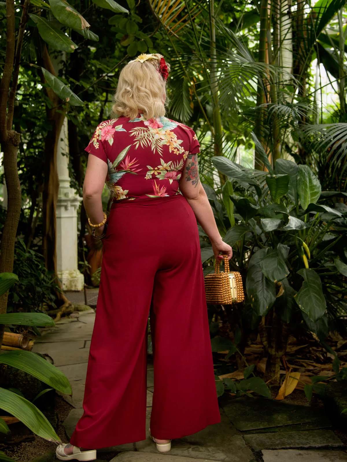 Versatile vintage look wide Palazzo pants in a plain dark red. Easy to wear vintage-inspired charm.  A versatile staple that is a great transitional piece to take you from day to evening way in a jiffy with a simple switch of tops and accessories.