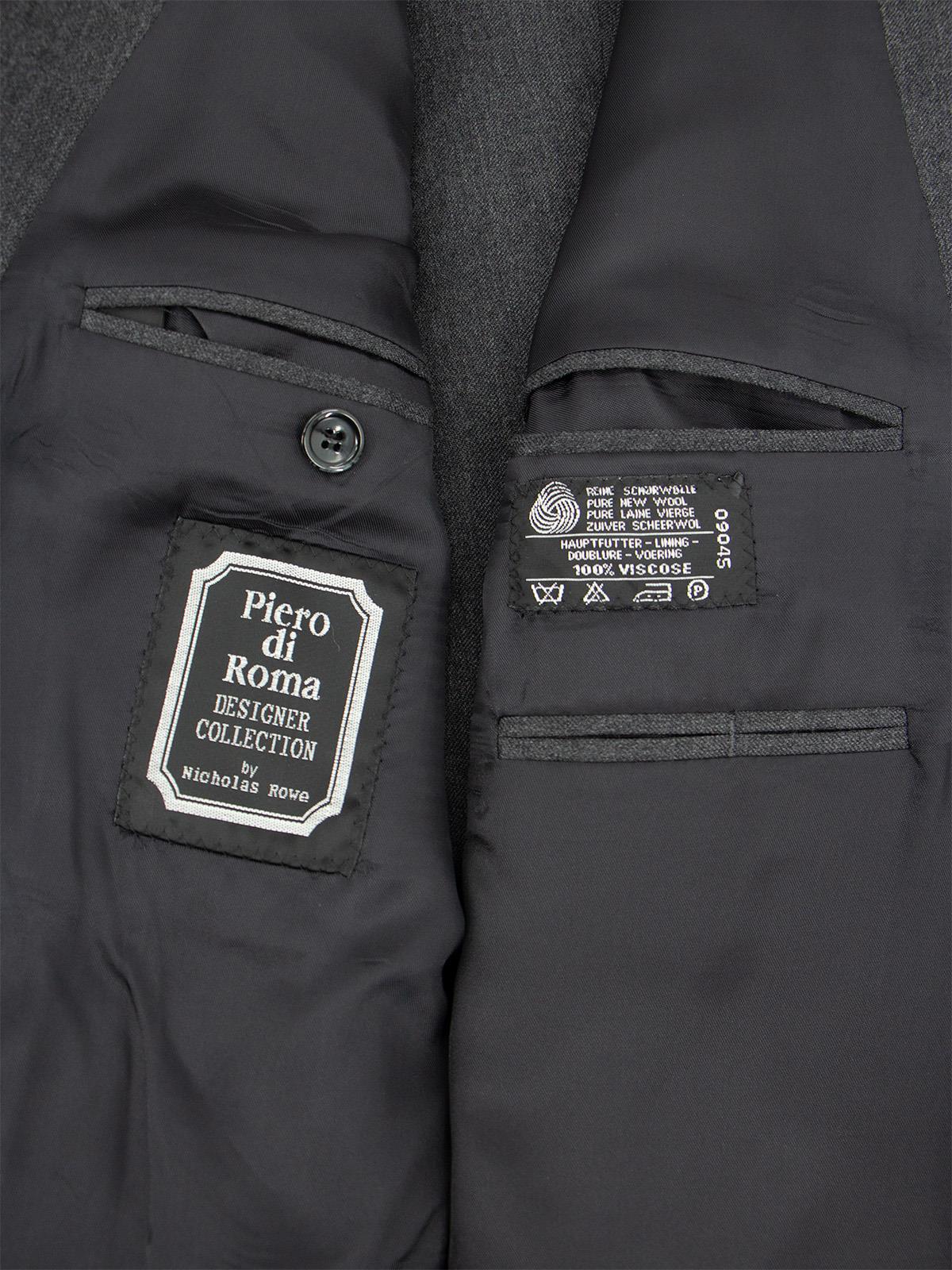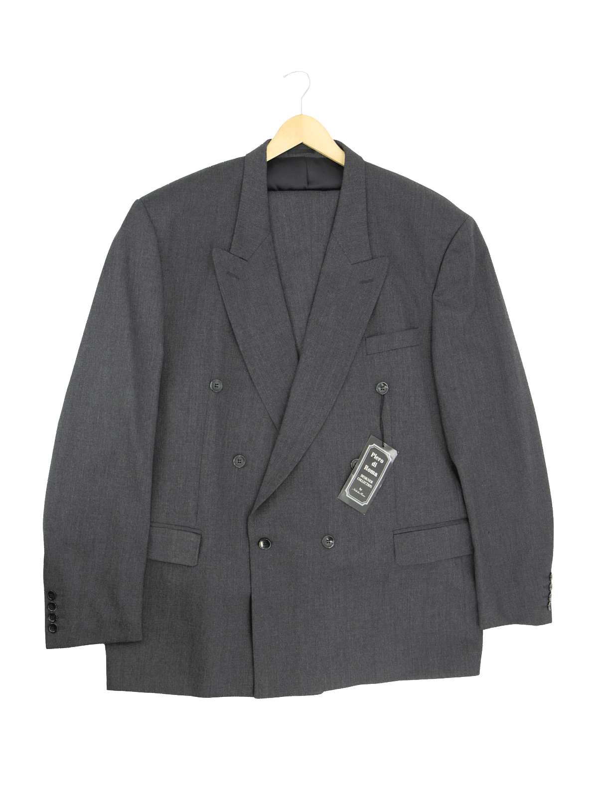Original 1990s vintage two-piece suit in top-quality 100% wool charcoal grey cloth, tailored with a strong 1940s-inspired silhouette. With its sharp double-breasted cut and refined detailing, this is an excellent alternative to a classic 1940s demob suit.