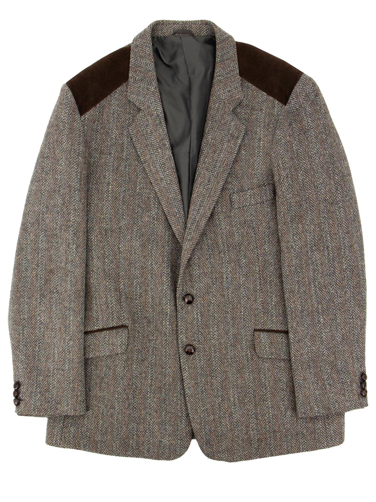 Original herringbone wool tweed jacket with suede shoulder yokes and pocket.